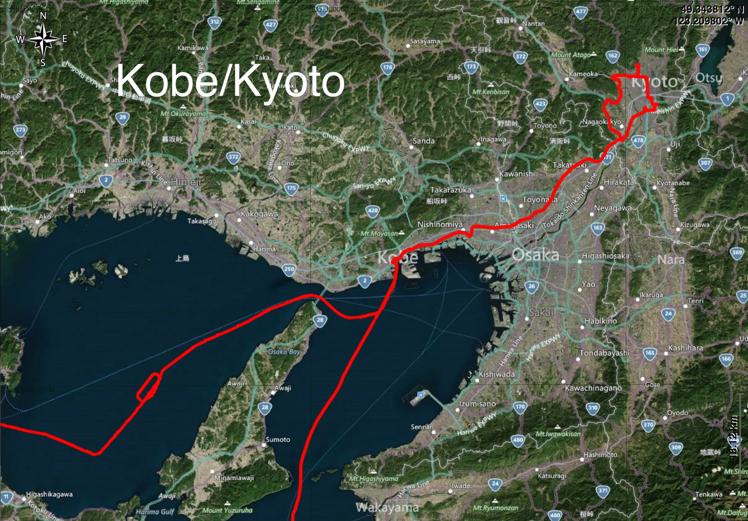 The truth of it all, is that Kobe, Kyoto and indeed Osaka are really just one enormous city, much like so many of the giant metropolises around the world. Individual small towns keep growing over the decades (or even centuries) until finally, their outskirts collide and they essentially become one. They may maintain separate local governments and services, but for all intents and purposes, they are a single entity. So by mooring in the port location of Kobe, it was a simple matter for our bus transport to easily drive from one location to another. As you can see from the maps above, drive we did…