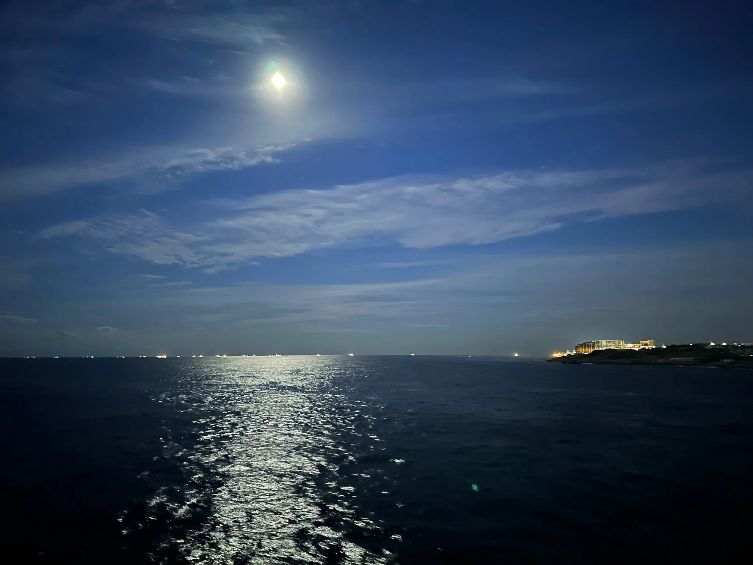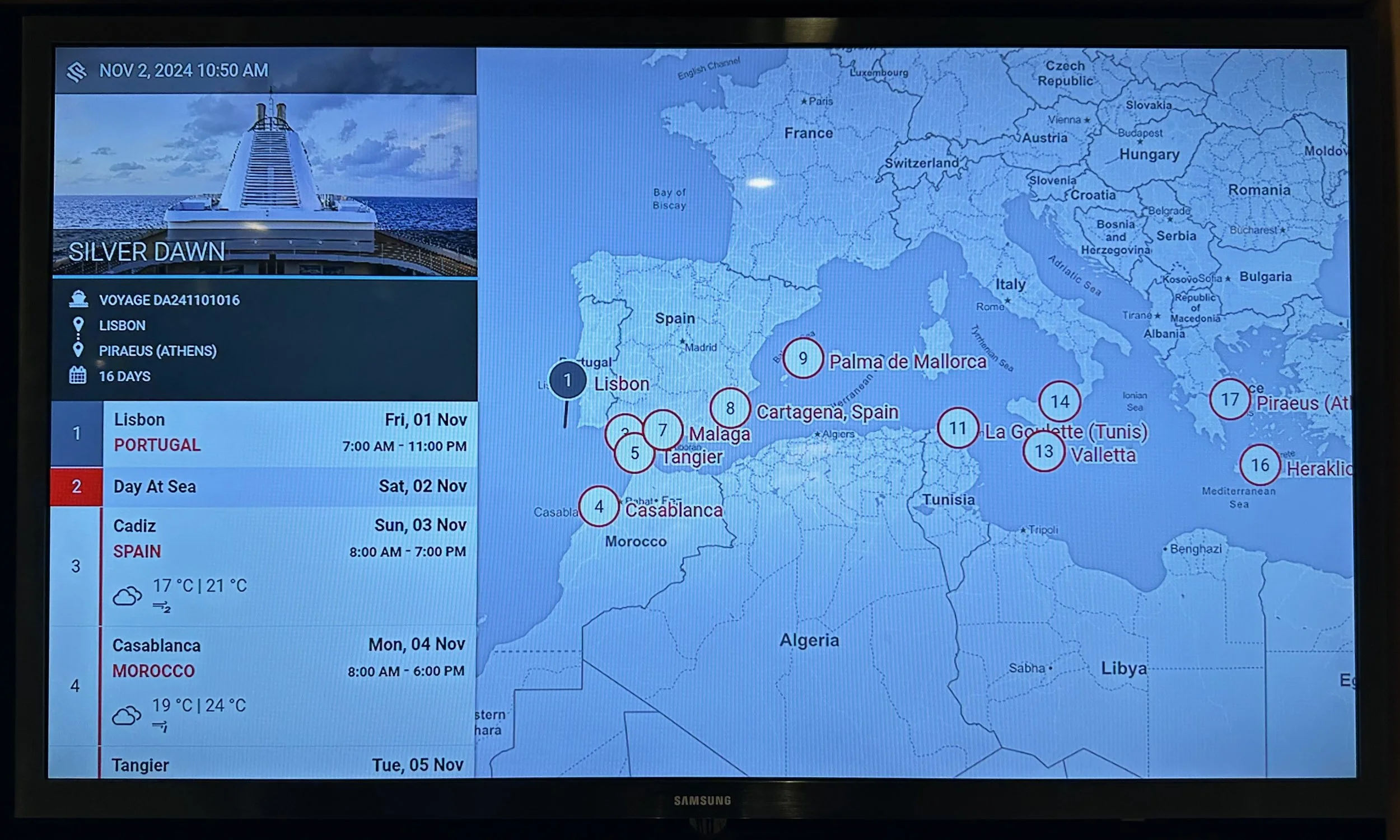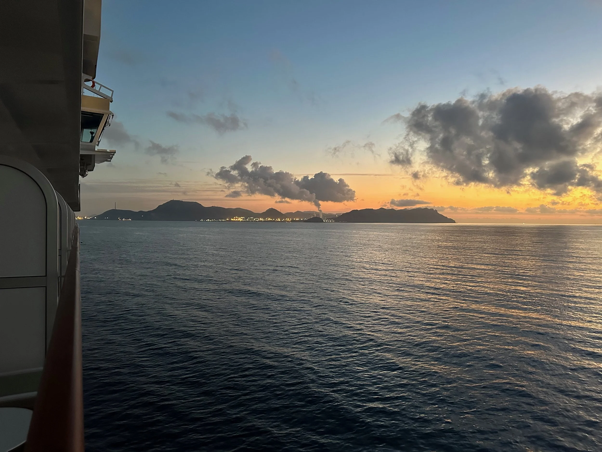 Departure from Tangier happened precisely at 6pm just as the sun was starting to set. By the time we were at dinner it was dark, and the ship was already well into the mouth of the Strait of Gibraltar. Next stop, Malaga in southern Spain.