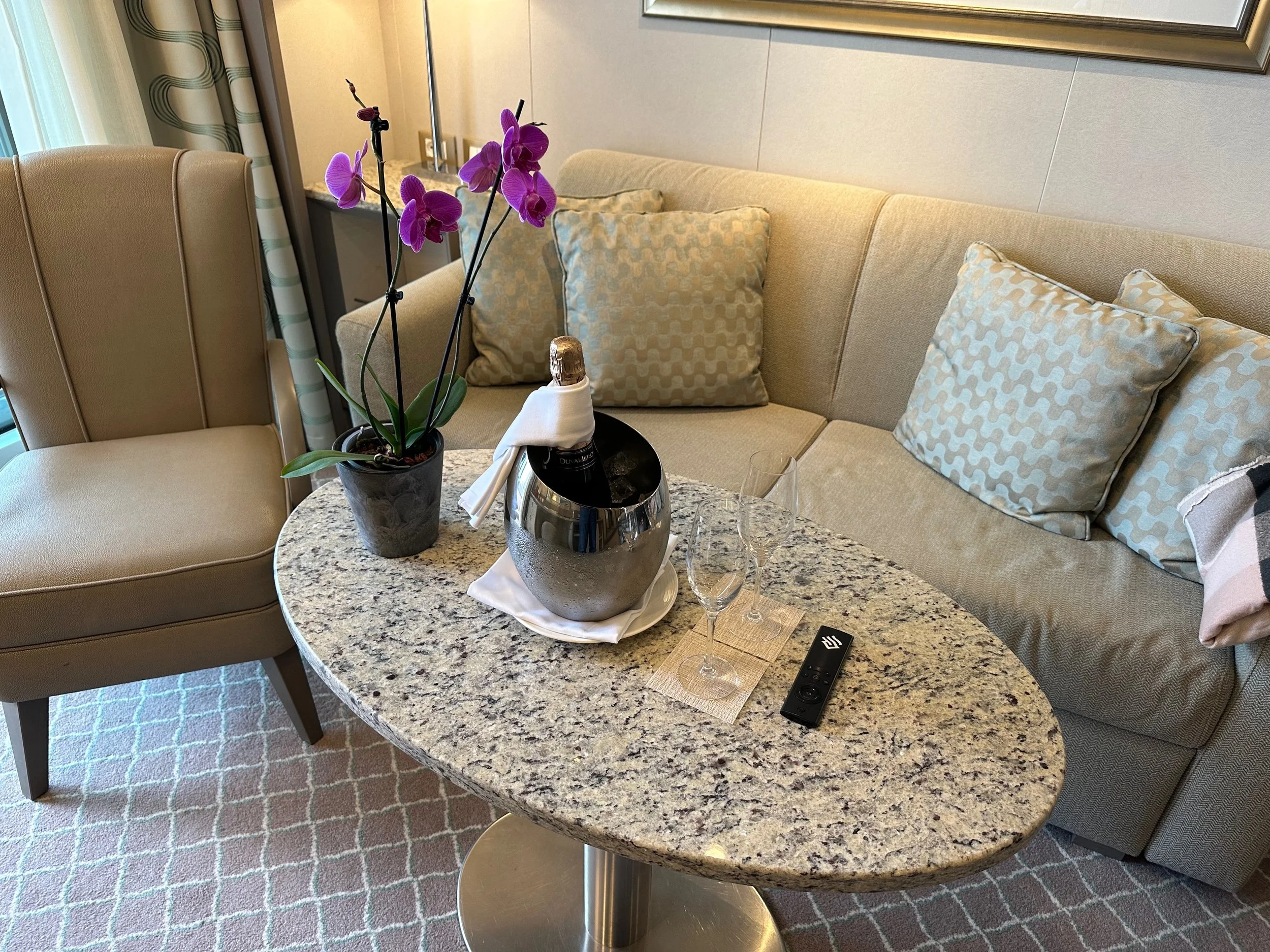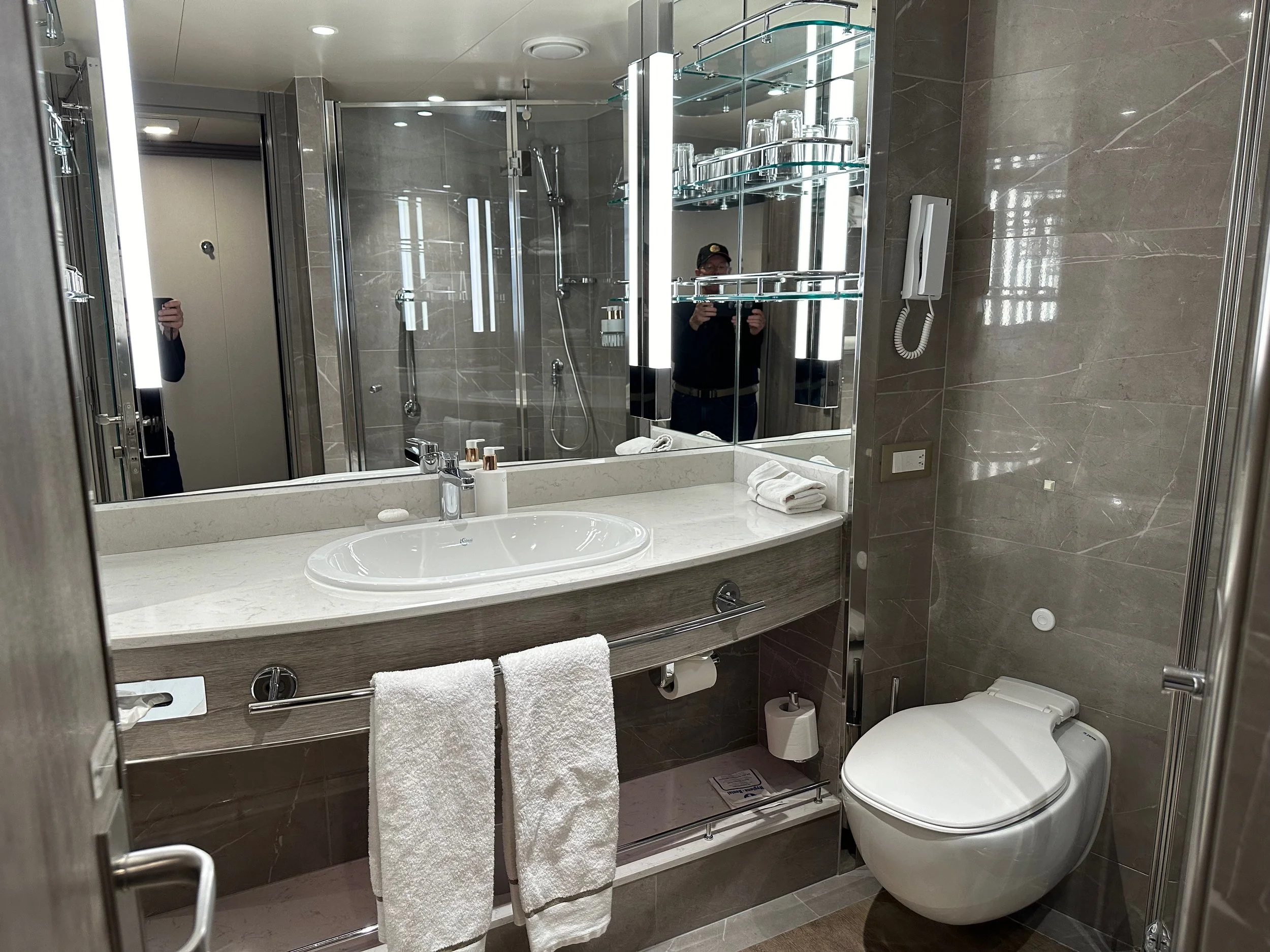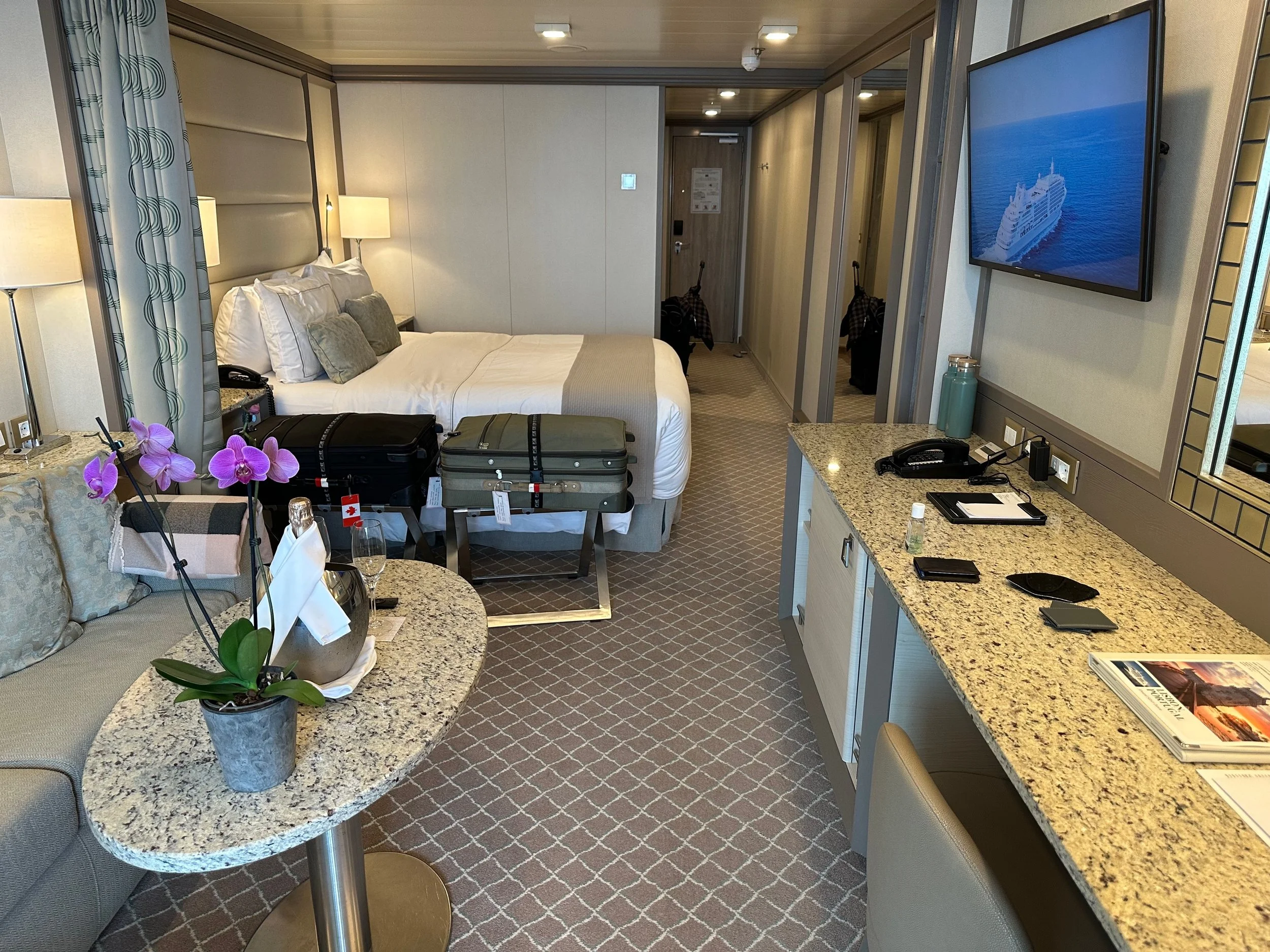 At the cruise terminal it was much like the TSA at an airport where we took our luggage, carry-on and us through a security check where everything was scanned. One complete we were checked onto the ship by the crew taking our passports and presenting each of us with a personalized identity card that we would use to enter our rooms, as well as used when leaving the ship and returning. It’s all very efficient, but does take some time as there are nearly 600 guests to check in.