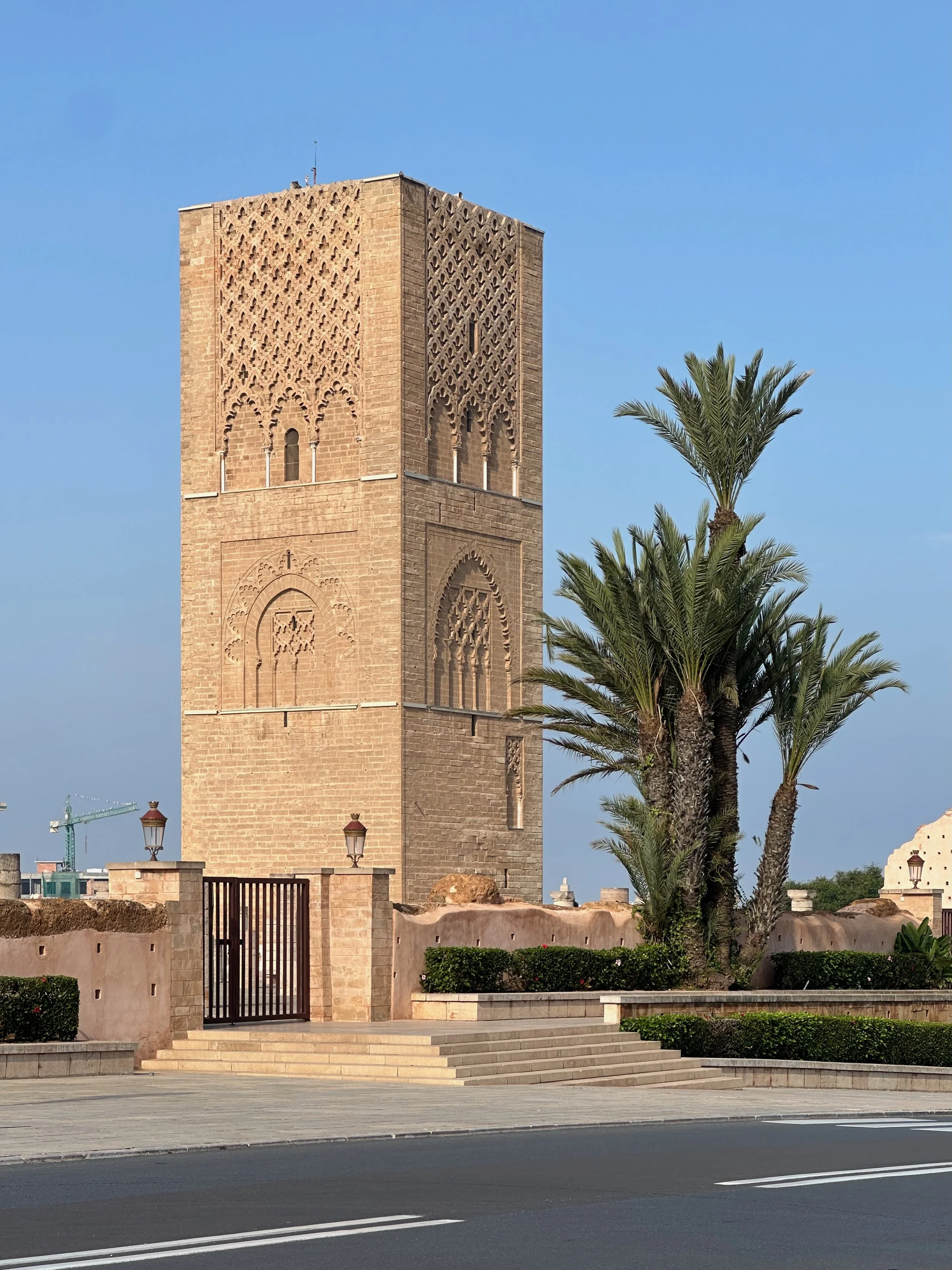 A mausoleum located across from the Hassan Tower in Rabat, Morocco, this structure contains the tombs of the Moroccan king Mohammed V and his two sons, King Hassan II and Prince Abdallah. The Hassan Tower is the minaret of a mosque that was commissioned by the third caliph of the Almohad Caliphate, near the end of the 12th century. The tower was intended to be the tallest minaret in the world, and the mosque if finished, was to be the largest in the western Muslim world. When the caliph died in 1199, construction on the mosque stopped.