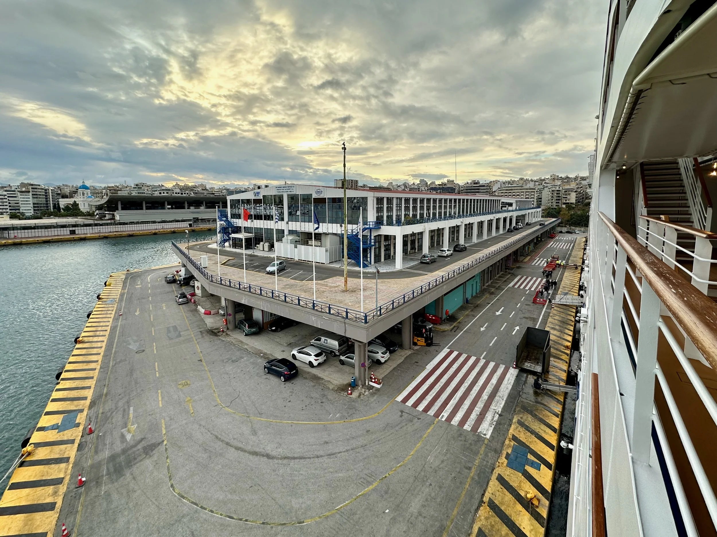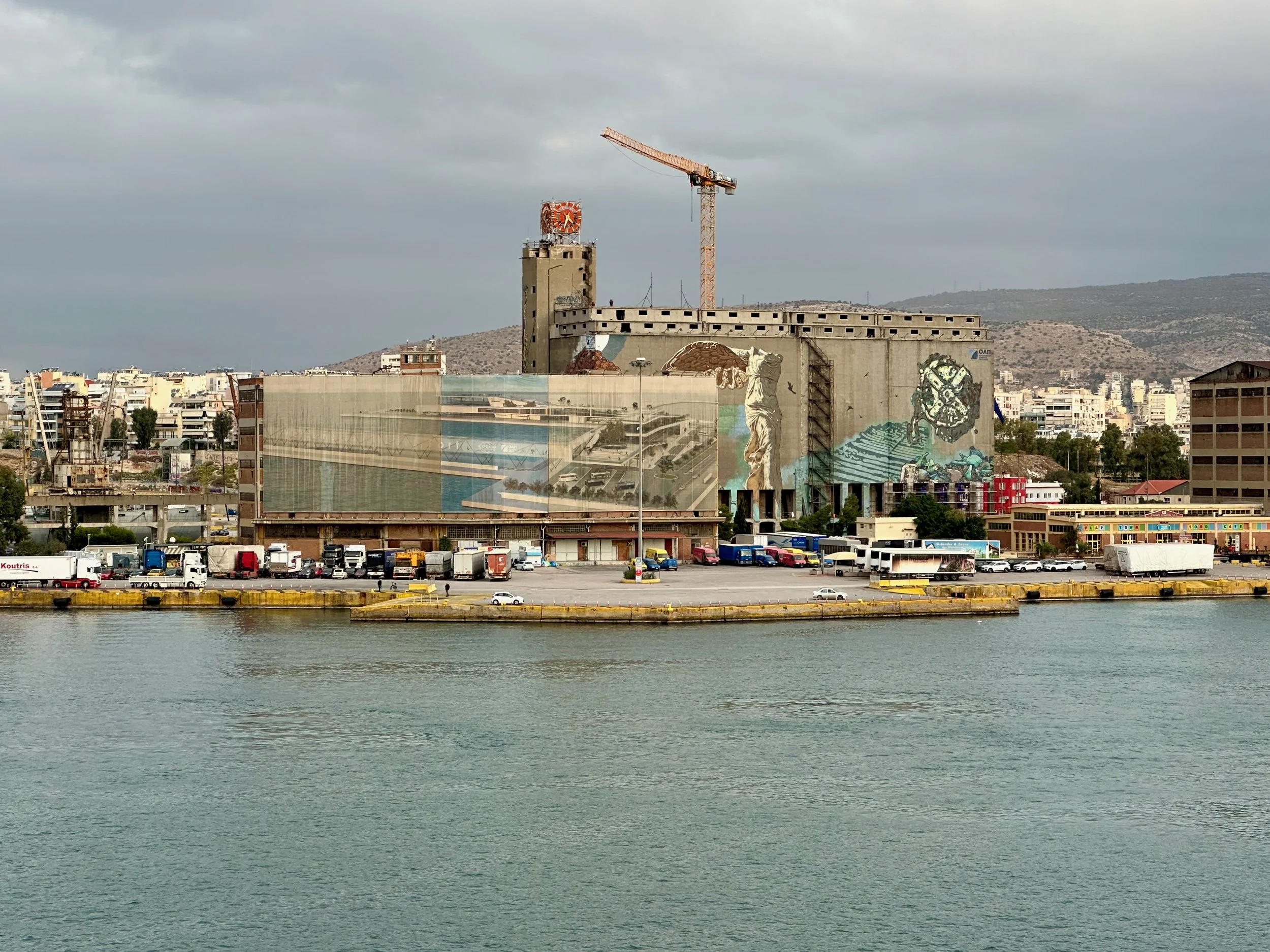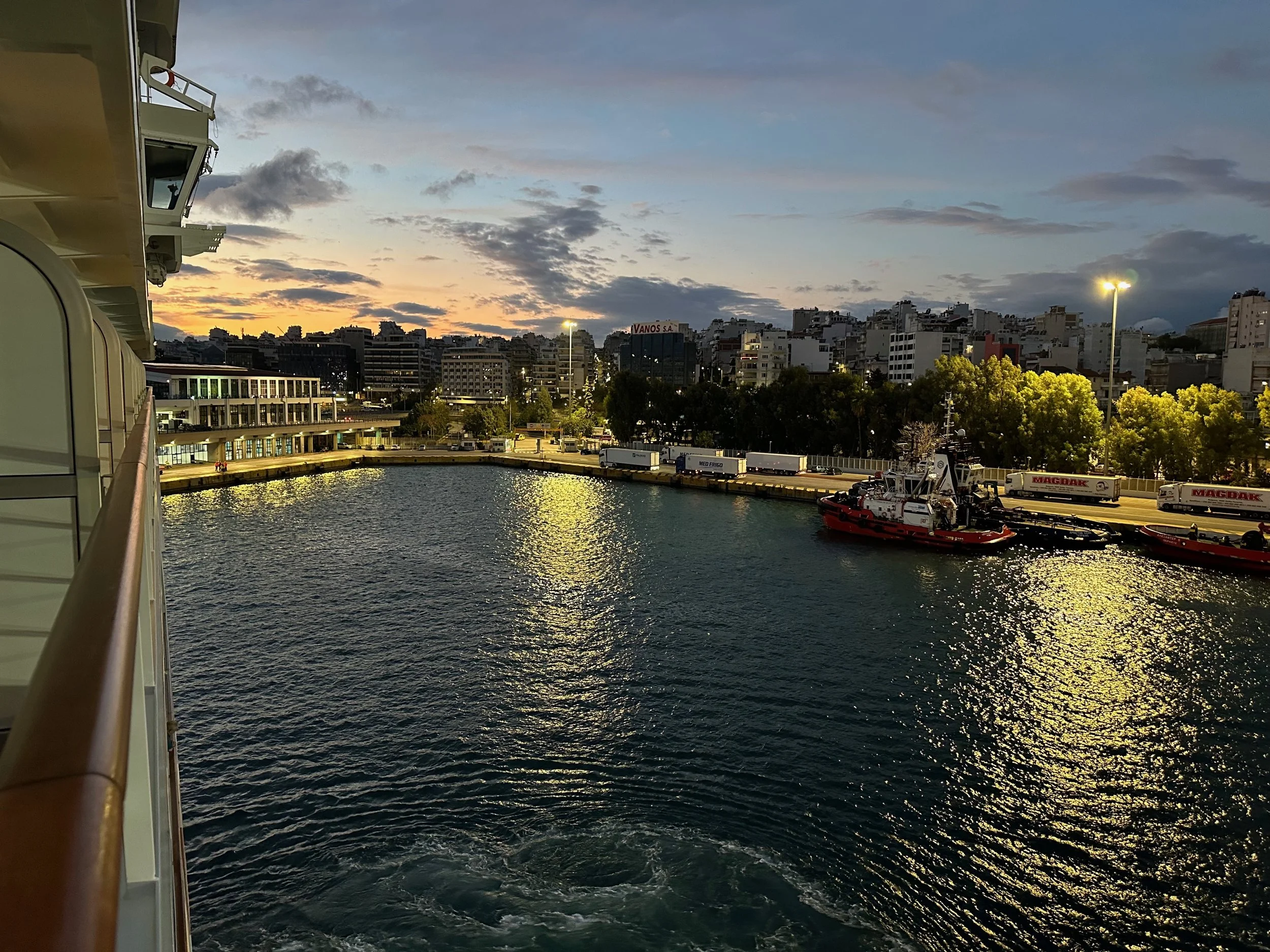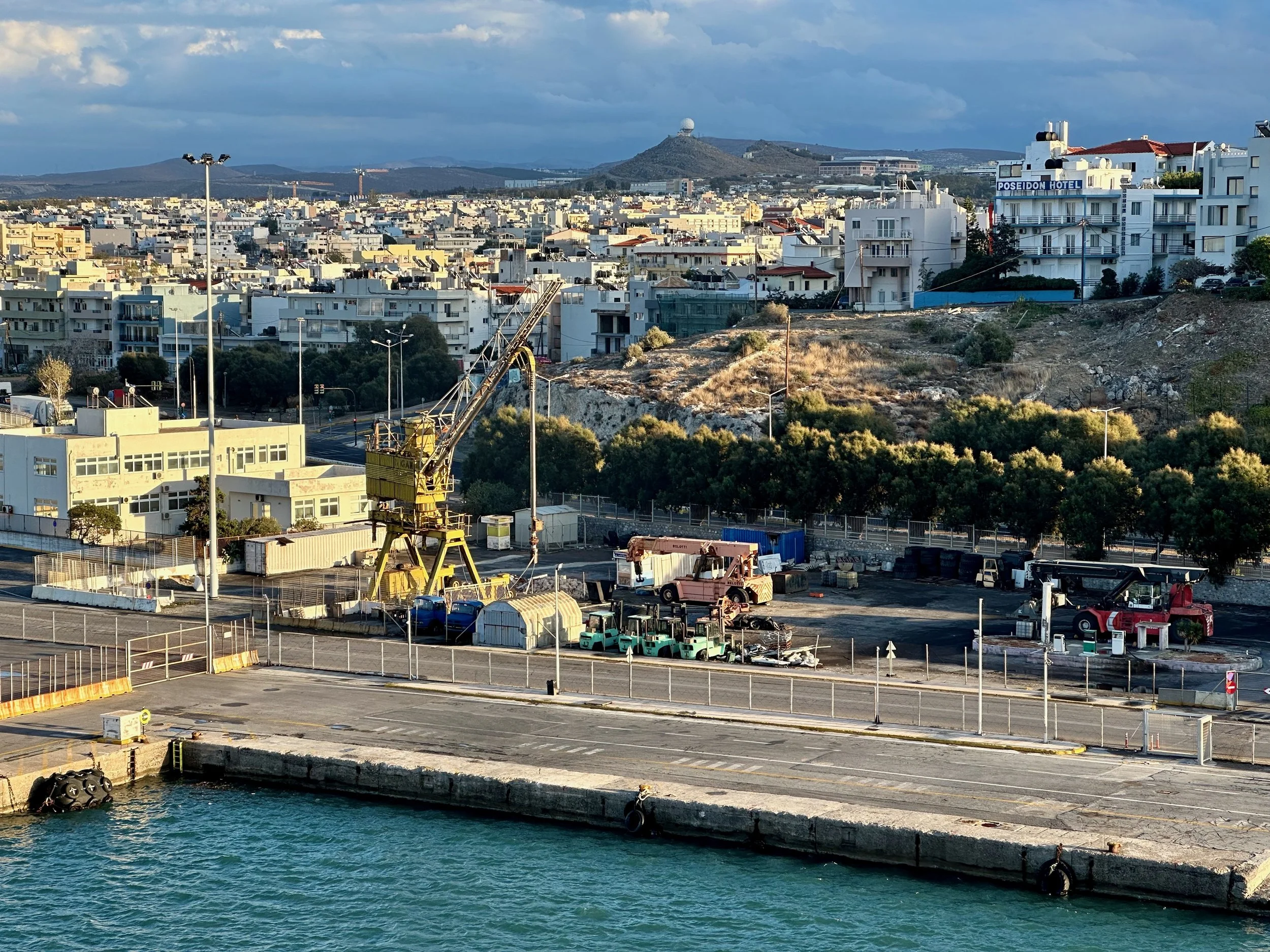 Reaching our port of disembarkation took an overnight sail from Crete. We arrived while still dark, and were being pushed into the dock by a large tug just as dawn was breaking. We got up early because of the motion of the ship, and got some early morning photos from our balcony. Unfortunately it wasn’t going to be a warm and sunny day. I guess it was getting us prepared for what we would experience when we got back to Vancouver.