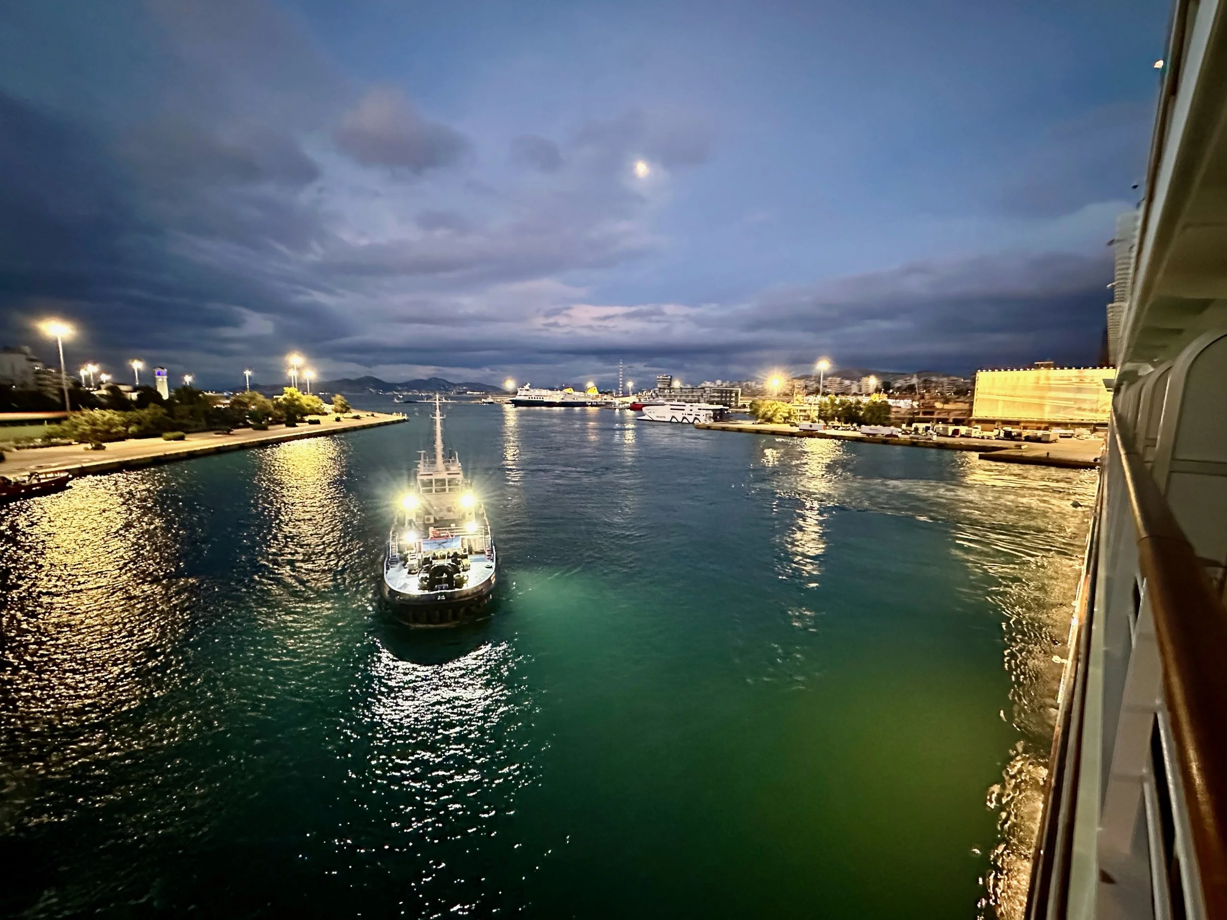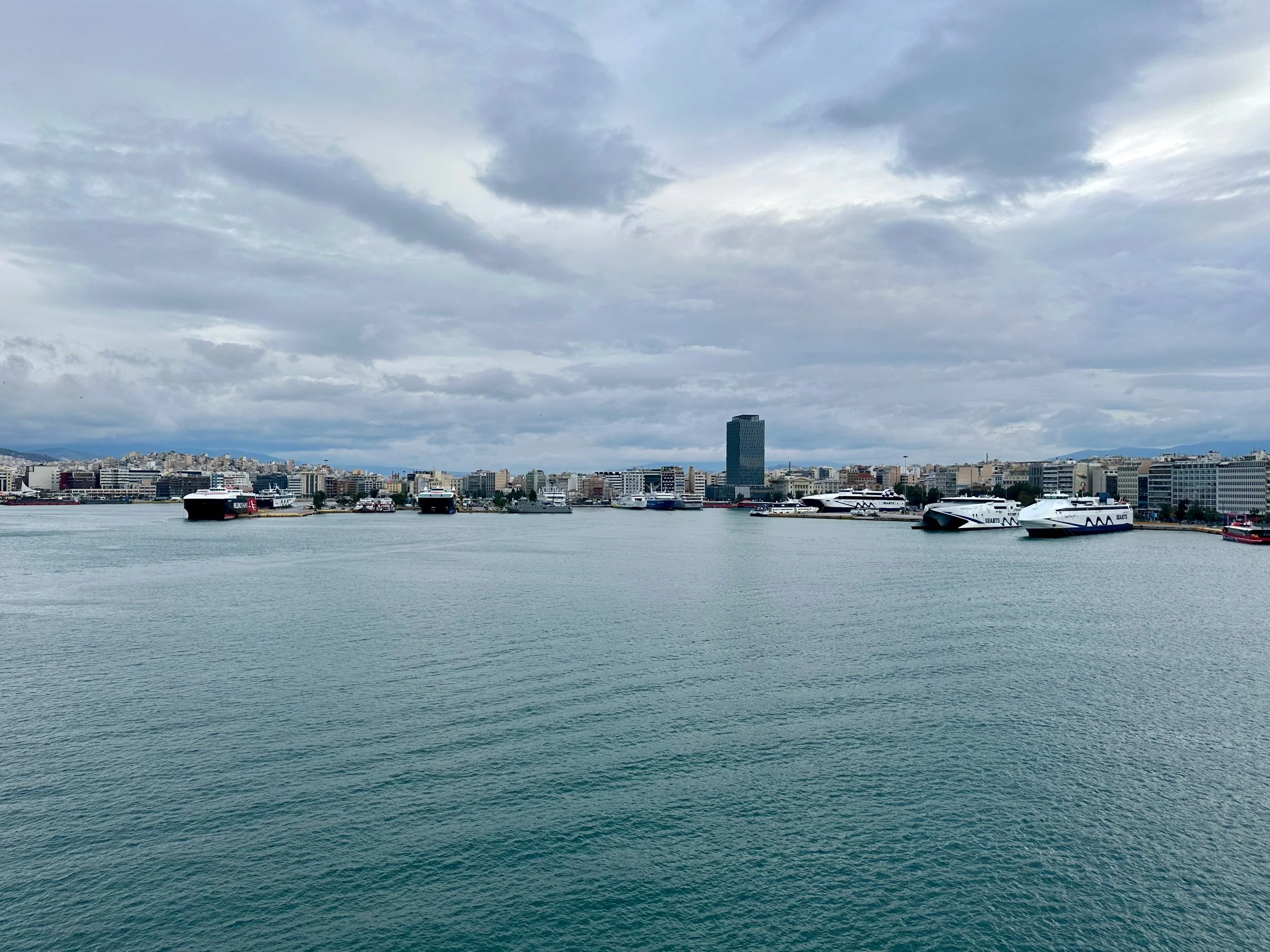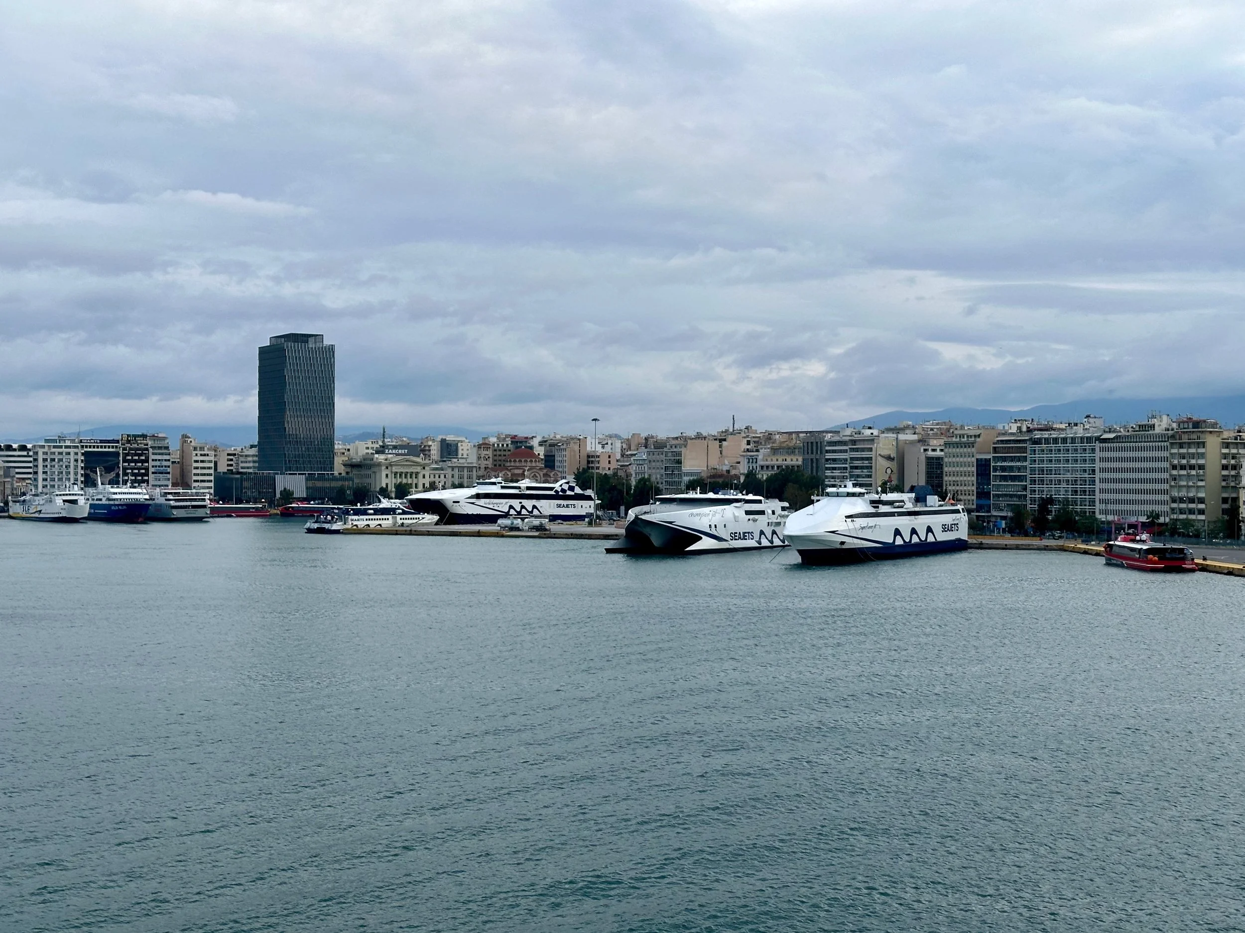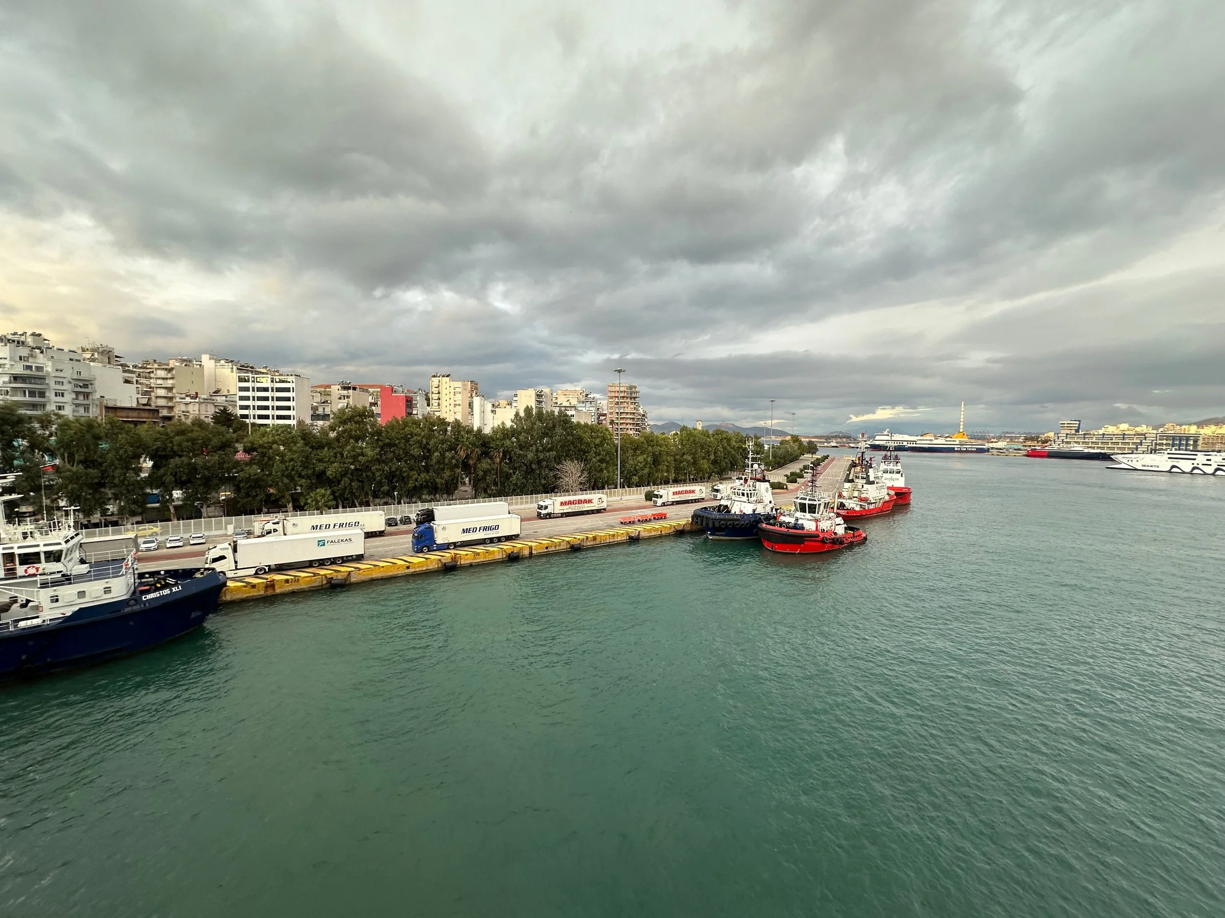 Reaching our port of disembarkation took an overnight sail from Crete. We arrived while still dark, and were being pushed into the dock by a large tug just as dawn was breaking. We got up early because of the motion of the ship, and got some early morning photos from our balcony. Unfortunately it wasn’t going to be a warm and sunny day. I guess it was getting us prepared for what we would experience when we got back to Vancouver.