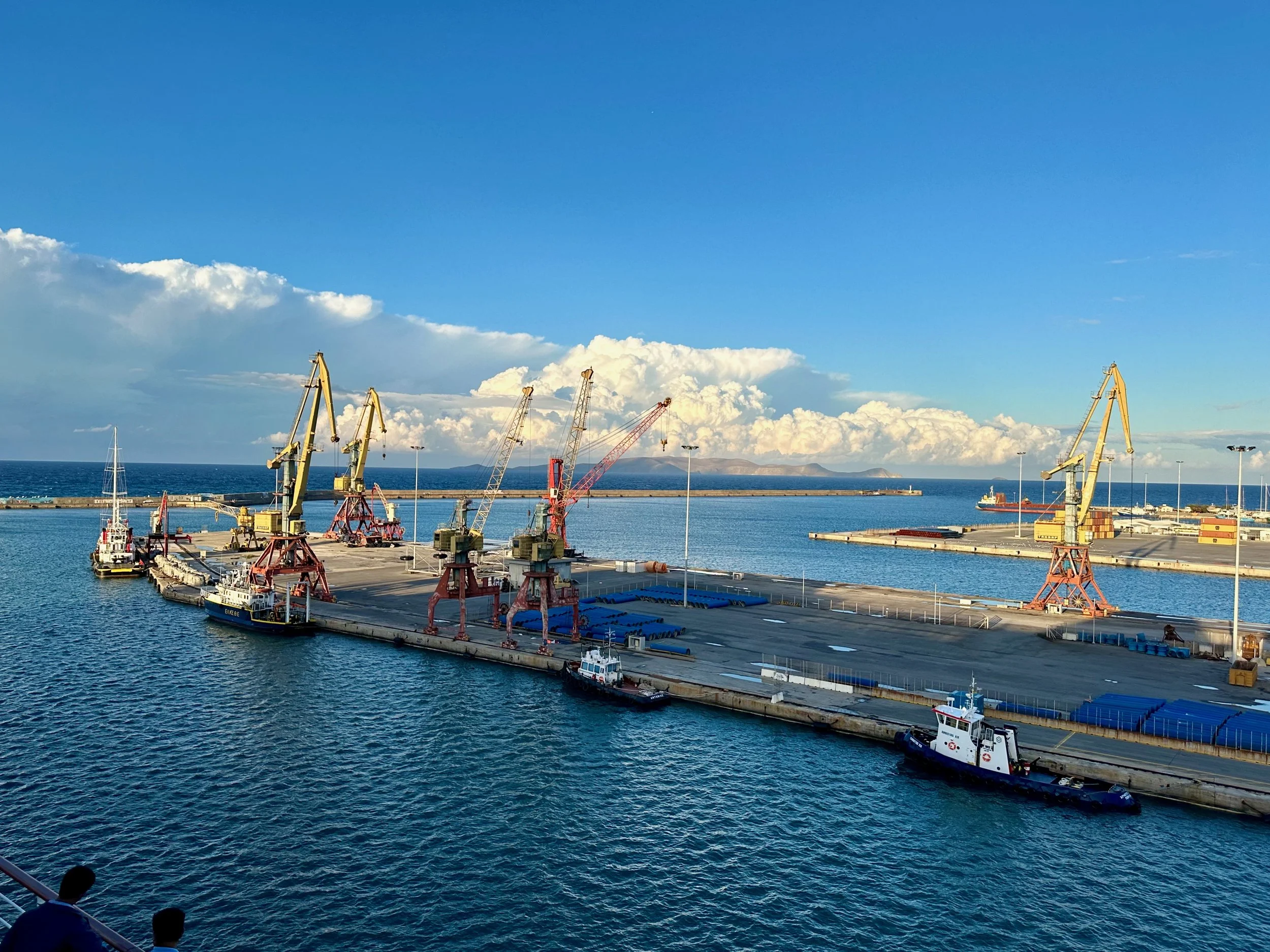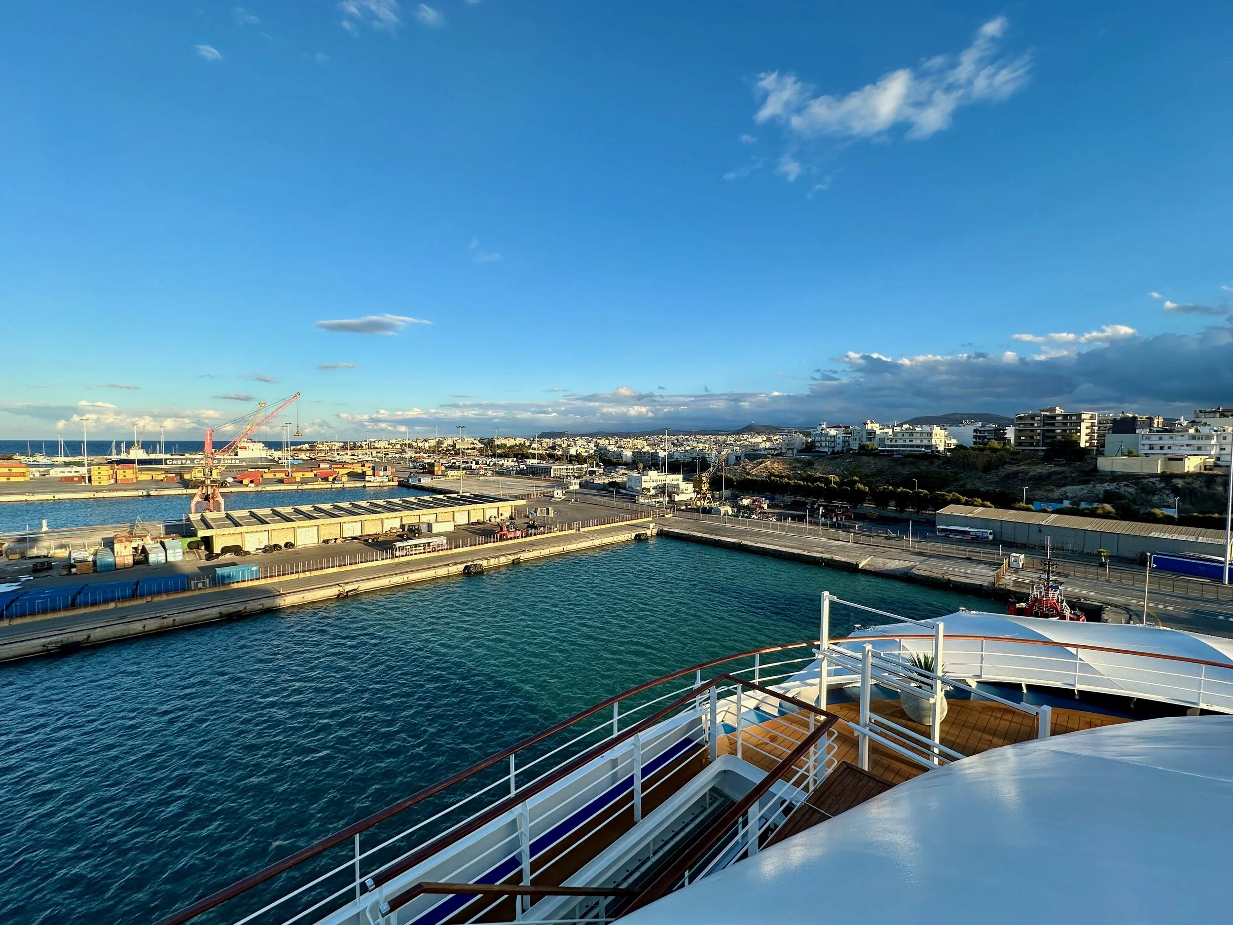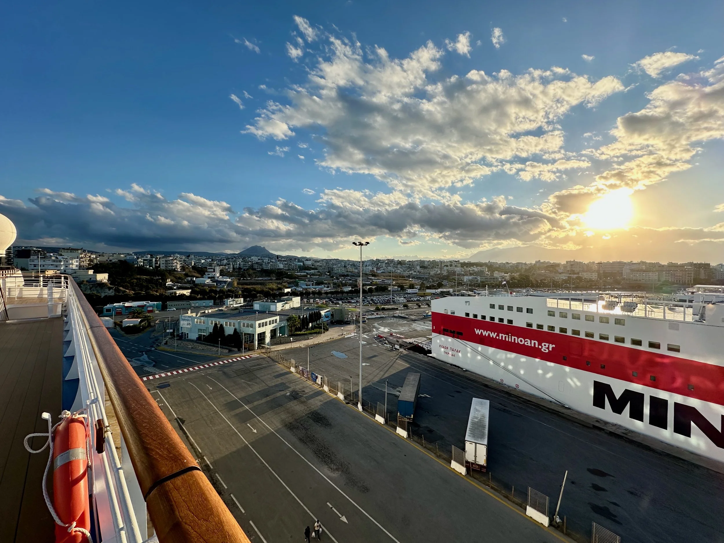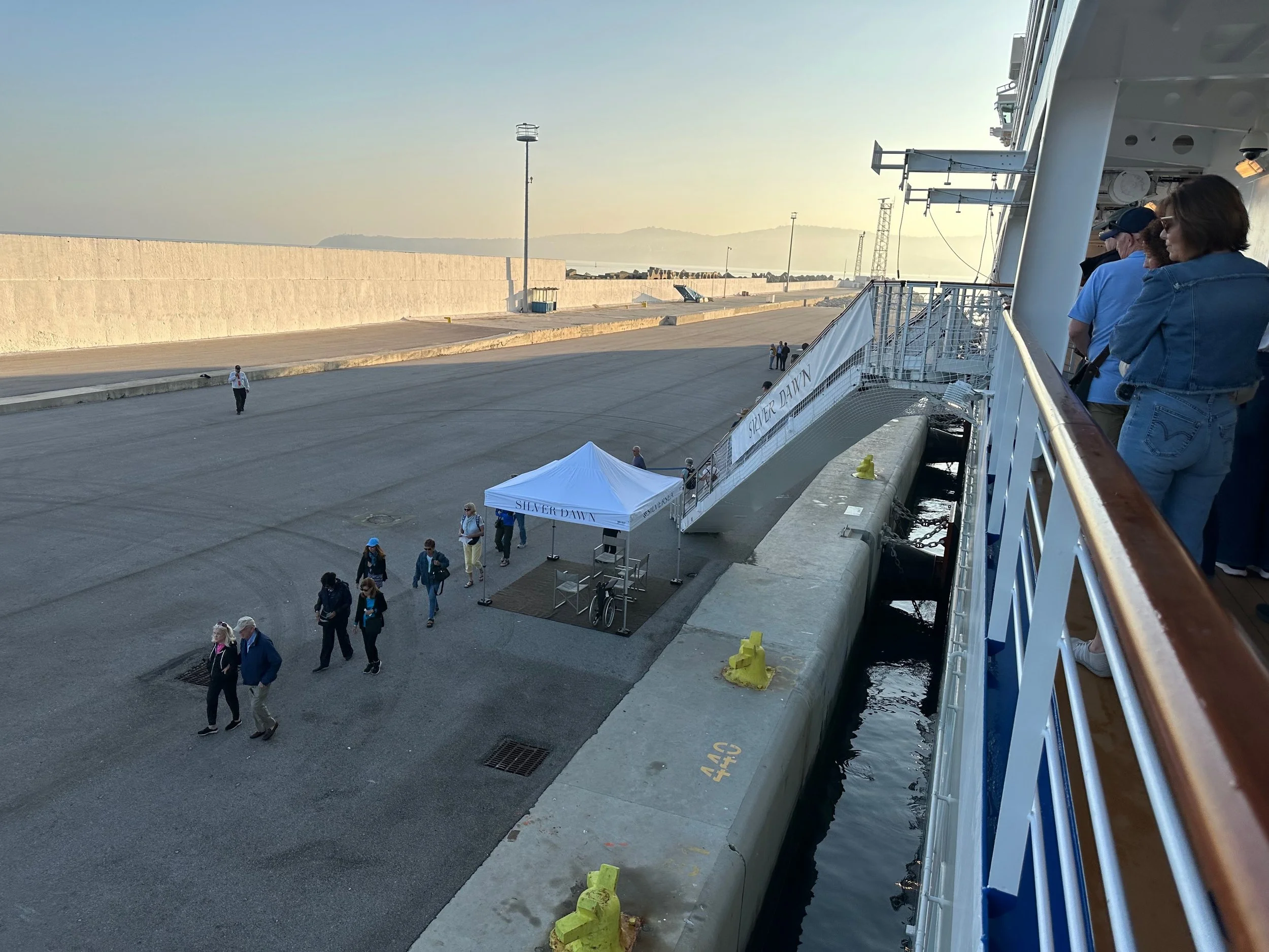 Reaching our port of disembarkation took an overnight sail from Crete. We arrived while still dark, and were being pushed into the dock by a large tug just as dawn was breaking. We got up early because of the motion of the ship, and got some early morning photos from our balcony. Unfortunately it wasn’t going to be a warm and sunny day. I guess it was getting us prepared for what we would experience when we got back to Vancouver.