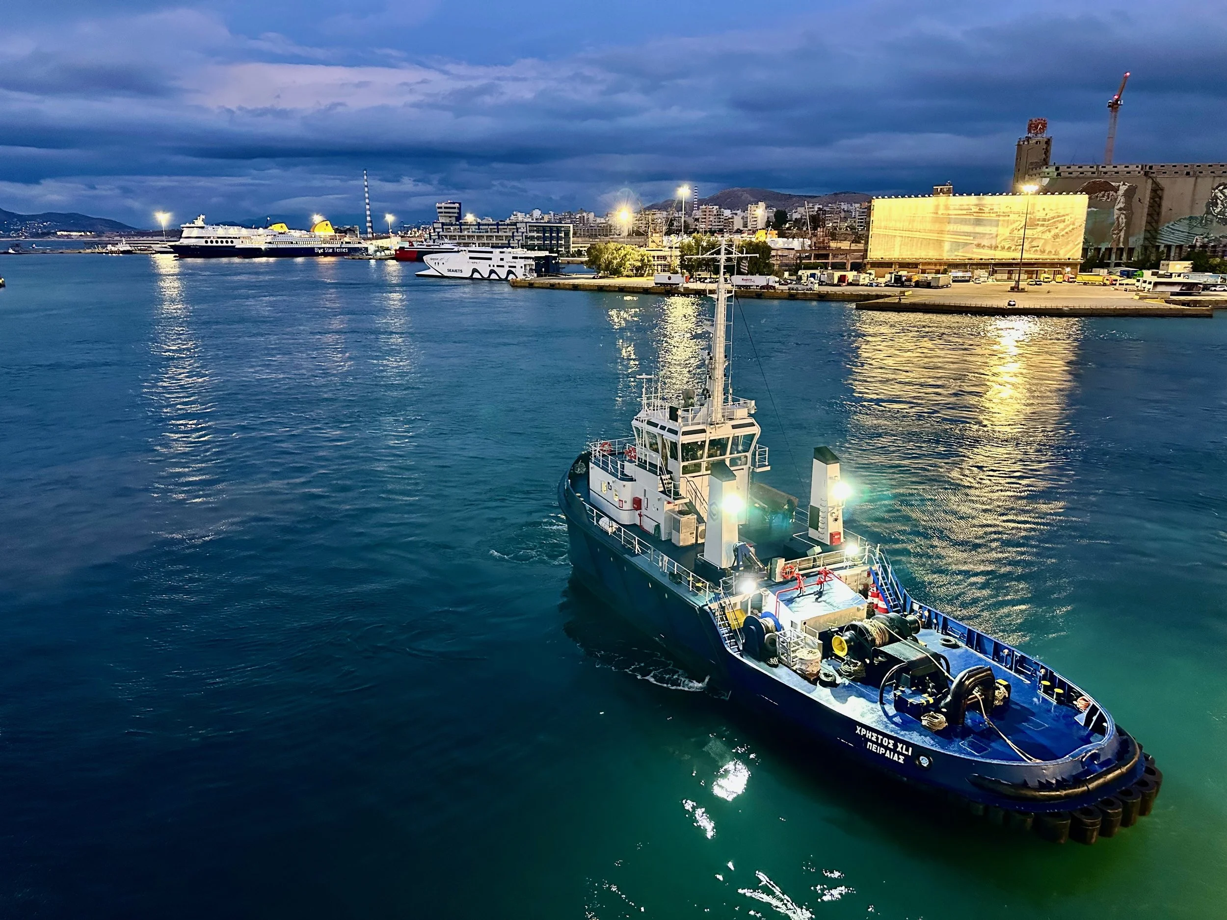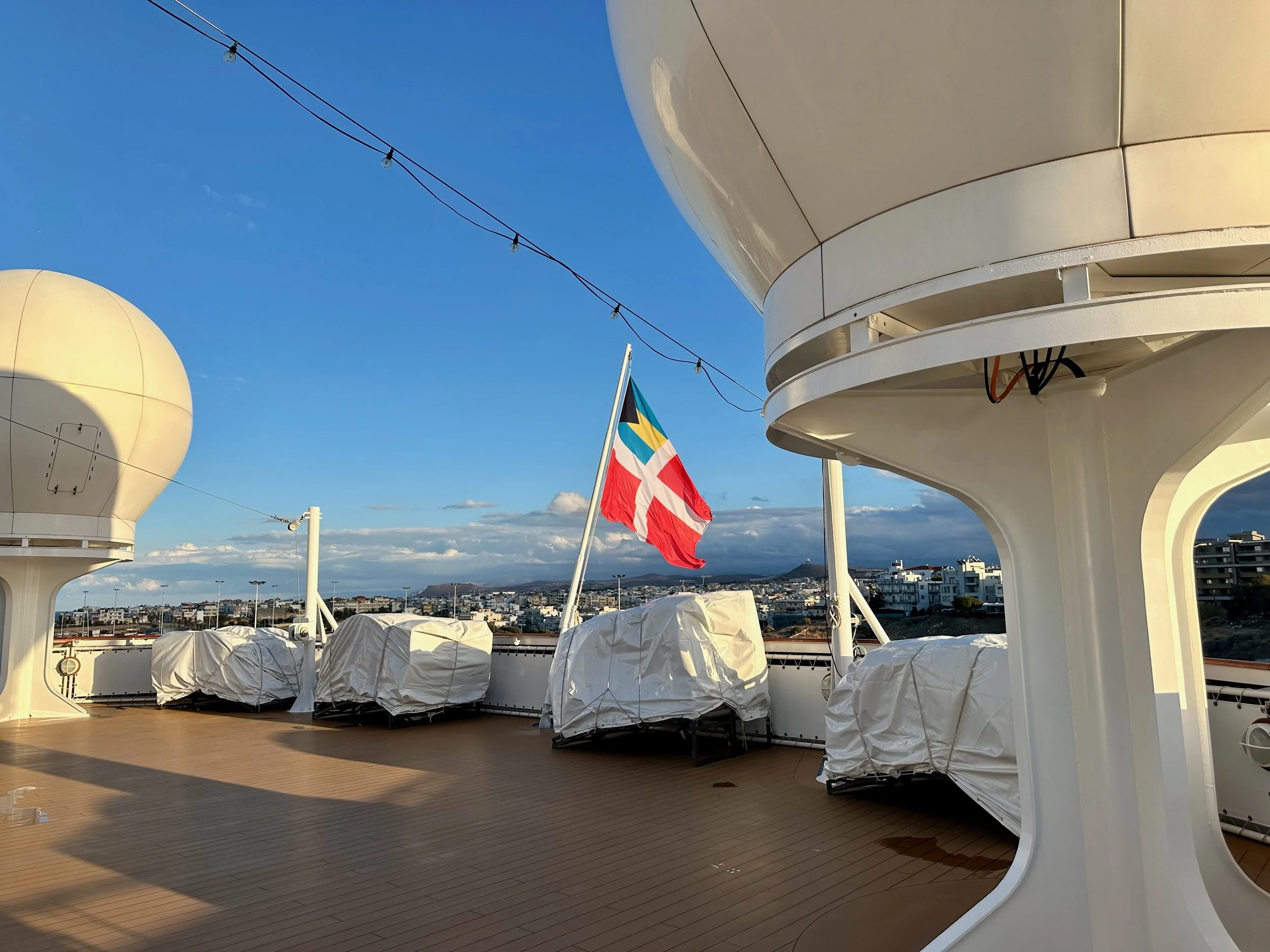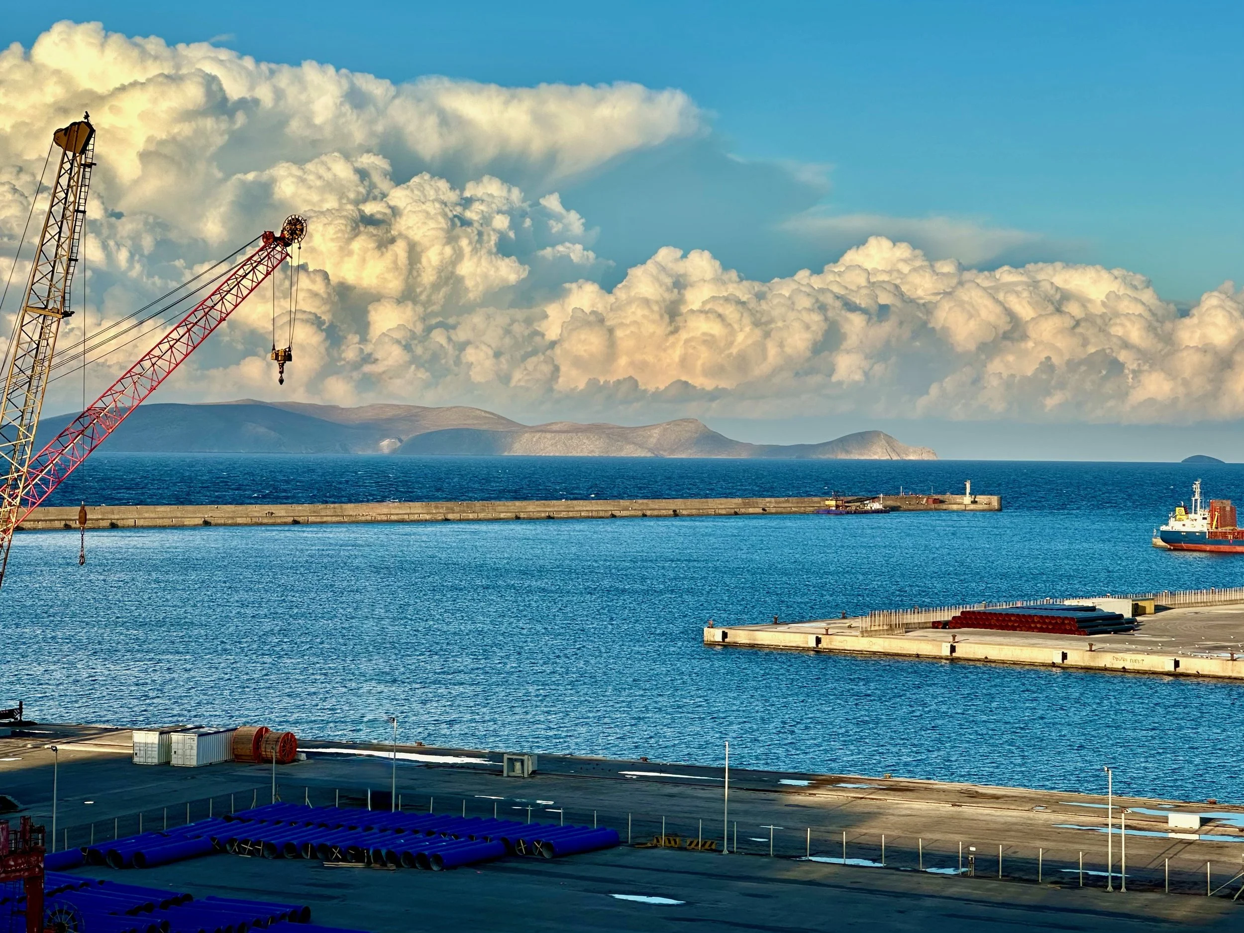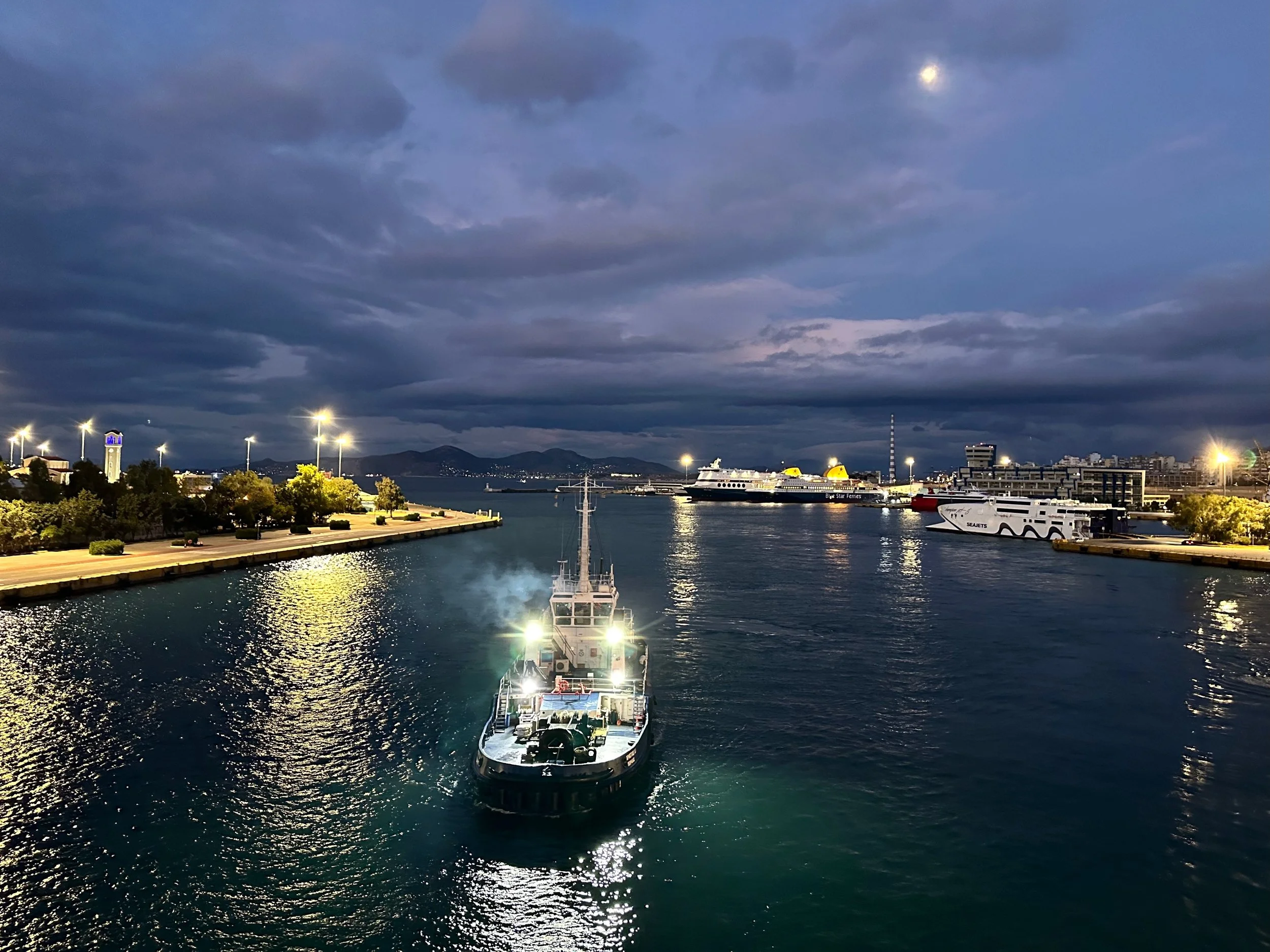 Reaching our port of disembarkation took an overnight sail from Crete. We arrived while still dark, and were being pushed into the dock by a large tug just as dawn was breaking. We got up early because of the motion of the ship, and got some early morning photos from our balcony. Unfortunately it wasn’t going to be a warm and sunny day. I guess it was getting us prepared for what we would experience when we got back to Vancouver.