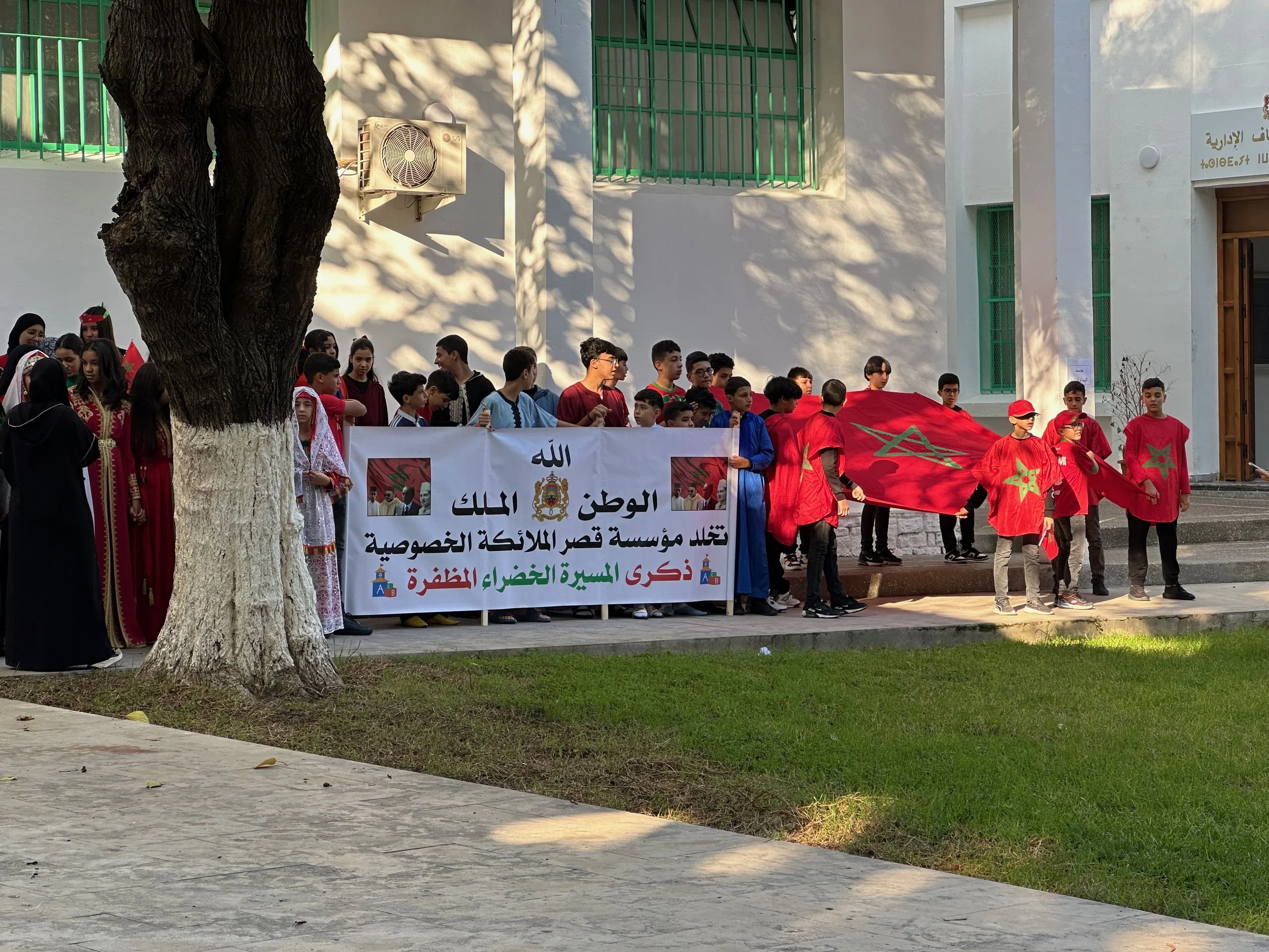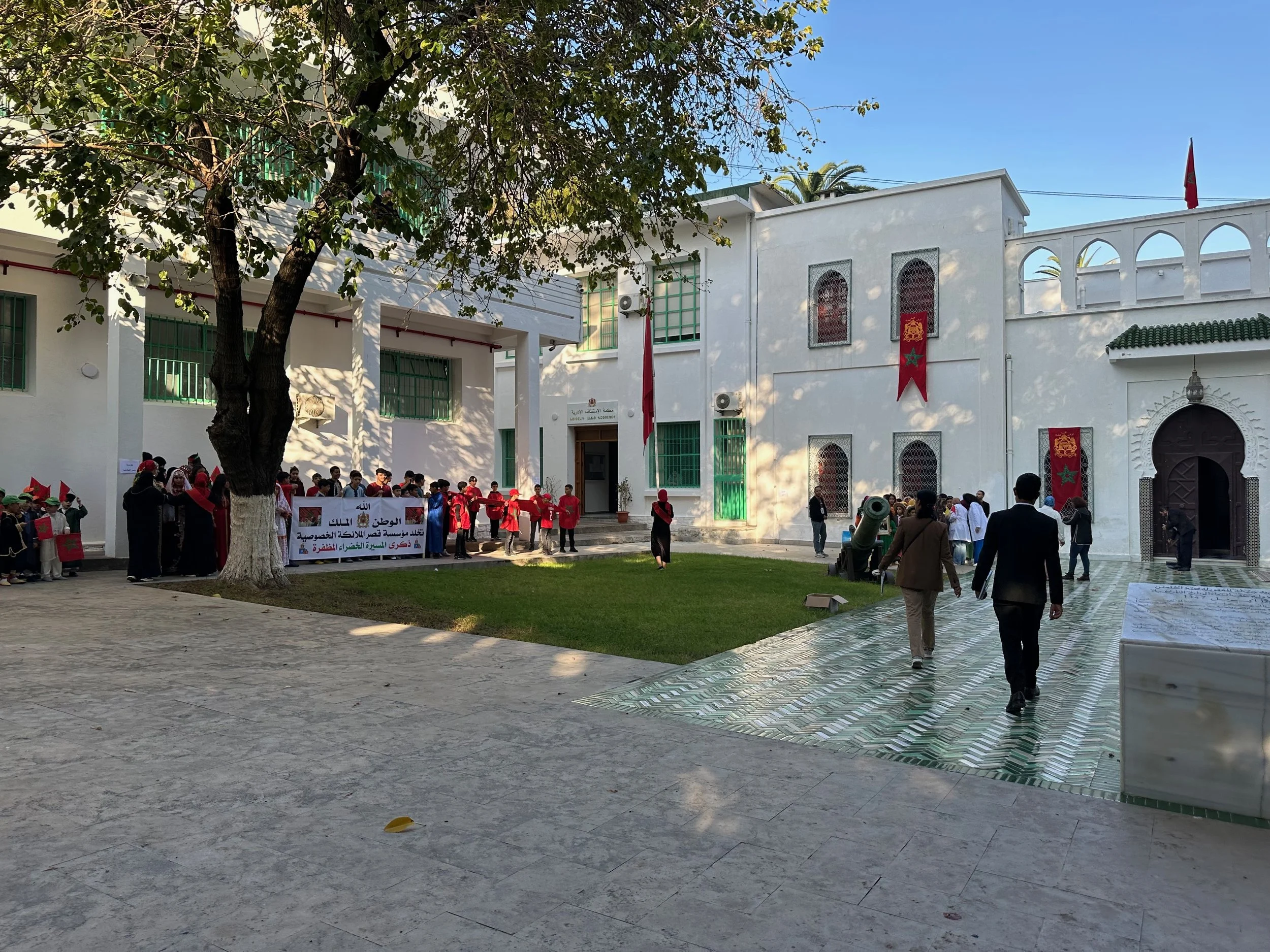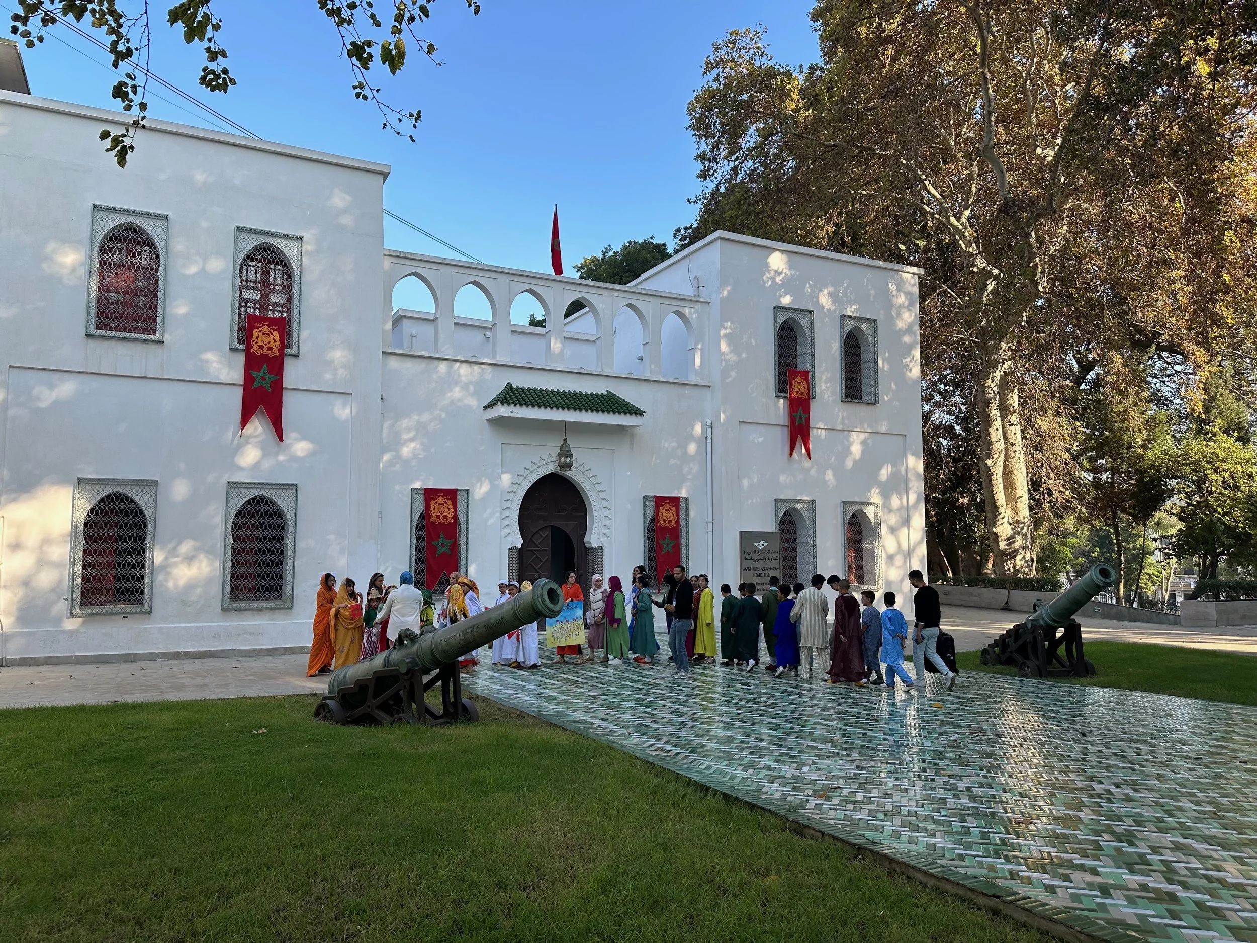 Like Casablanca, our day in Tangier would be a full one, but with a lot of walking between highlight locations. We were dropped off in a central plaza location and the walk began. First was an Anglican church, which unlike the decadent cathedral in Seville was a humble building where the attention was obviously directed toward the worship of the spirit. From there we visited the grounds of the “Historical Memory Space of the Resistance and Liberation of Tangier” located on the edge of Mendoubia Garden. Our visit here was fortuitous. Just after we were given the five cent explanation, a large group of school children showed up to celebrate a yearly event. It was very formal with singing, banners and marching.