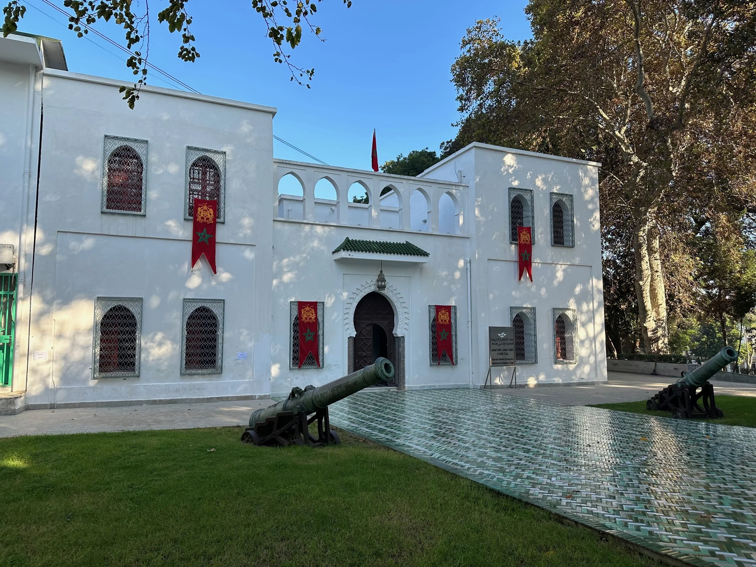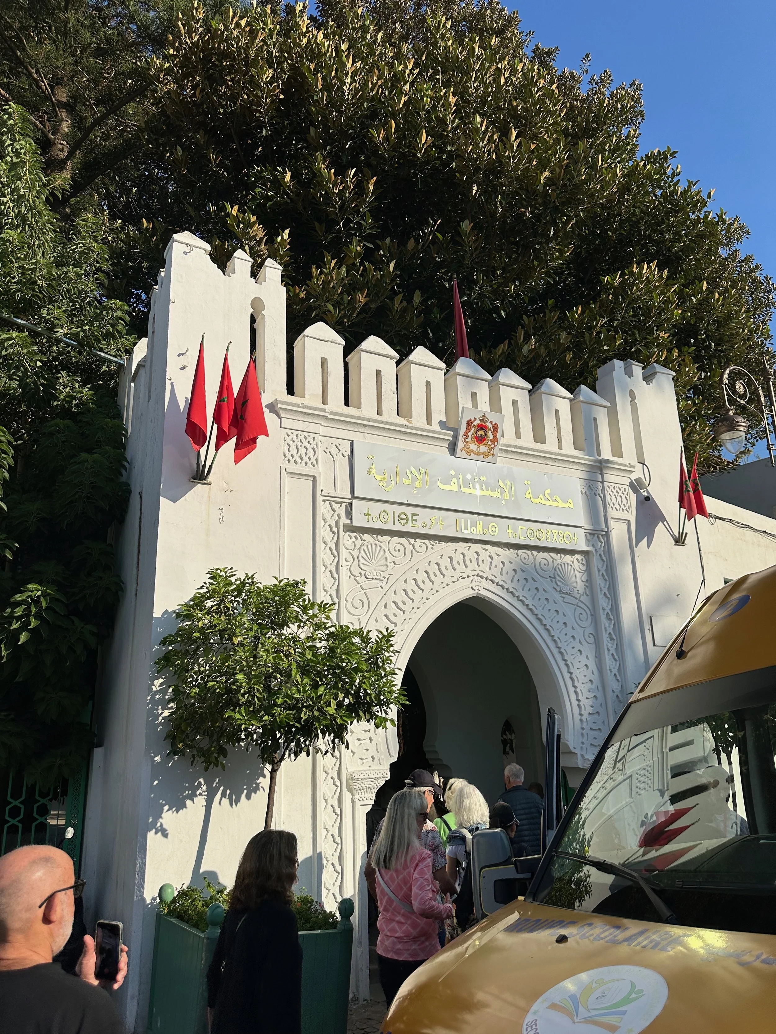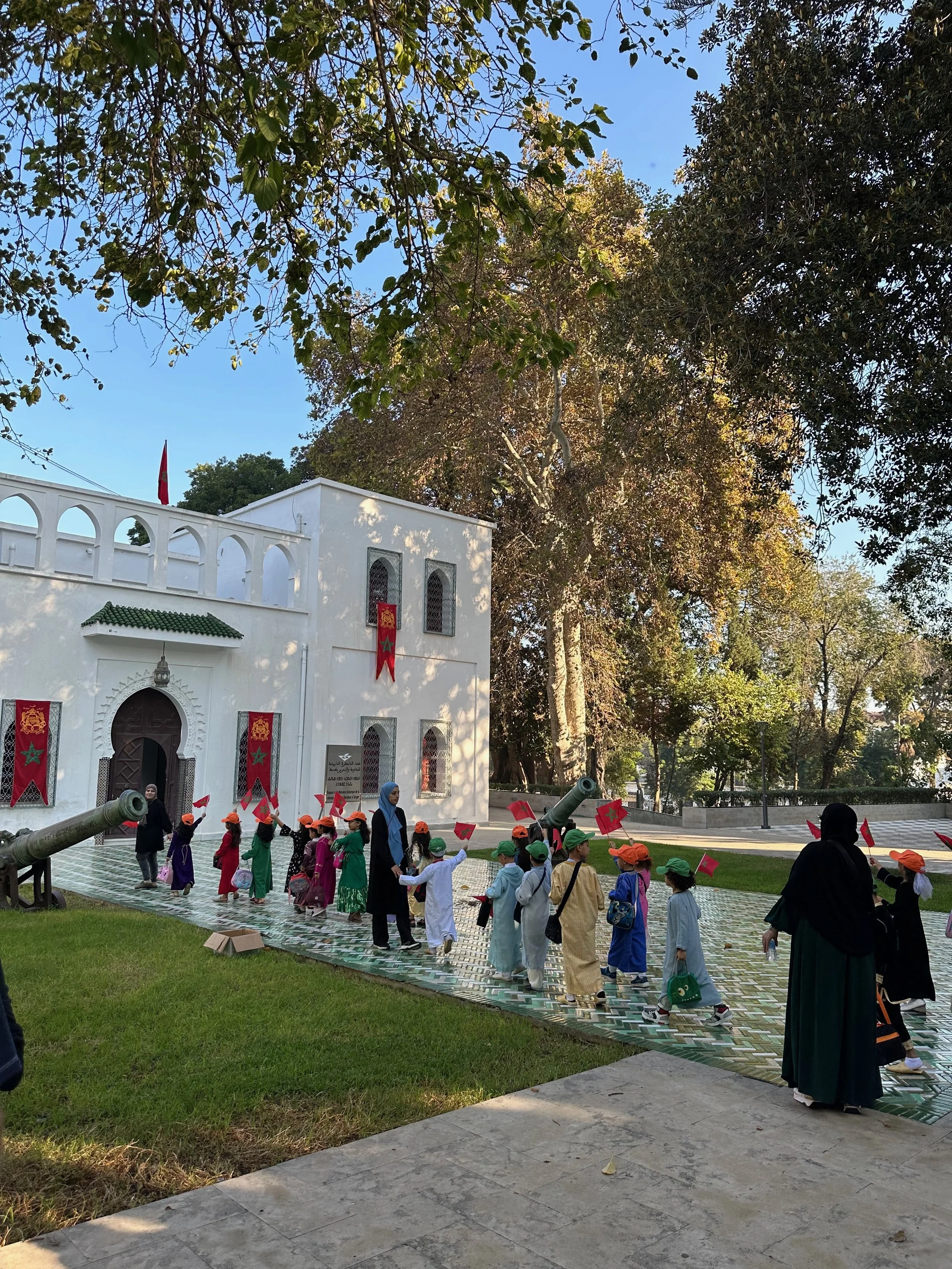Like Casablanca, our day in Tangier would be a full one, but with a lot of walking between highlight locations. We were dropped off in a central plaza location and the walk began. First was an Anglican church, which unlike the decadent cathedral in Seville was a humble building where the attention was obviously directed toward the worship of the spirit. From there we visited the grounds of the “Historical Memory Space of the Resistance and Liberation of Tangier” located on the edge of Mendoubia Garden. Our visit here was fortuitous. Just after we were given the five cent explanation, a large group of school children showed up to celebrate a yearly event. It was very formal with singing, banners and marching.