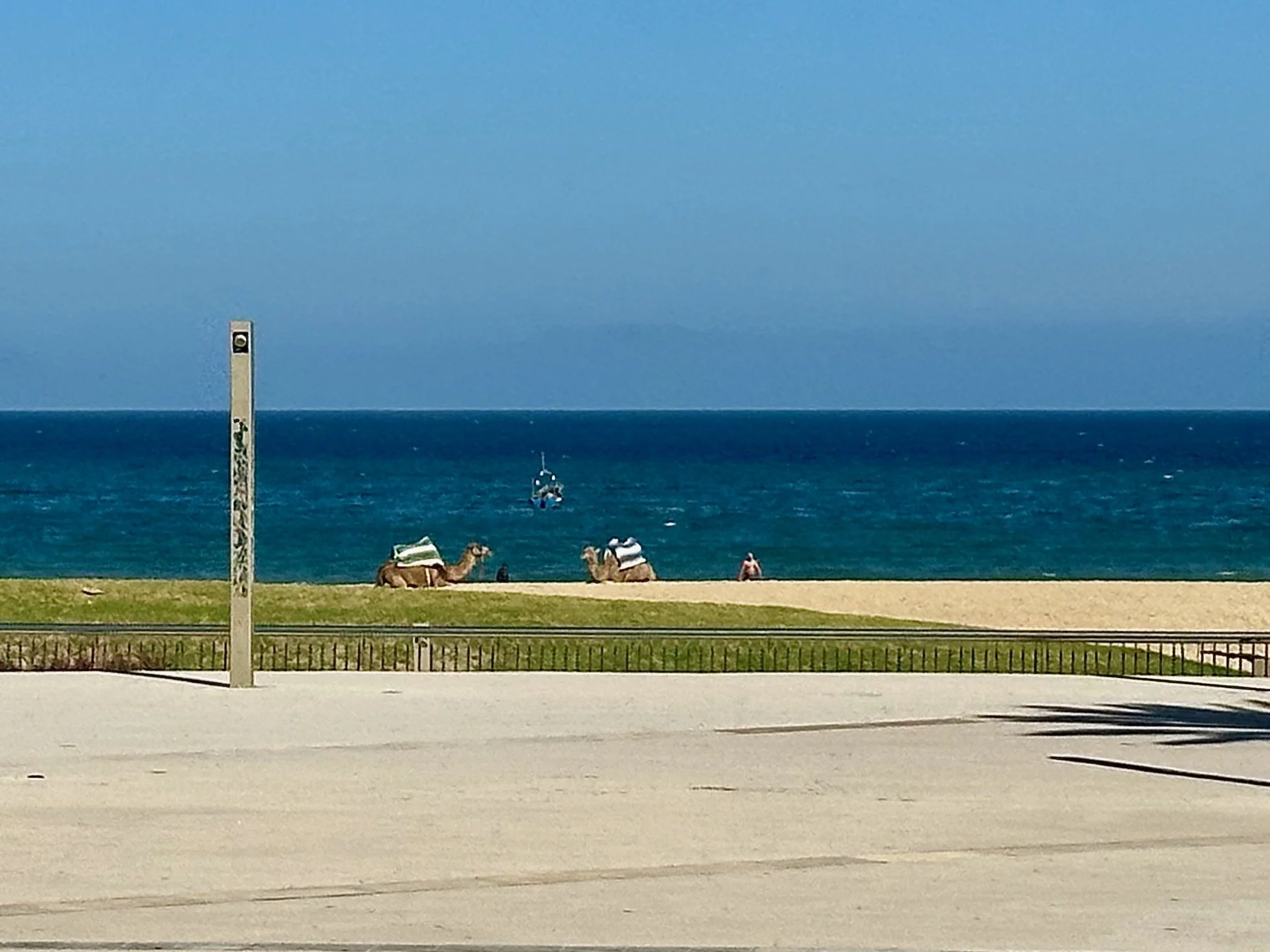 One of the stops towards the end of the walk was a break to get a cup of mint tea and bisquit at a local second floor cafe. Once done it was back onto the street and a few more blocks brought us to the beach only a short distance from our ship. Despite the short walking distance to the ship, the bus was there to pick us up and drive us down the beach road just to see the beach and the apartments across the street from it. The two most interesting features were the glass elevators that came up to ground level from underground parking beneath the beach, and the fact that there were camels sitting on the beach catching rays. They looked very chill.