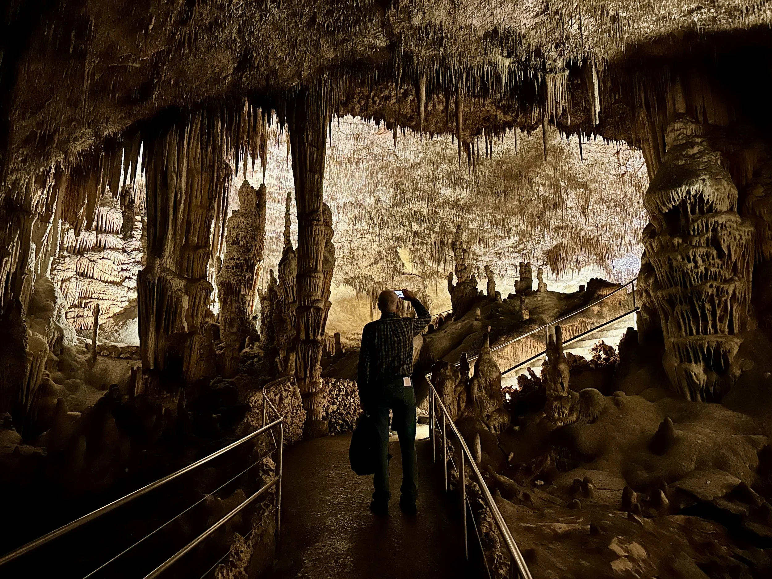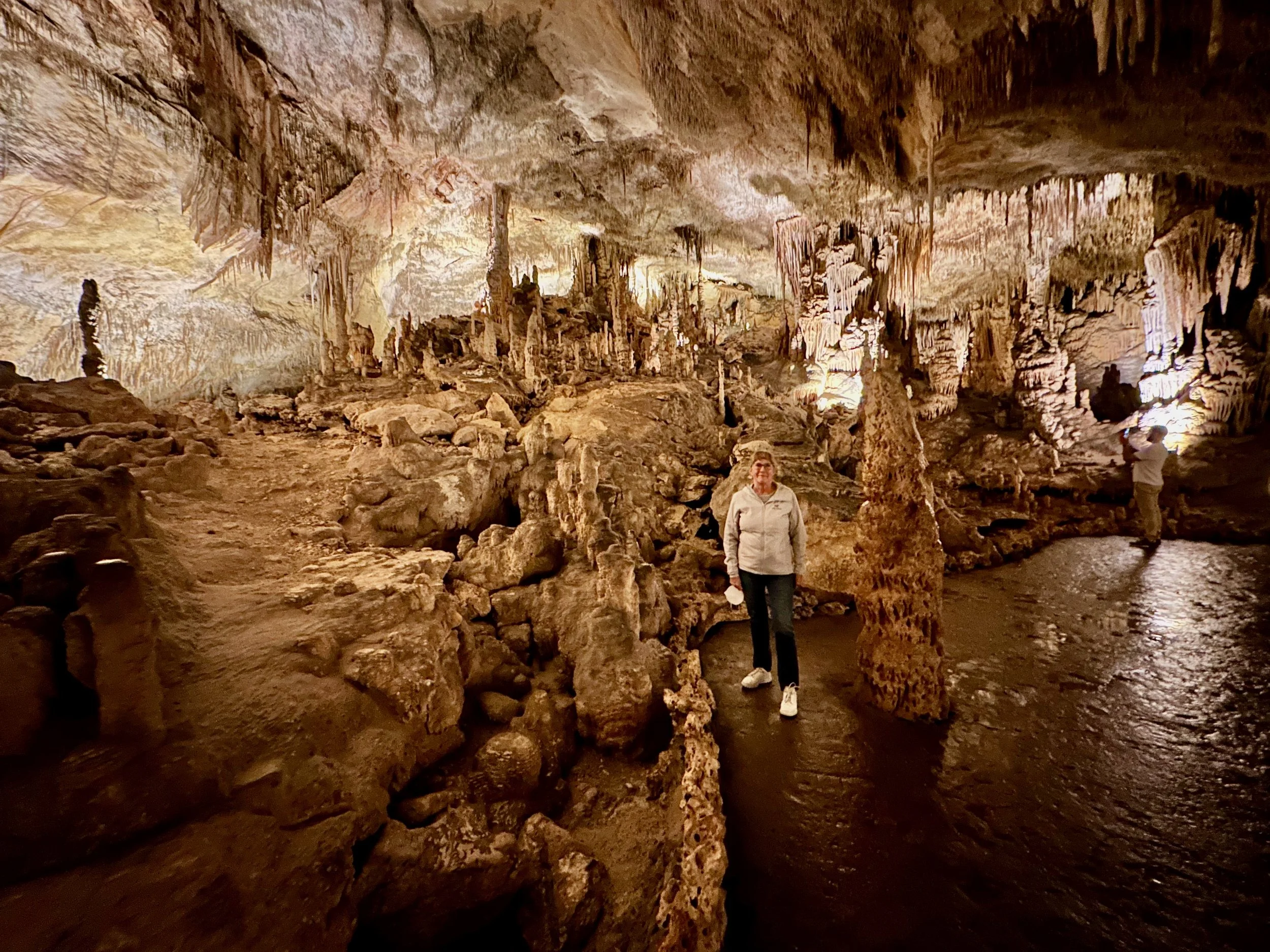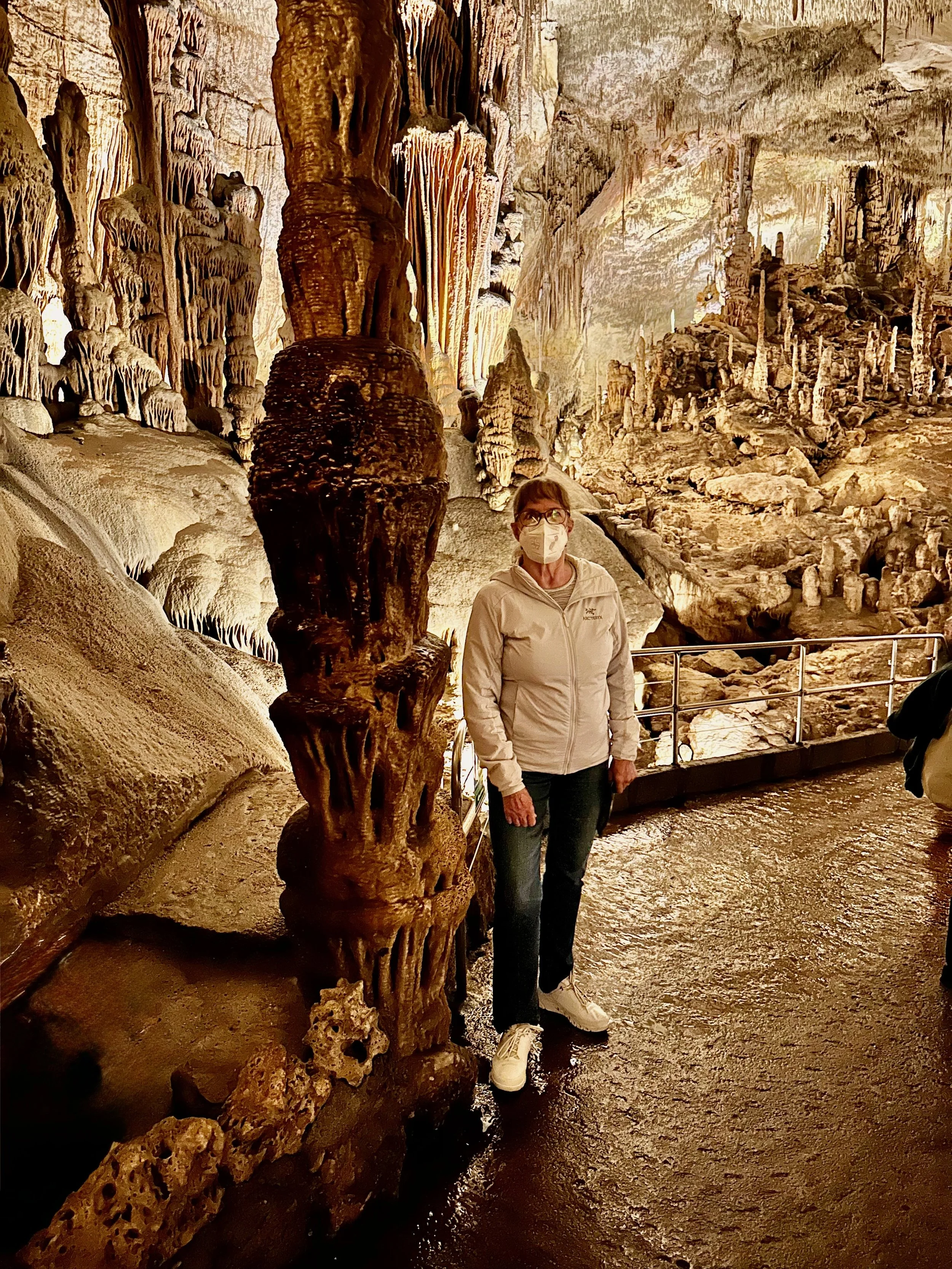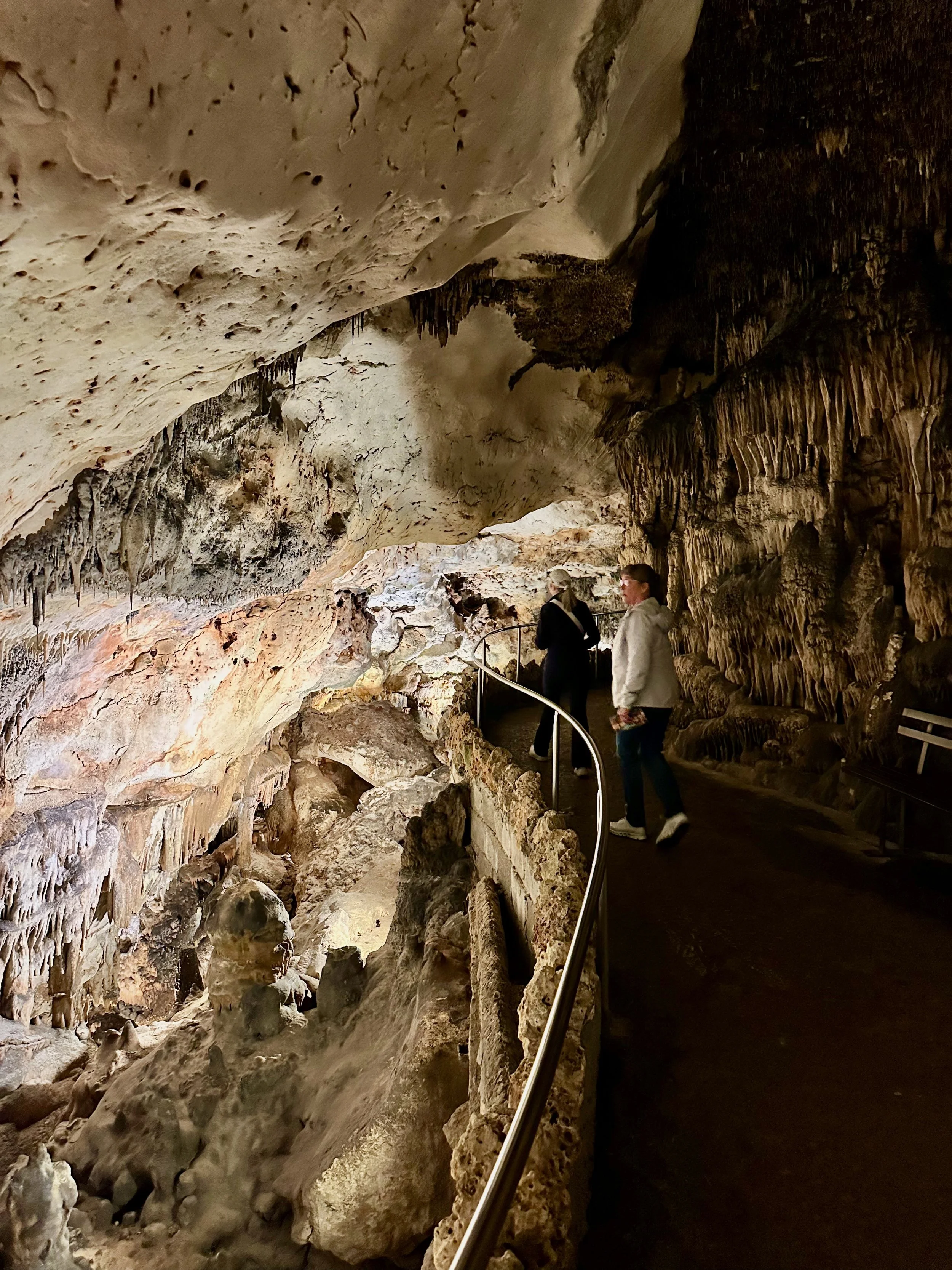 Entering the caves happened when the required number of quests were assembled in the holding area. Then we all advanced into the caves to work our way down the many flights of stairs fashioned into the rock either by carving or the forming of concrete. We fell to the back of the group so we could view the outstanding formations without the clutter of all the other people. Sure we missed the technical discussion from the guide, but we were more interested just in the pure beauty before us. With close ties to several geologists, we hardly needed to learn from the guide. Besides, this wasn’t our first cave experience. We had been in caves in Japan and America.