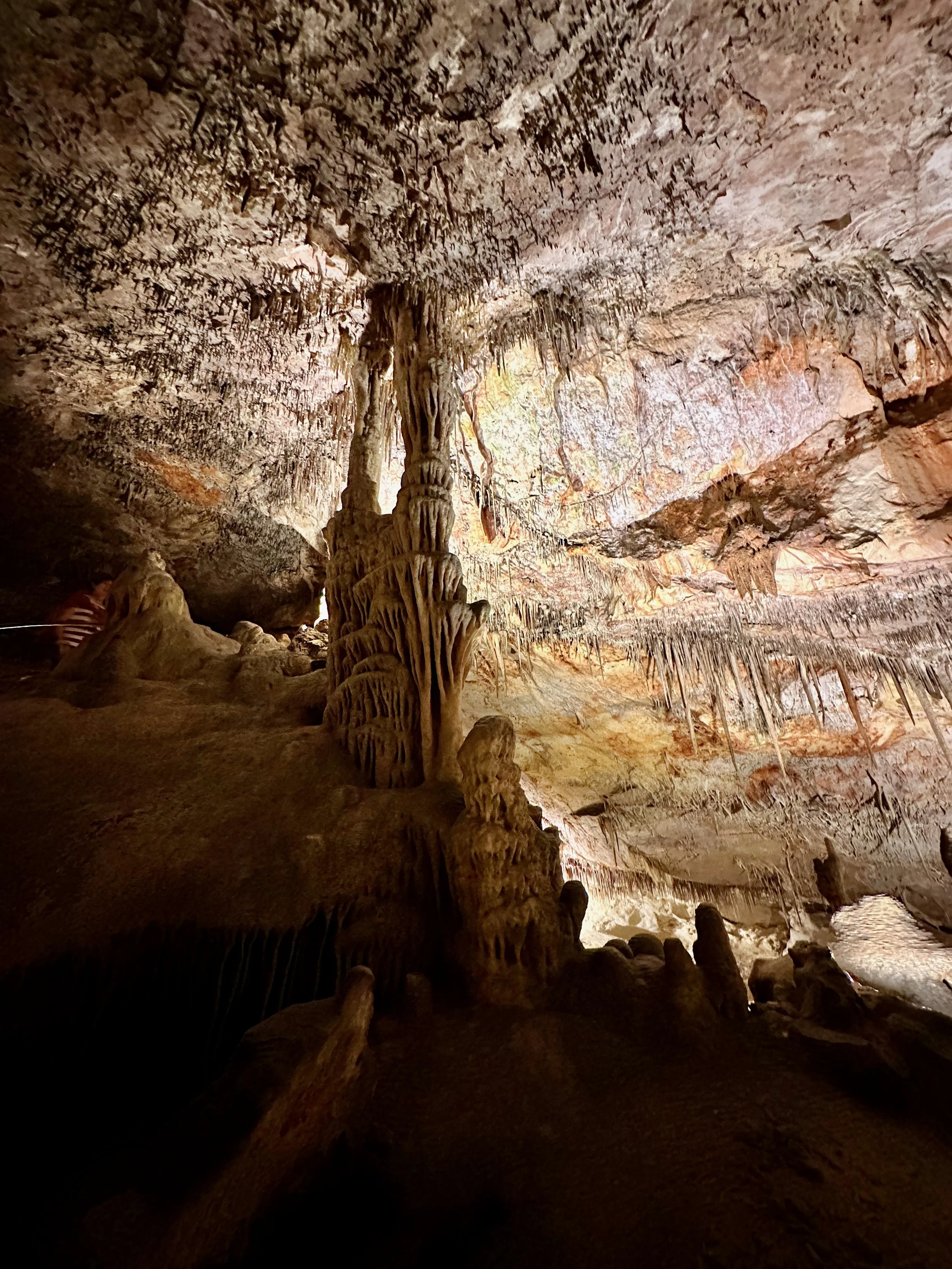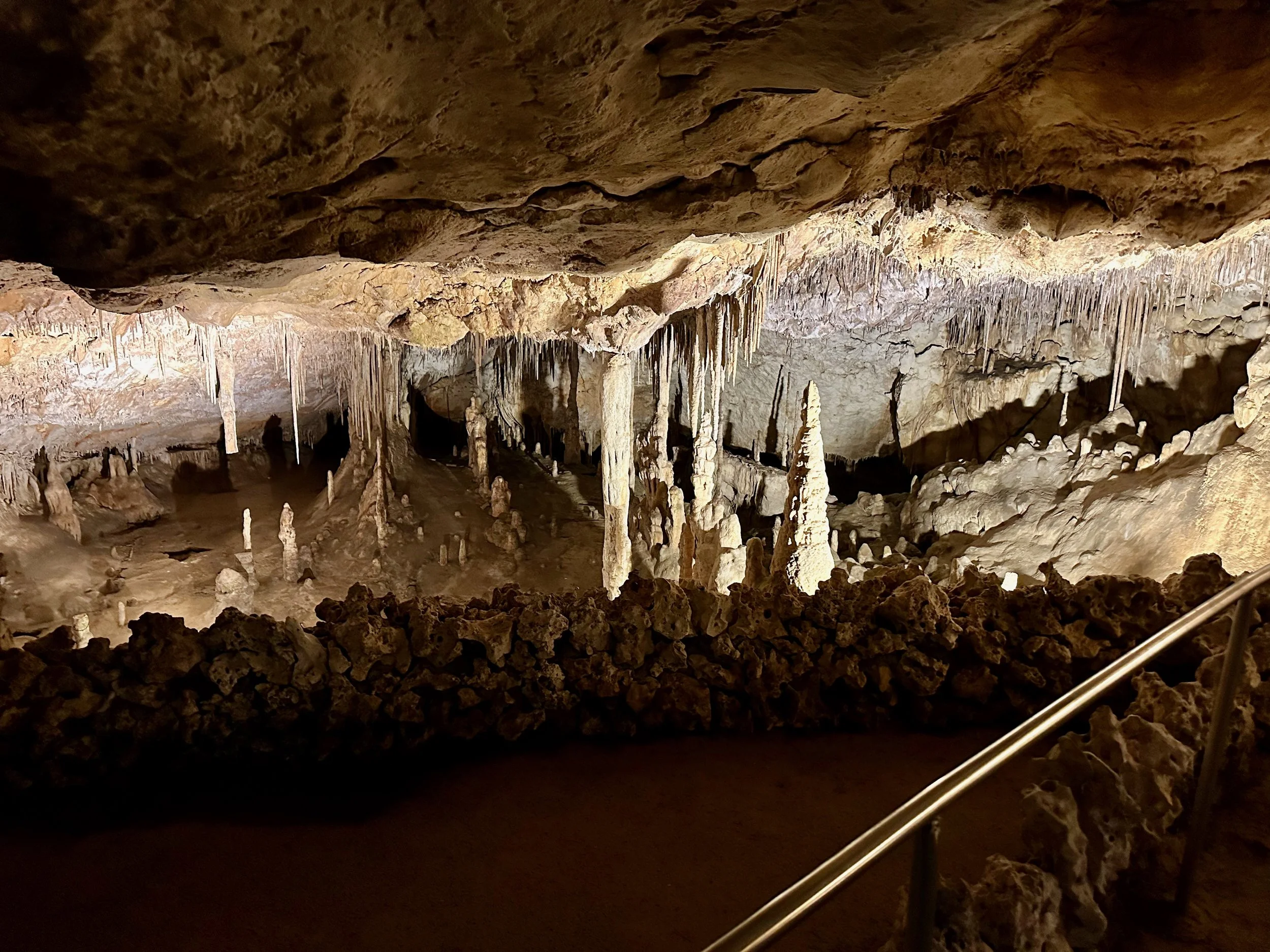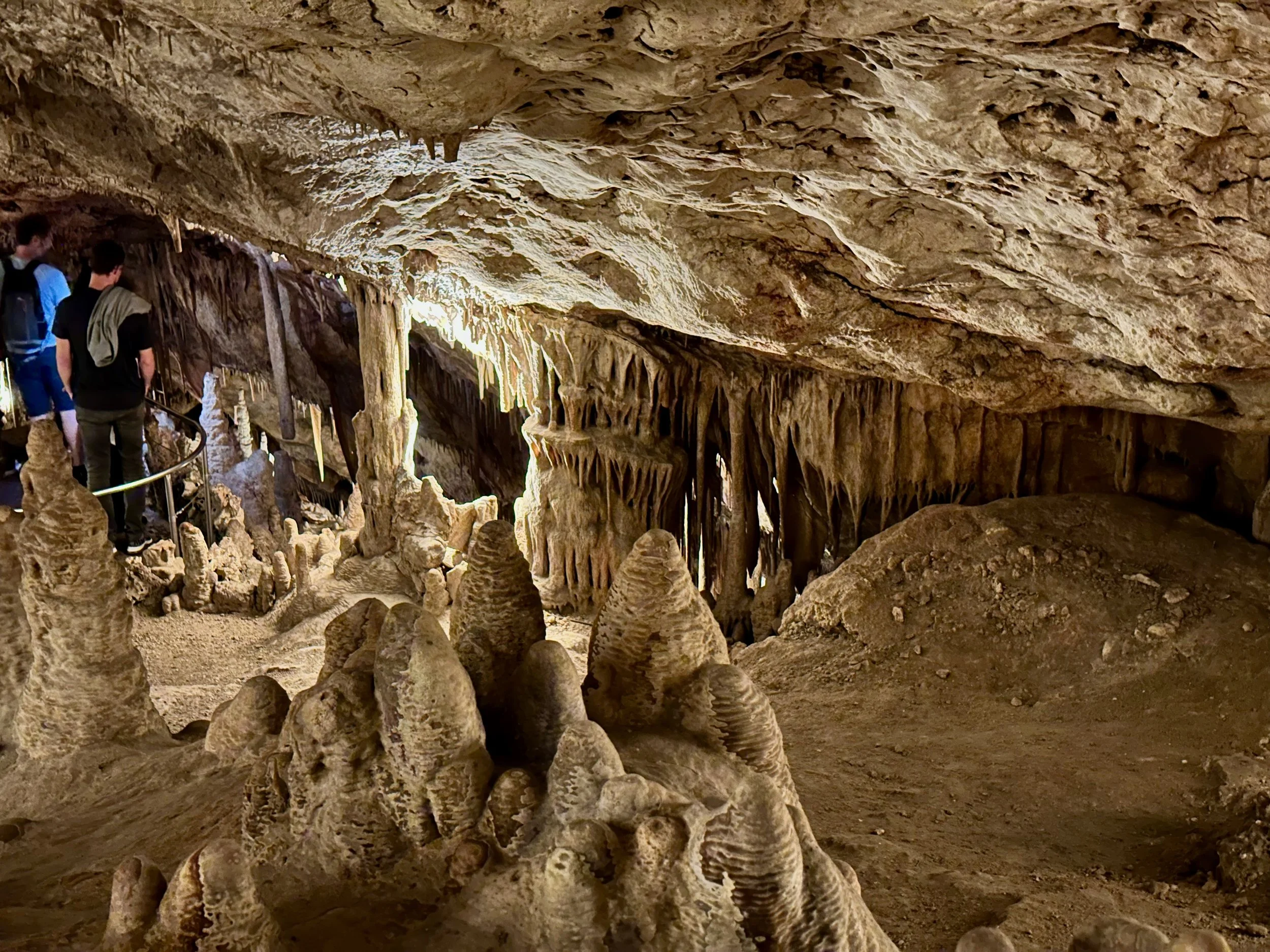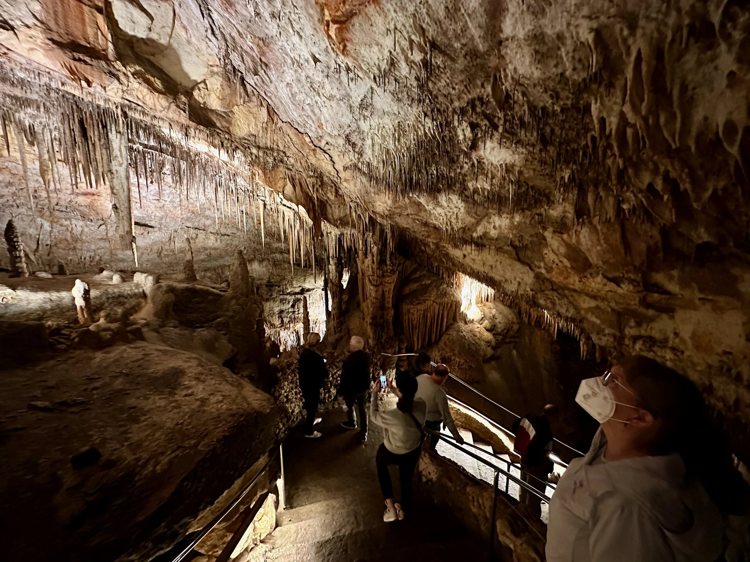 Entering the caves happened when the required number of quests were assembled in the holding area. Then we all advanced into the caves to work our way down the many flights of stairs fashioned into the rock either by carving or the forming of concrete. We fell to the back of the group so we could view the outstanding formations without the clutter of all the other people. Sure we missed the technical discussion from the guide, but we were more interested just in the pure beauty before us. With close ties to several geologists, we hardly needed to learn from the guide. Besides, this wasn’t our first cave experience. We had been in caves in Japan and America.