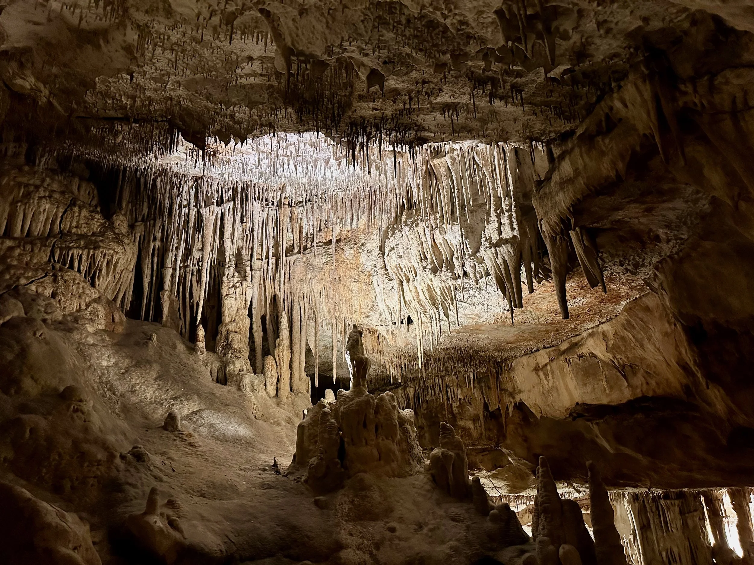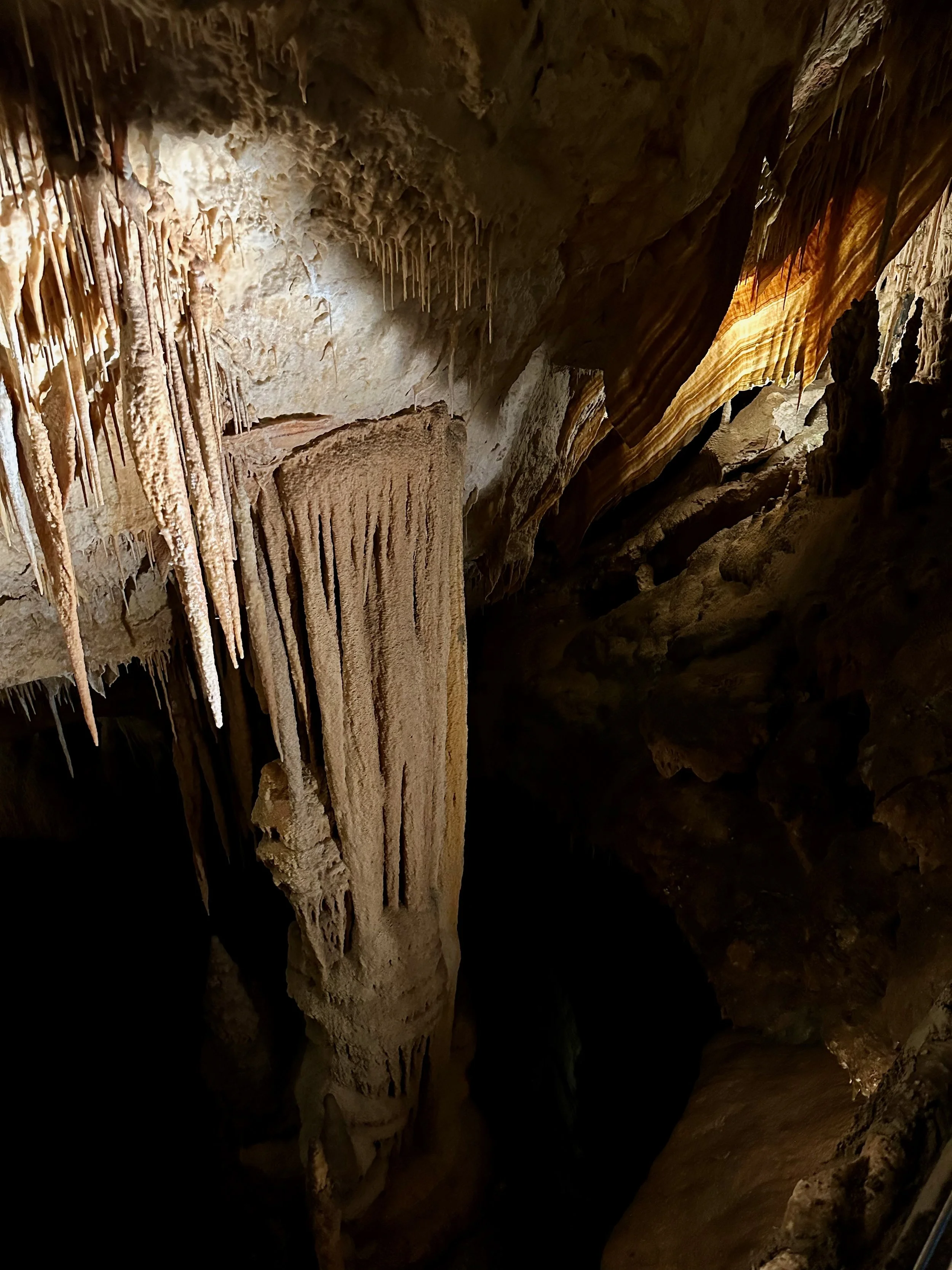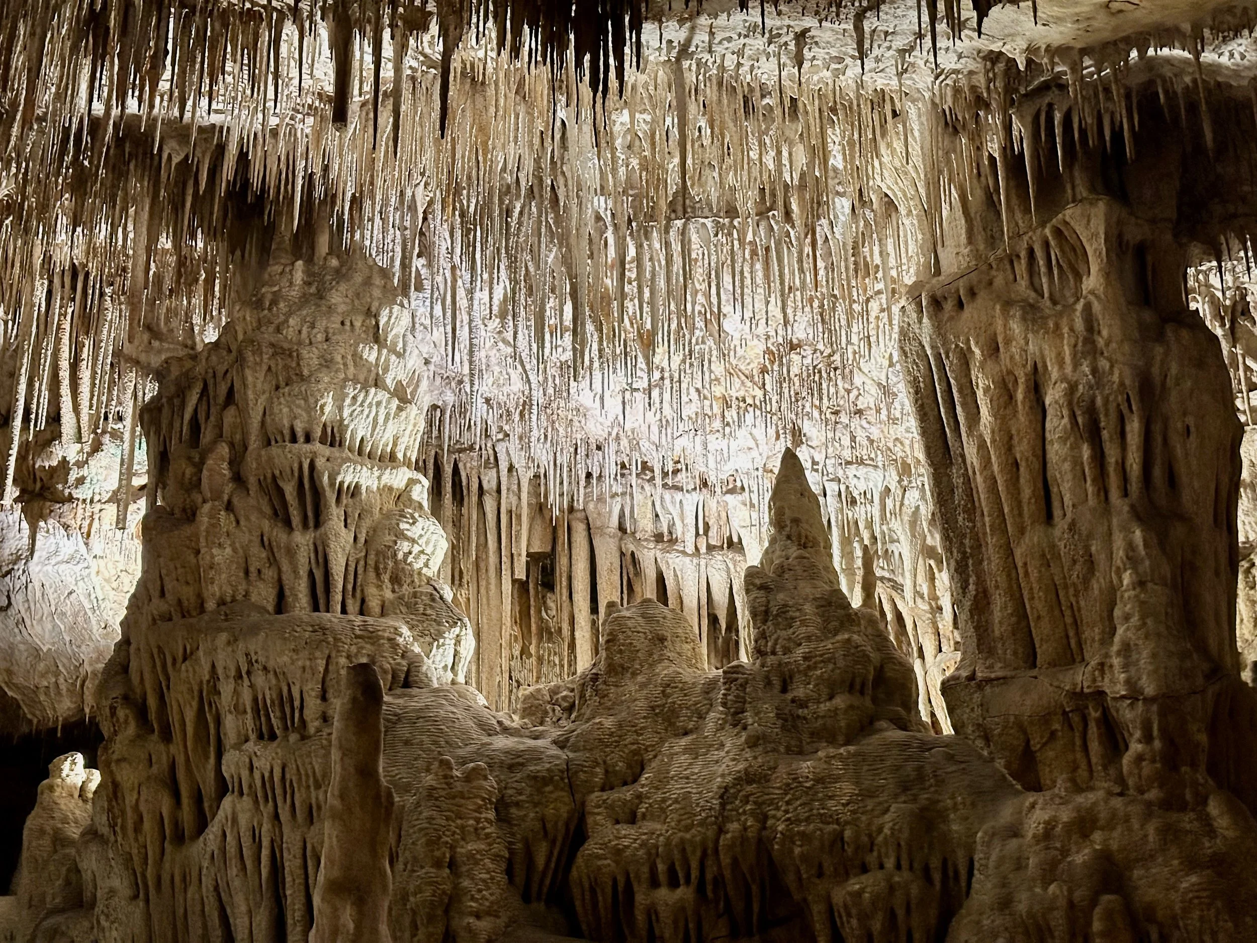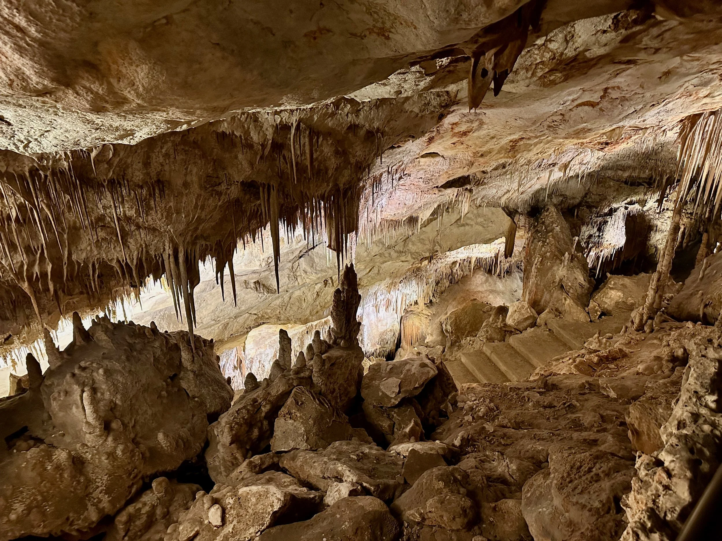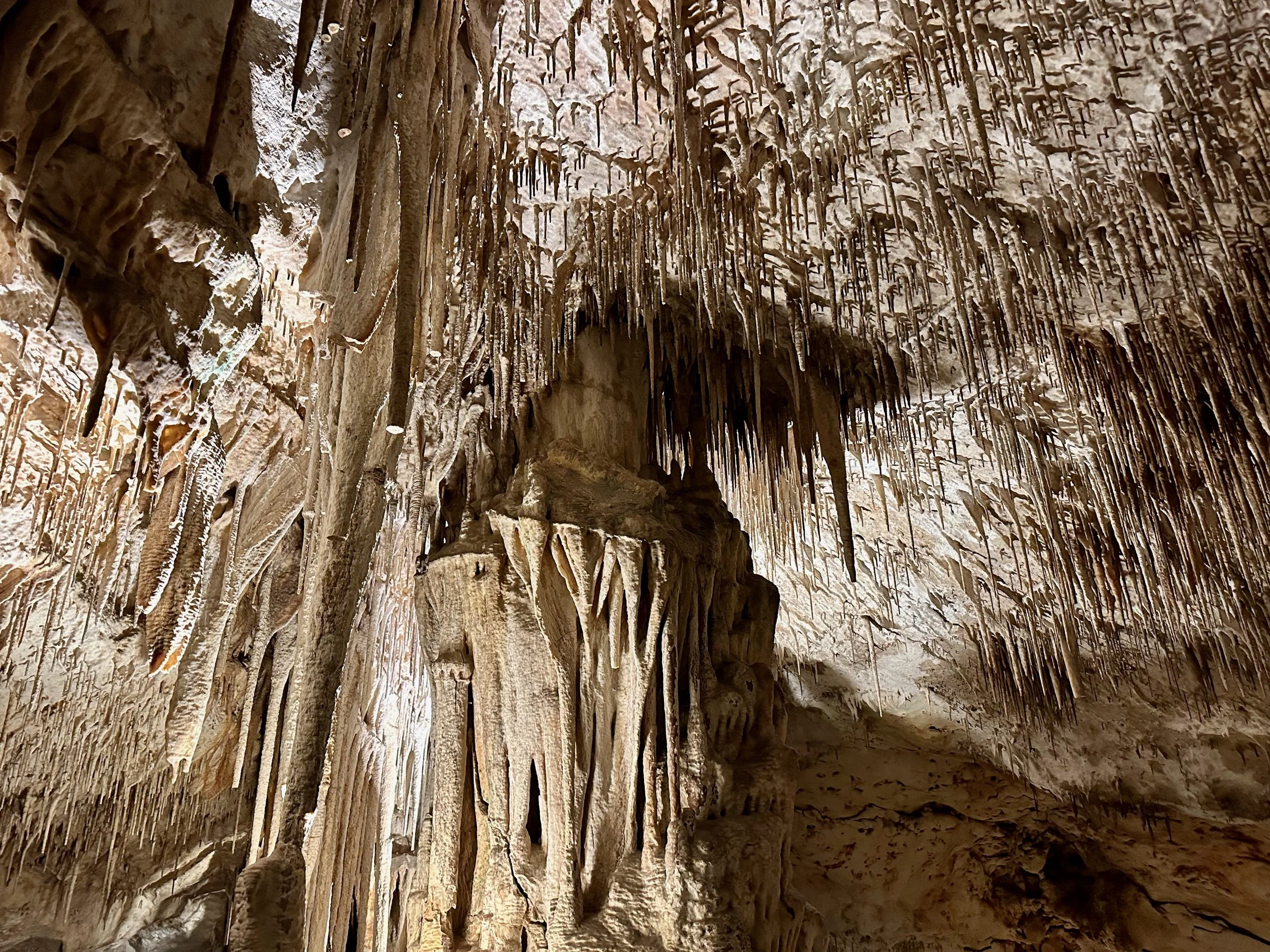 Entering the caves happened when the required number of quests were assembled in the holding area. Then we all advanced into the caves to work our way down the many flights of stairs fashioned into the rock either by carving or the forming of concrete. We fell to the back of the group so we could view the outstanding formations without the clutter of all the other people. Sure we missed the technical discussion from the guide, but we were more interested just in the pure beauty before us. With close ties to several geologists, we hardly needed to learn from the guide. Besides, this wasn’t our first cave experience. We had been in caves in Japan and America.