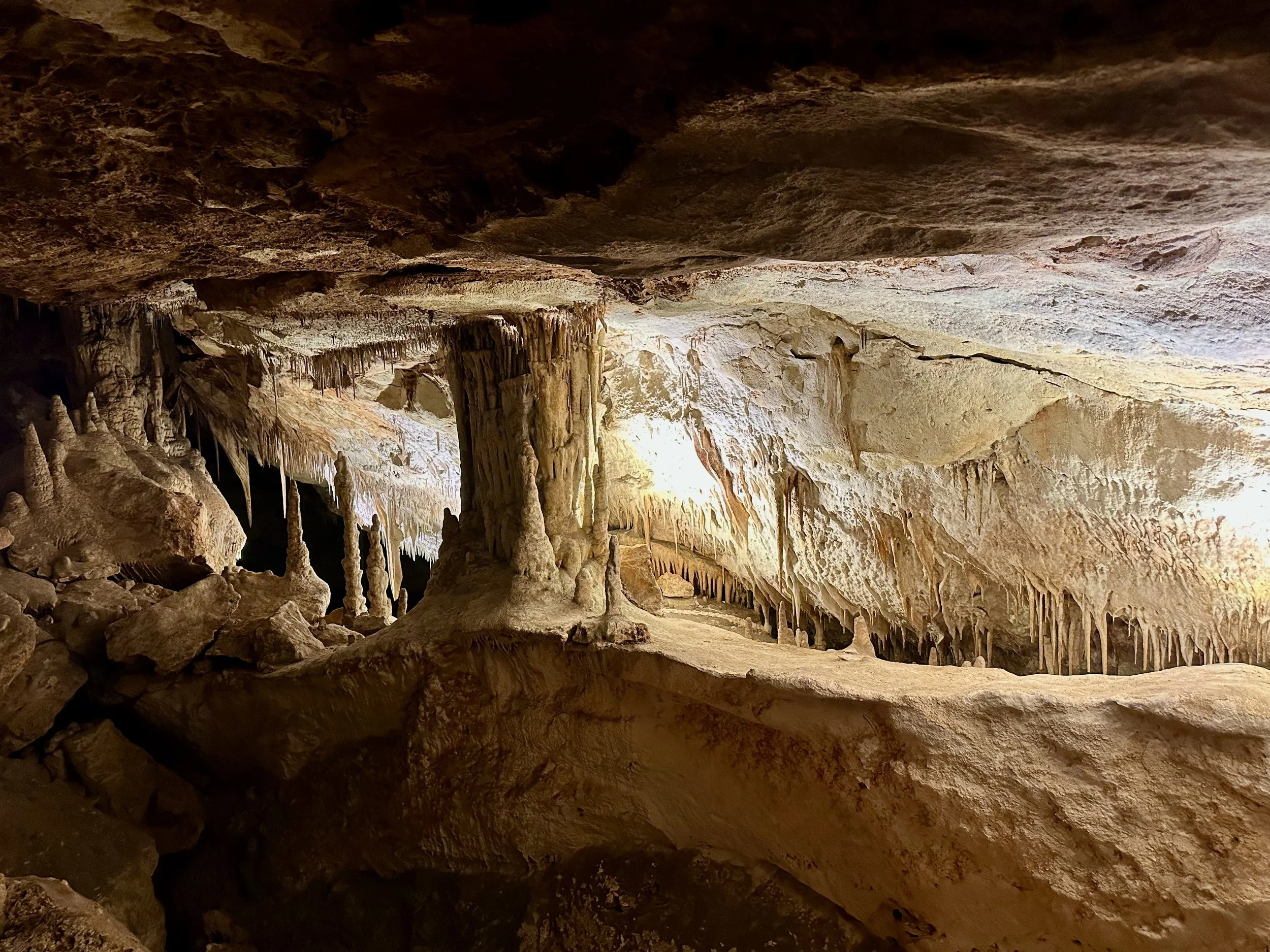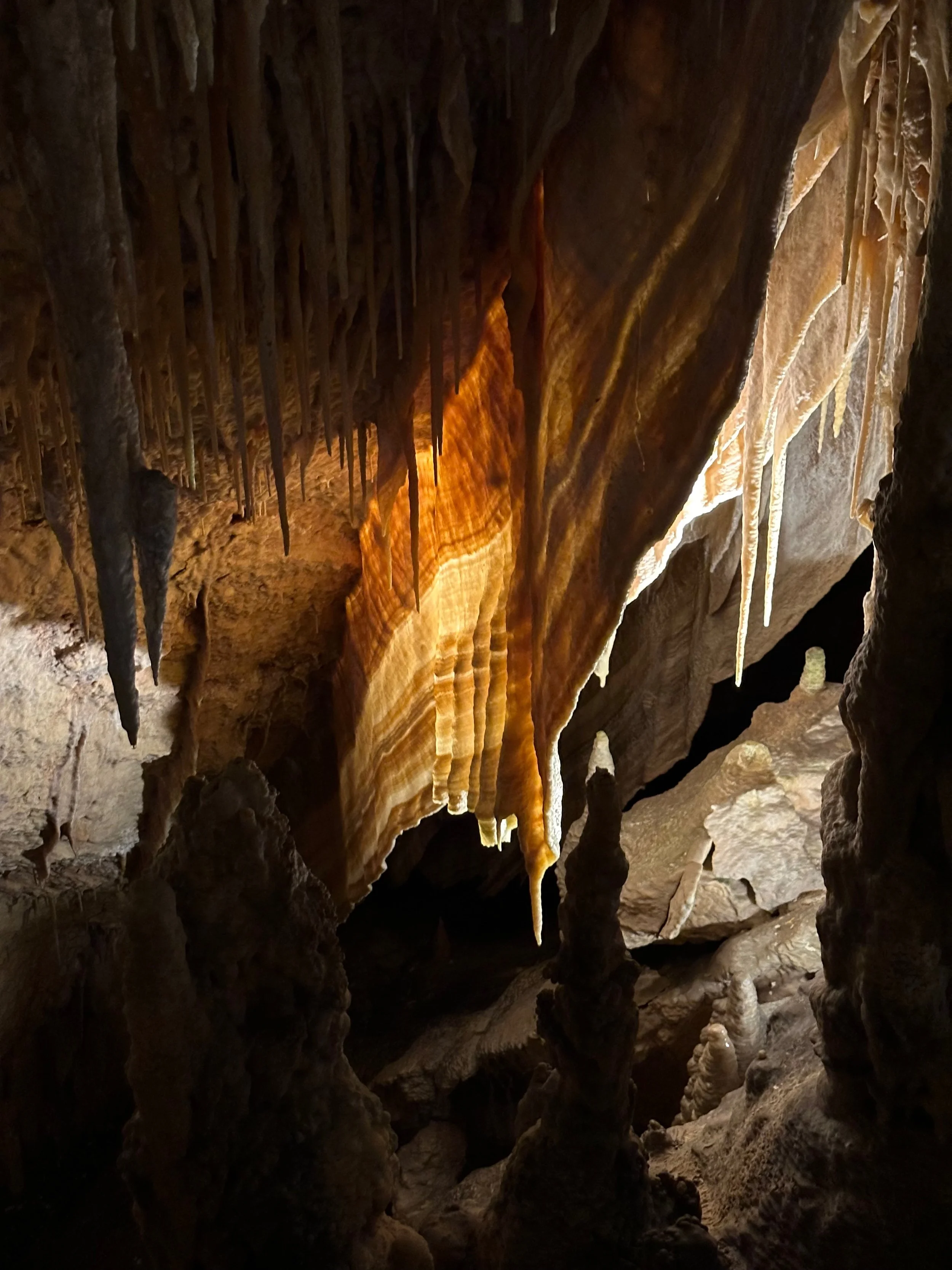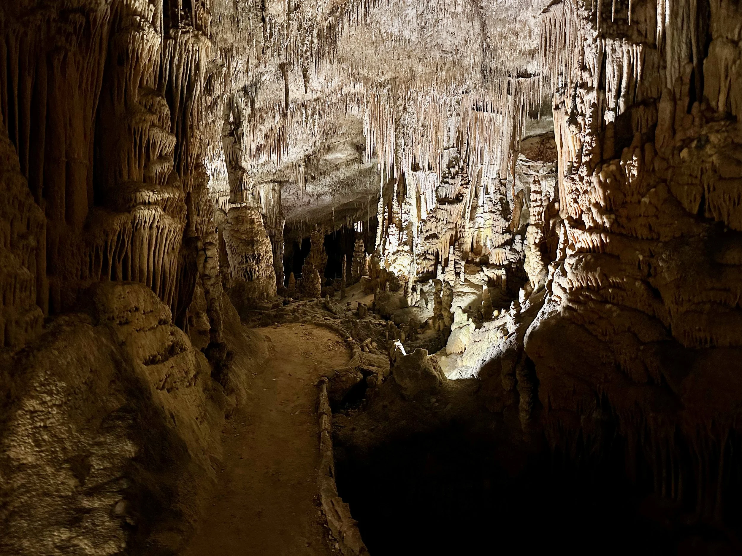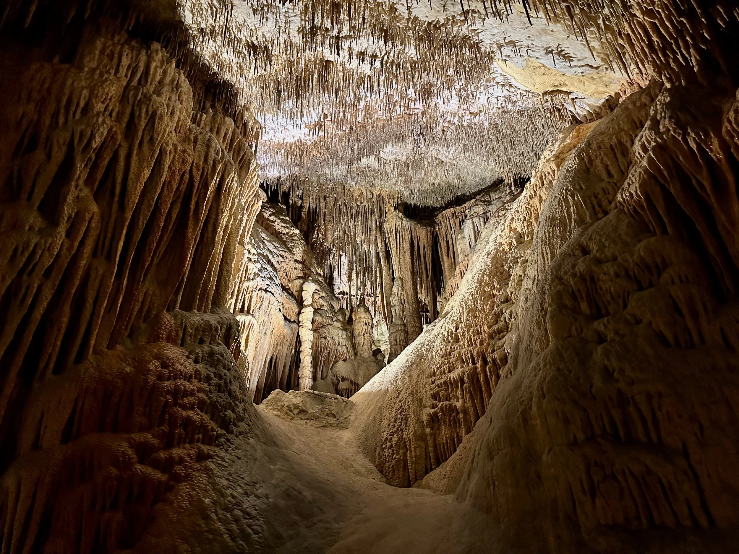 Entering the caves happened when the required number of quests were assembled in the holding area. Then we all advanced into the caves to work our way down the many flights of stairs fashioned into the rock either by carving or the forming of concrete. We fell to the back of the group so we could view the outstanding formations without the clutter of all the other people. Sure we missed the technical discussion from the guide, but we were more interested just in the pure beauty before us. With close ties to several geologists, we hardly needed to learn from the guide. Besides, this wasn’t our first cave experience. We had been in caves in Japan and America.