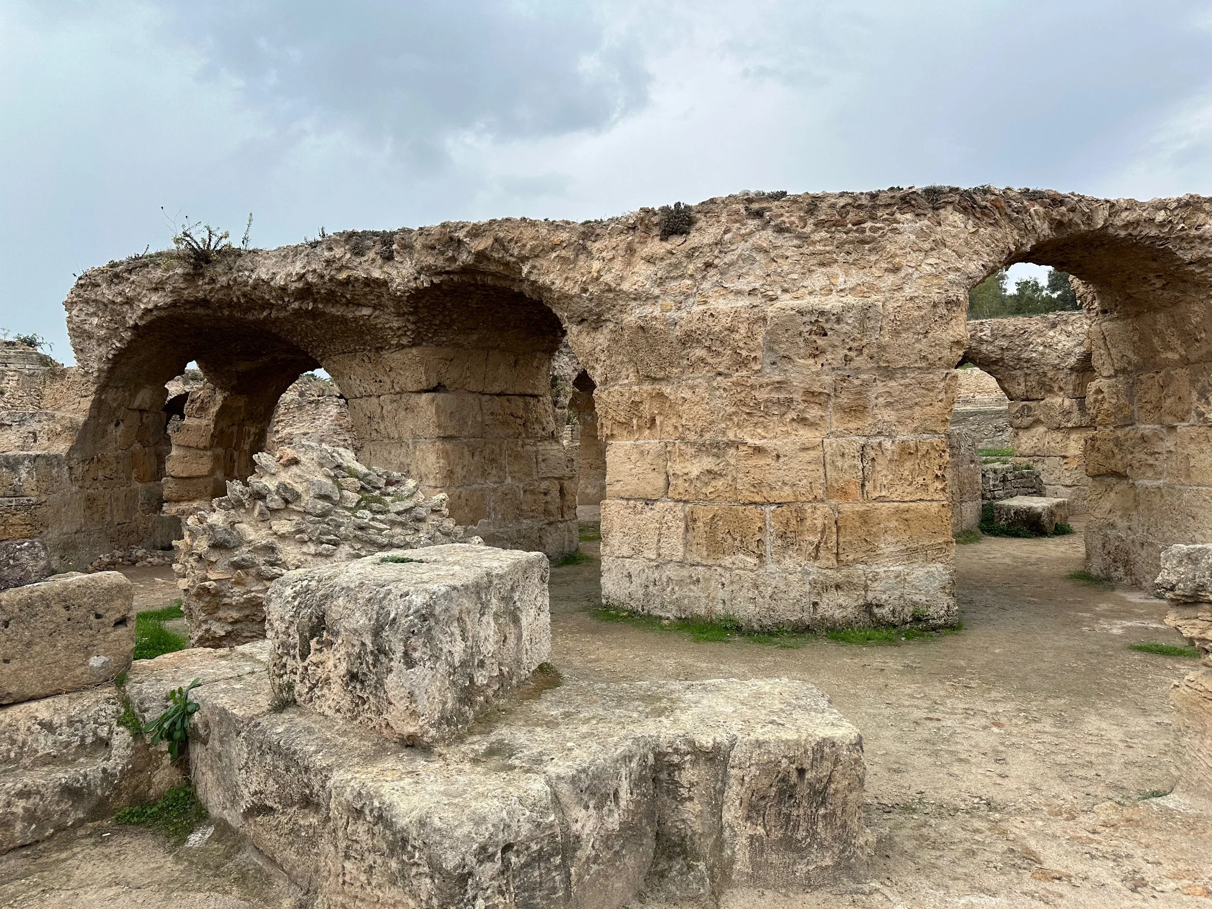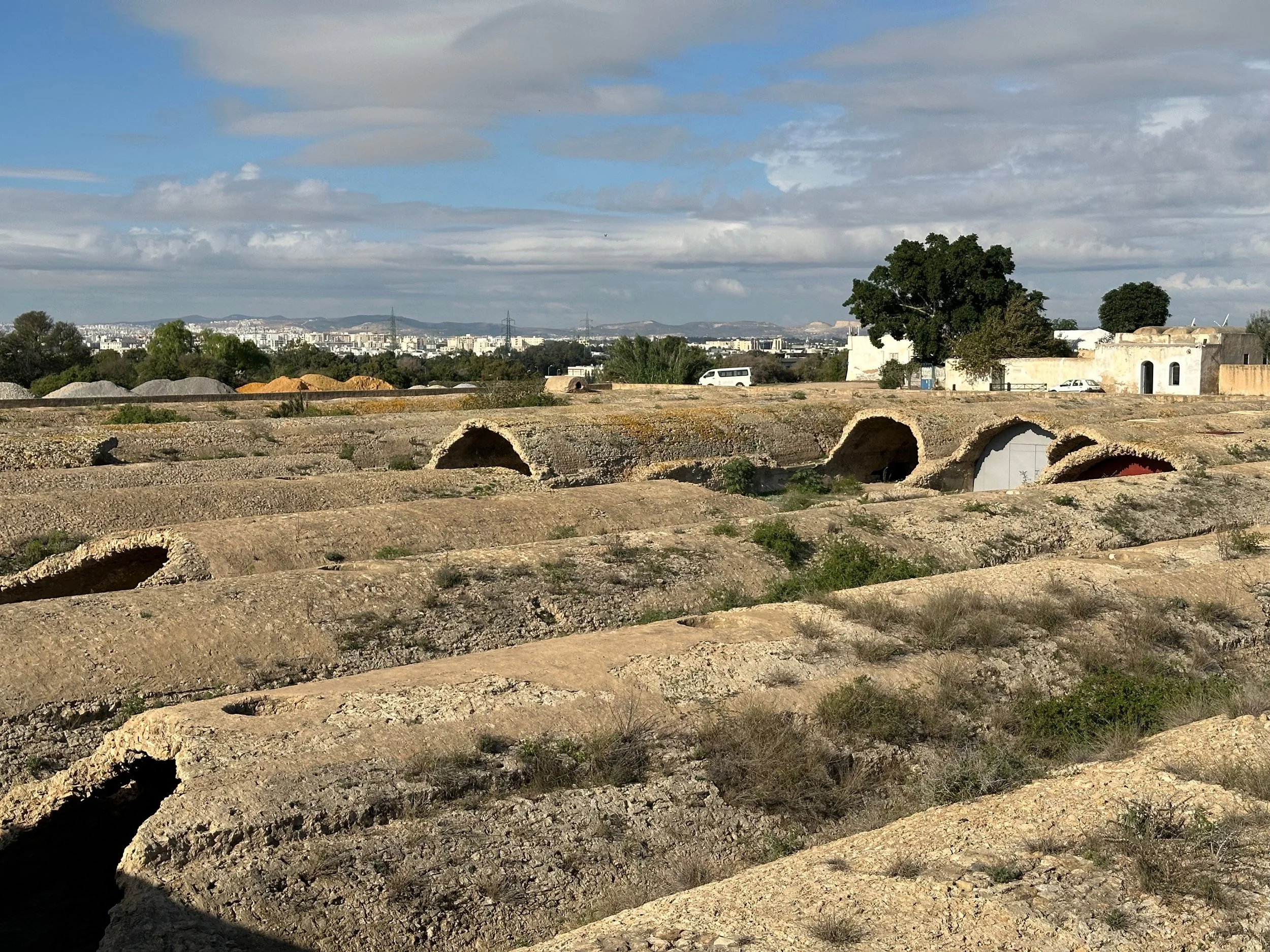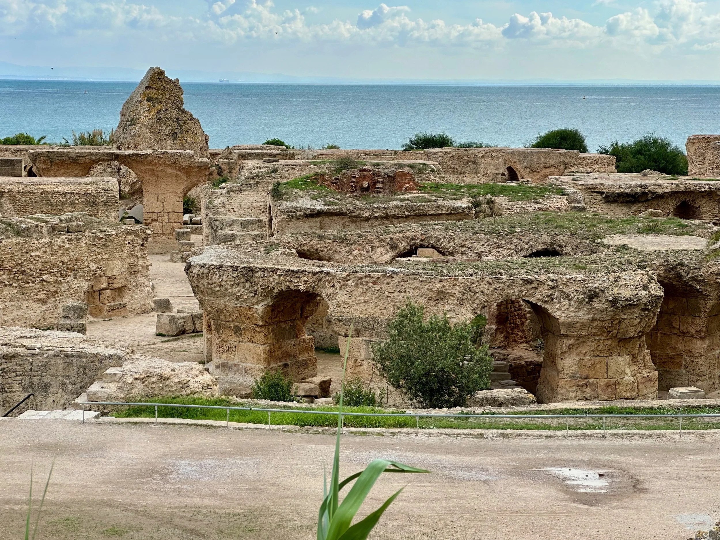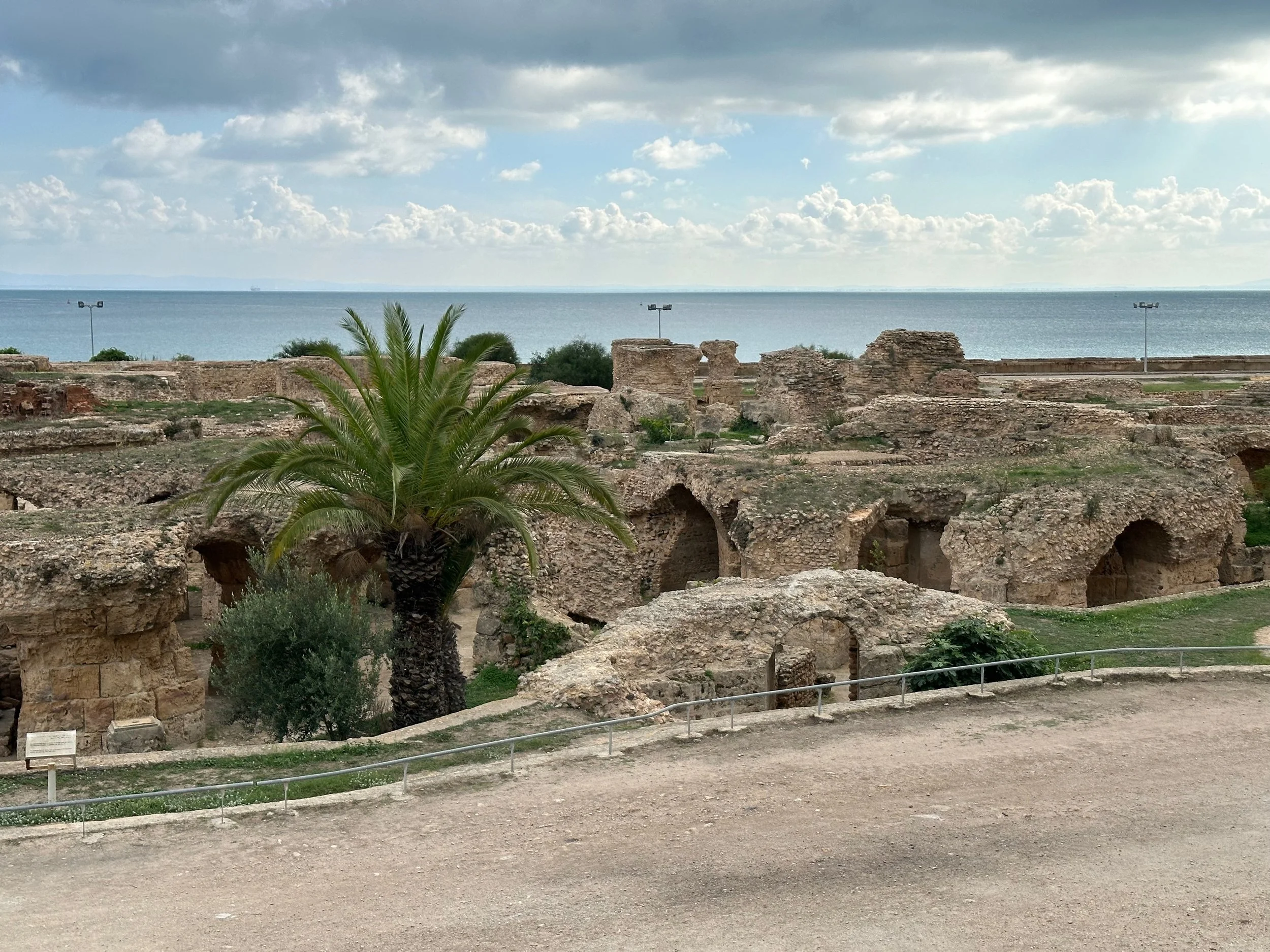 The day started by warming up with stops of some archeological and religious interest such as a field depository of ancient carved wall stones, the Mosquée Malik ibn Anas Carthage, and the Cisterns of La Malga, an ancient facility for storing and routing water for the early Carthaginians. From there we went to a hillside town for shopping, carefully orchestrated by the guide so we ended up in his buddy’s store claiming all the items were “government guaranteed”, and finally to a hilltop for views of the Mediterranean before backtracking to the Baths of Antonin.