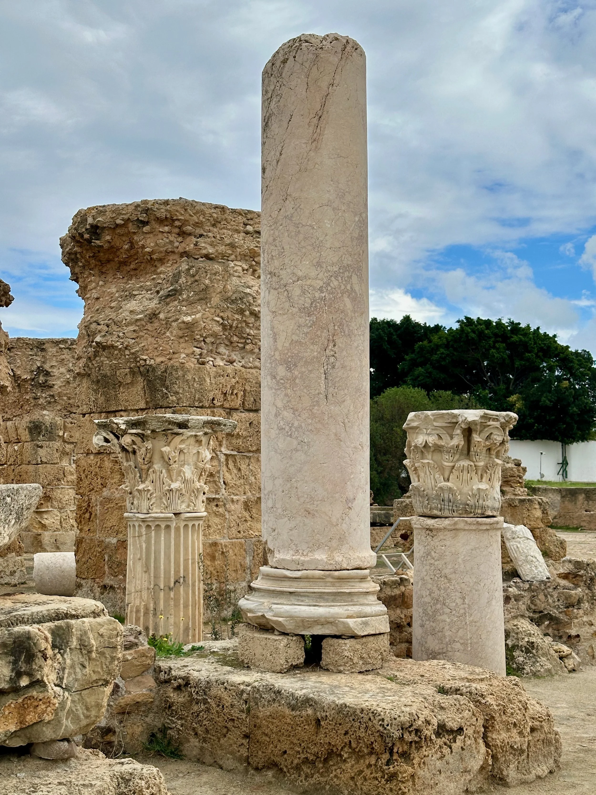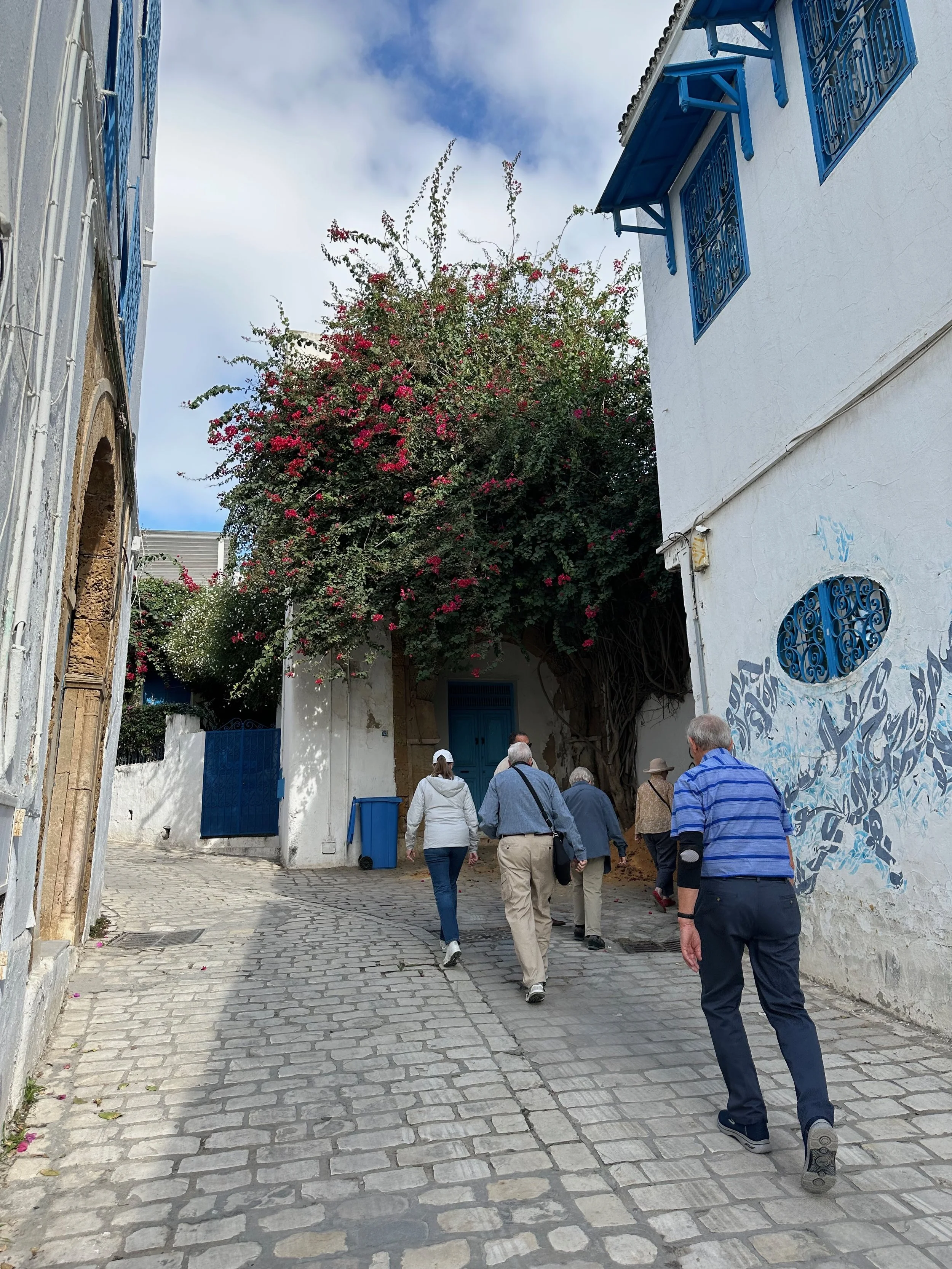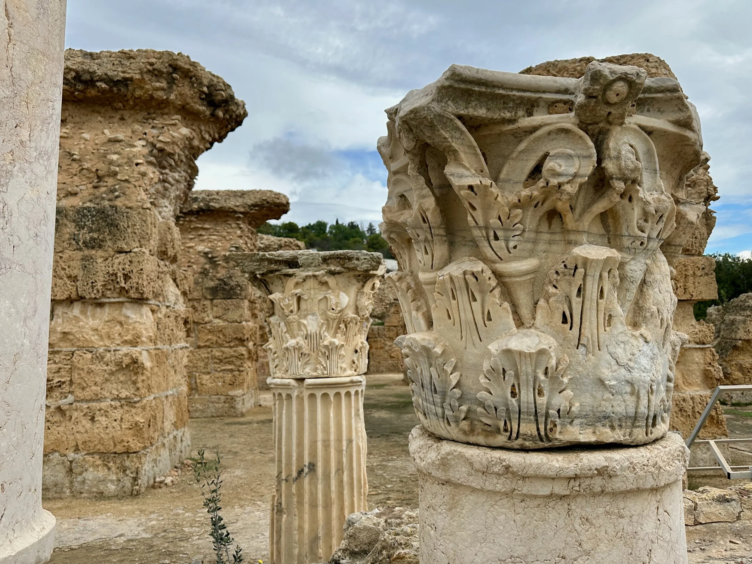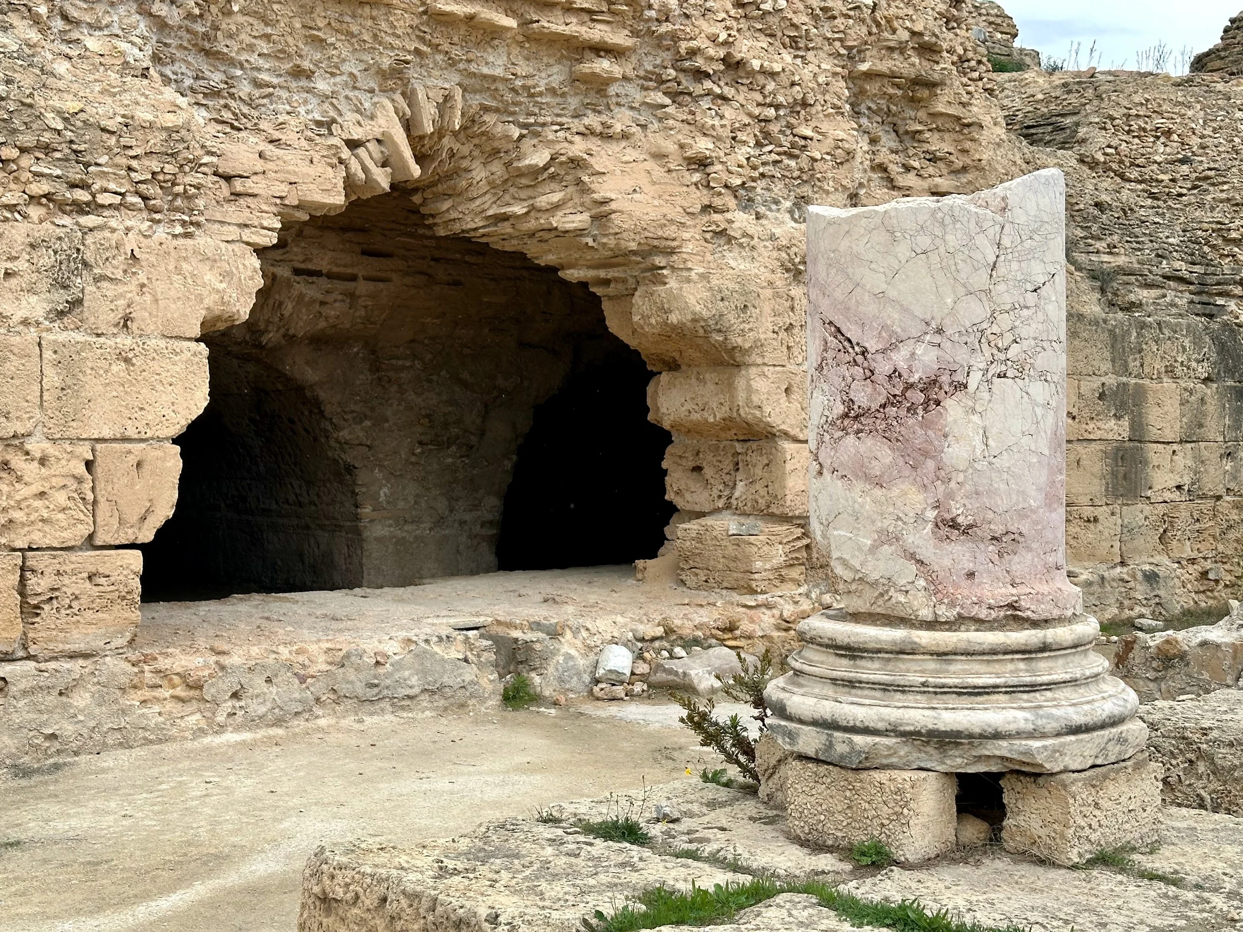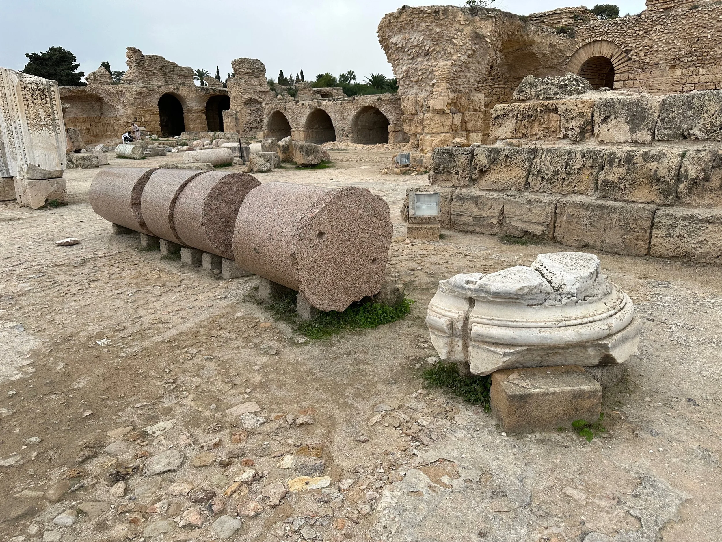 The day started by warming up with stops of some archeological and religious interest such as a field depository of ancient carved wall stones, the Mosquée Malik ibn Anas Carthage, and the Cisterns of La Malga, an ancient facility for storing and routing water for the early Carthaginians. From there we went to a hillside town for shopping, carefully orchestrated by the guide so we ended up in his buddy’s store claiming all the items were “government guaranteed”, and finally to a hilltop for views of the Mediterranean before backtracking to the Baths of Antonin.