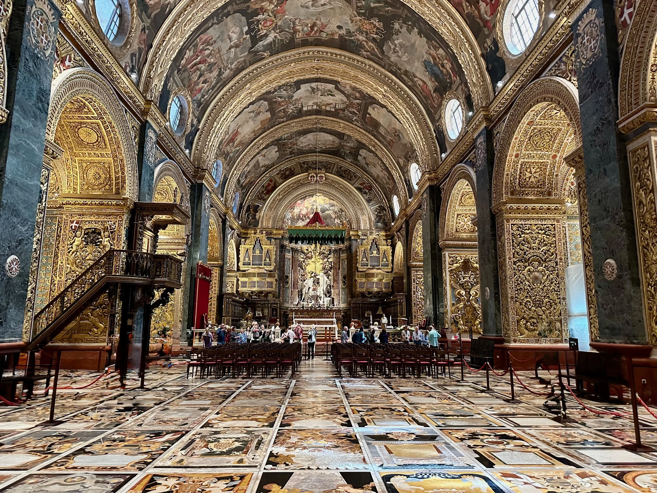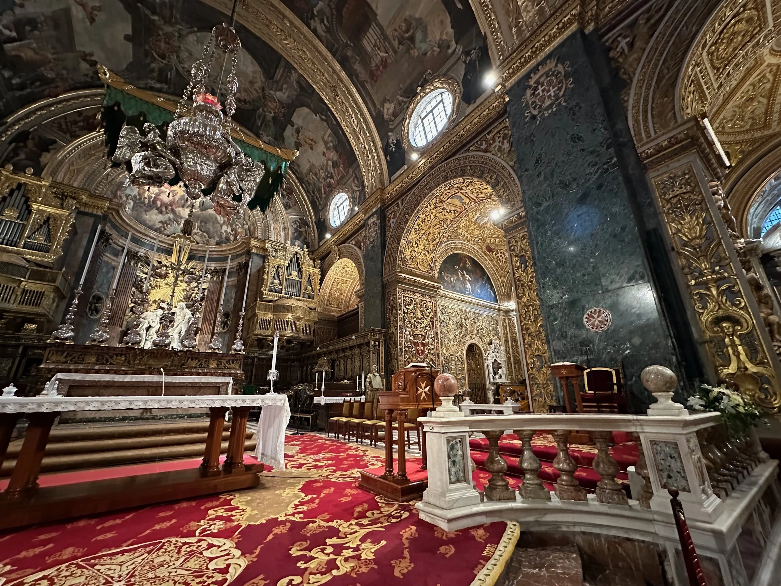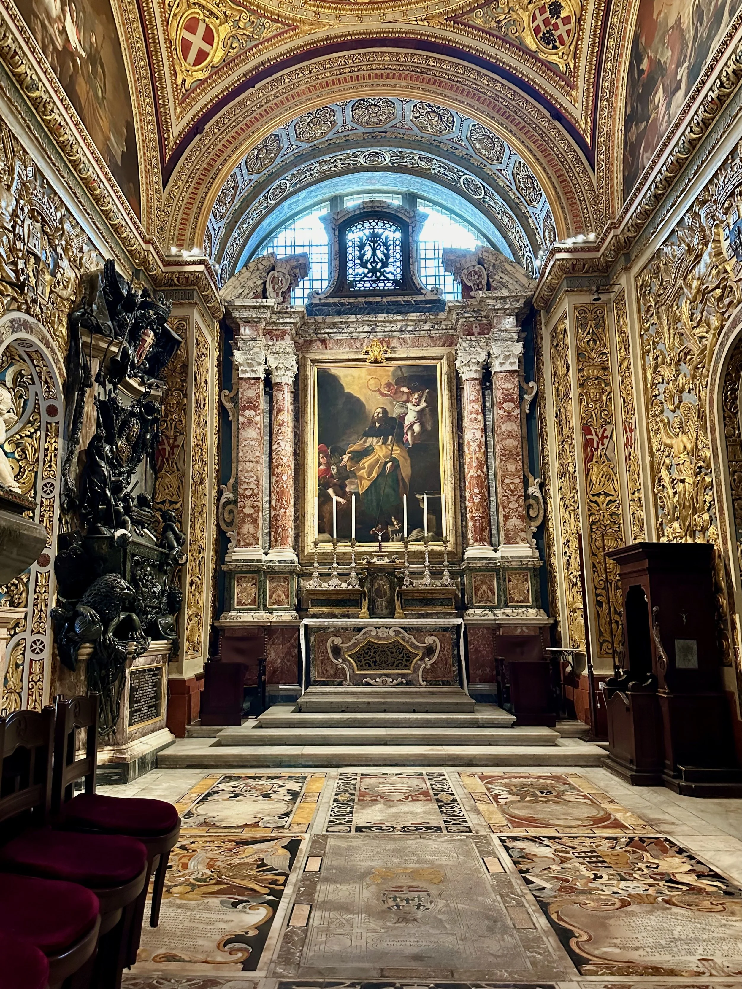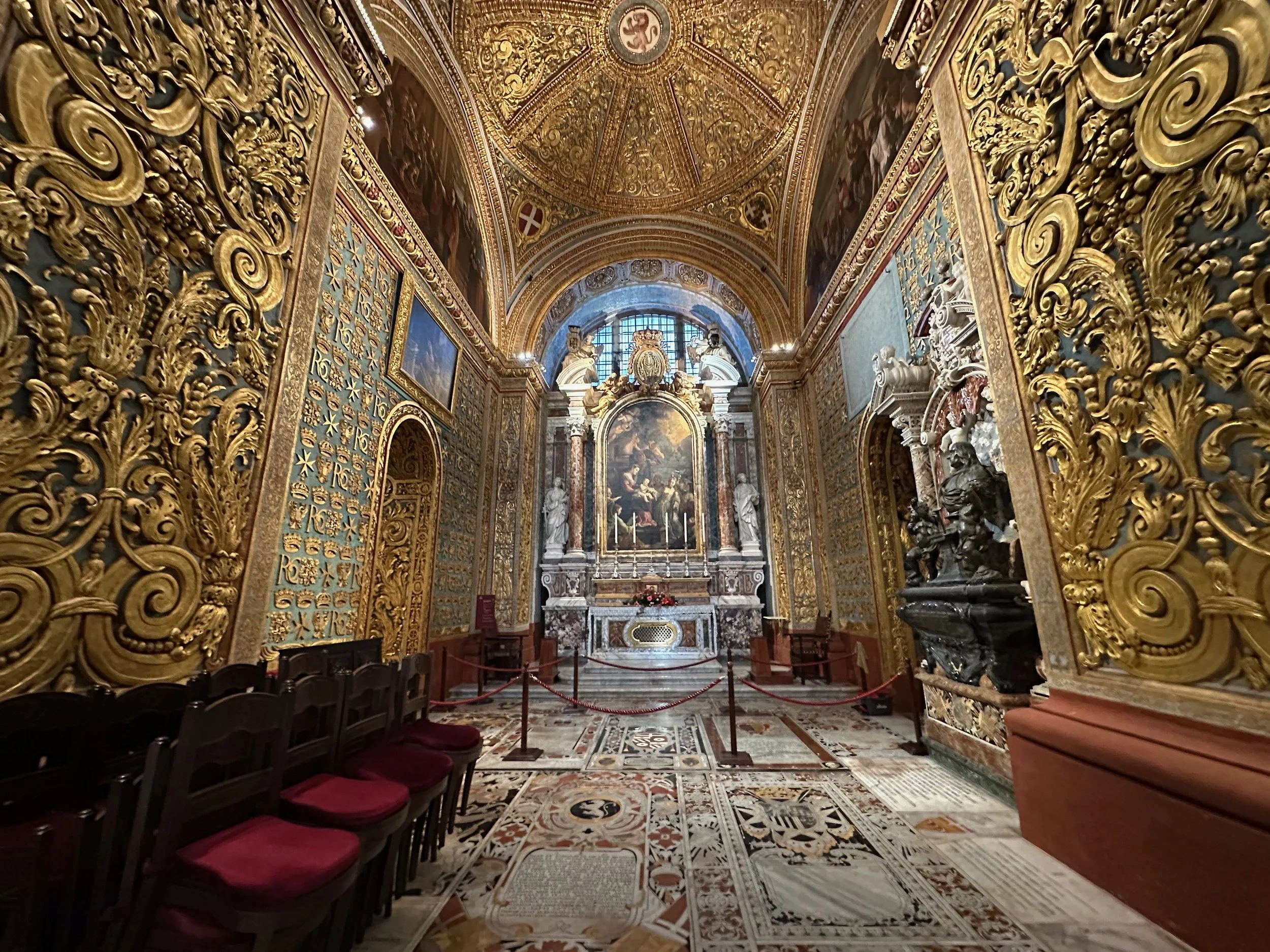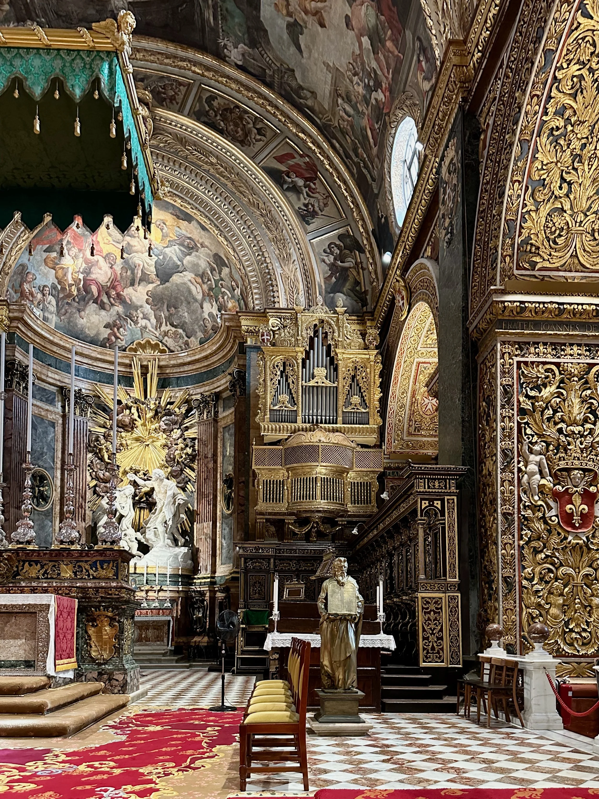 The interior of the cathedral doesn’t have a single unadorned surface. Not the walls, floors or ceiling. If they aren’t covered with intricate carvings gilded in gold, then they are smooth marble or painted with incredible frescos depicting all manner of historical or divine scenes. Even floor space where tomb covers are possible is covered with exquisite hand woven carpet. Certainly the Order of St. John was immensely profitable to be able to afford such a landmark.
