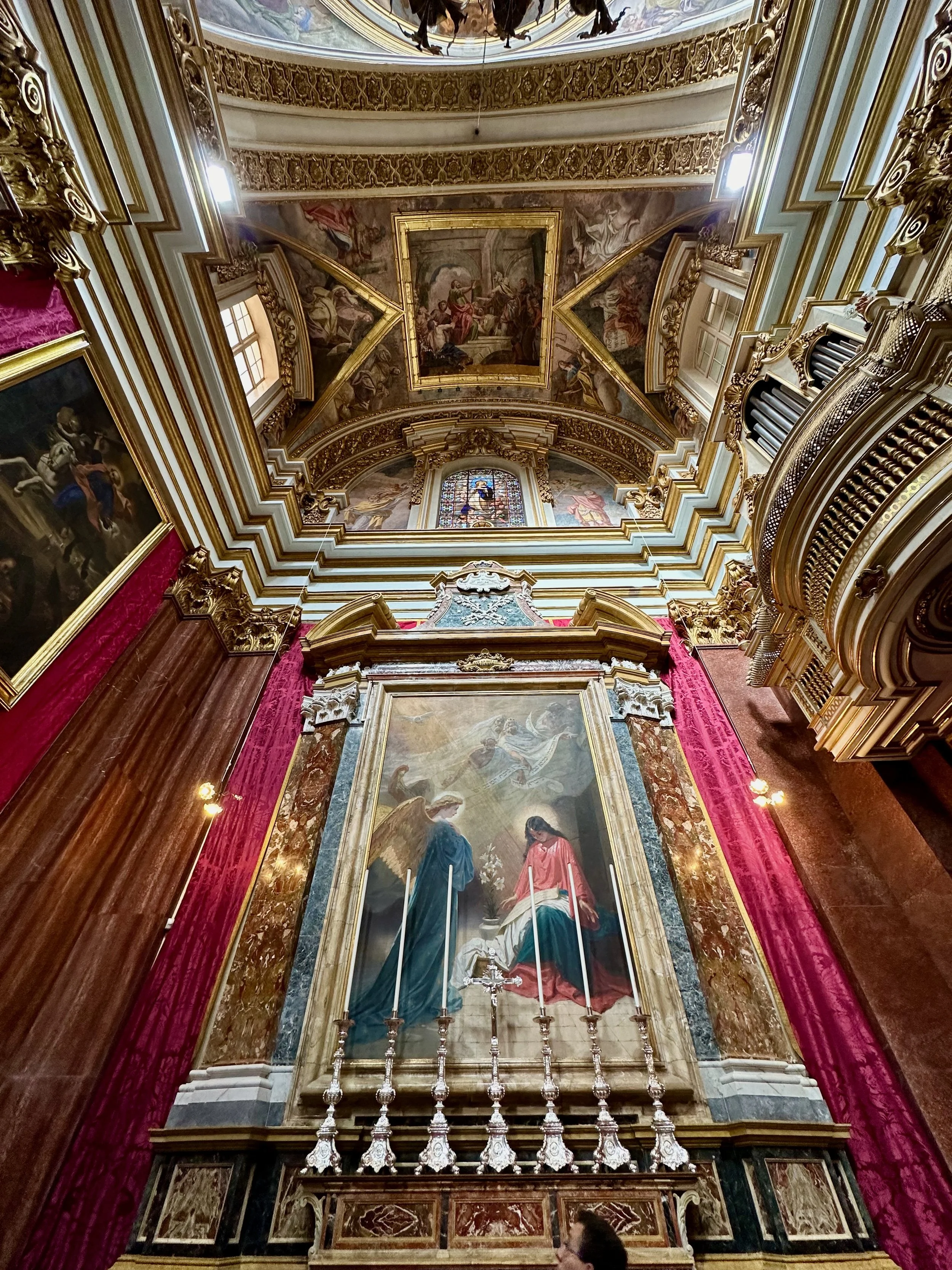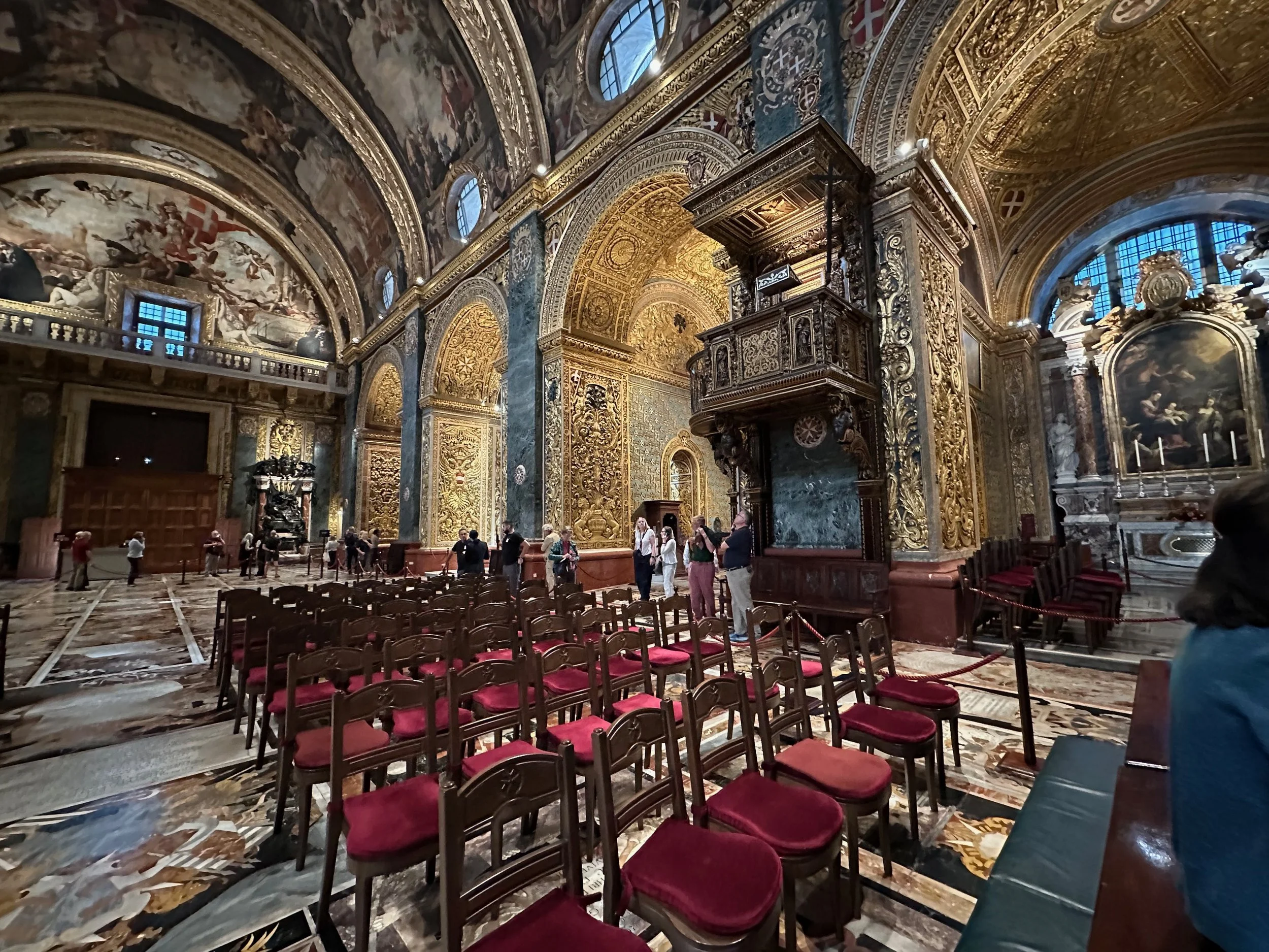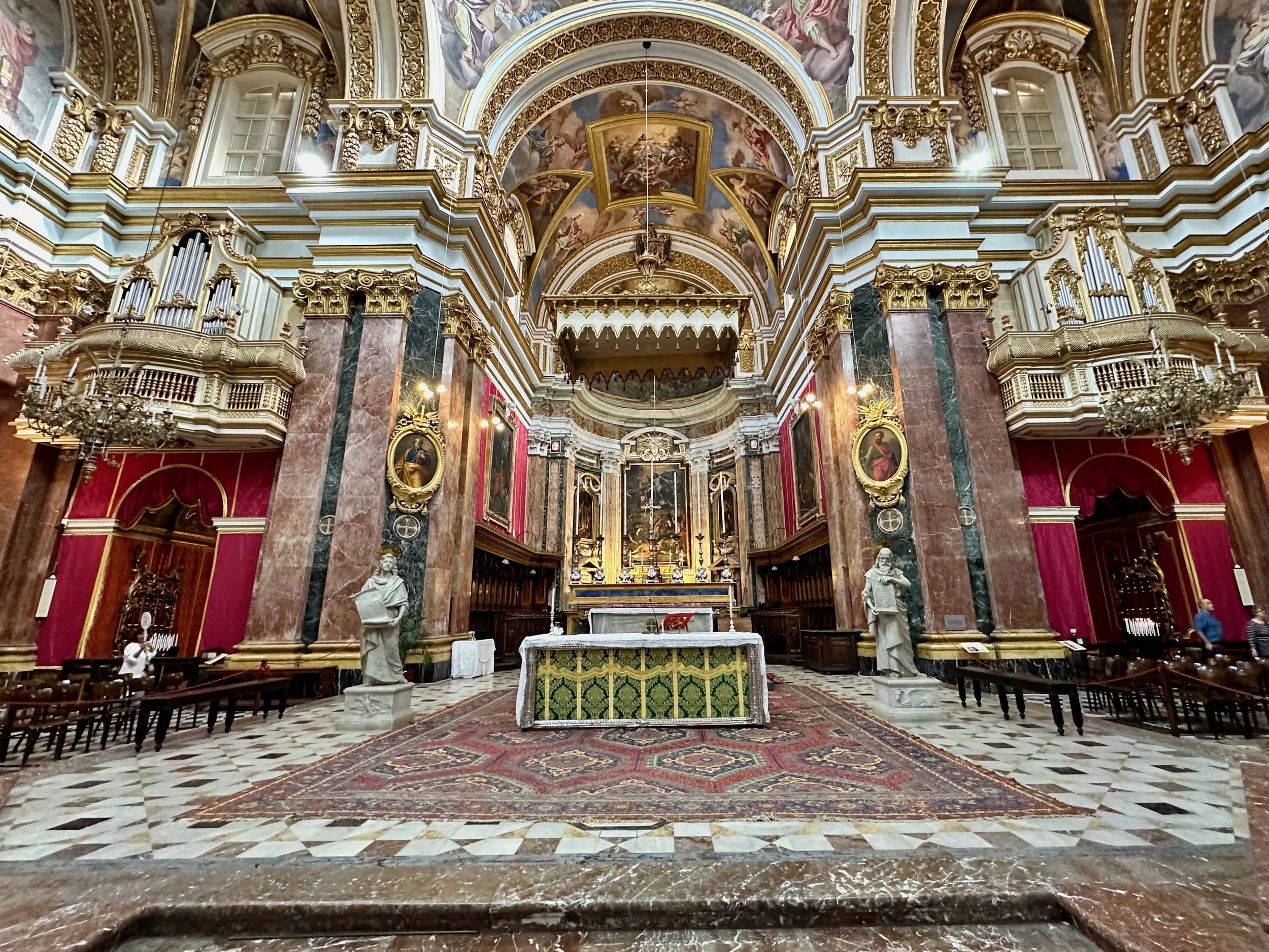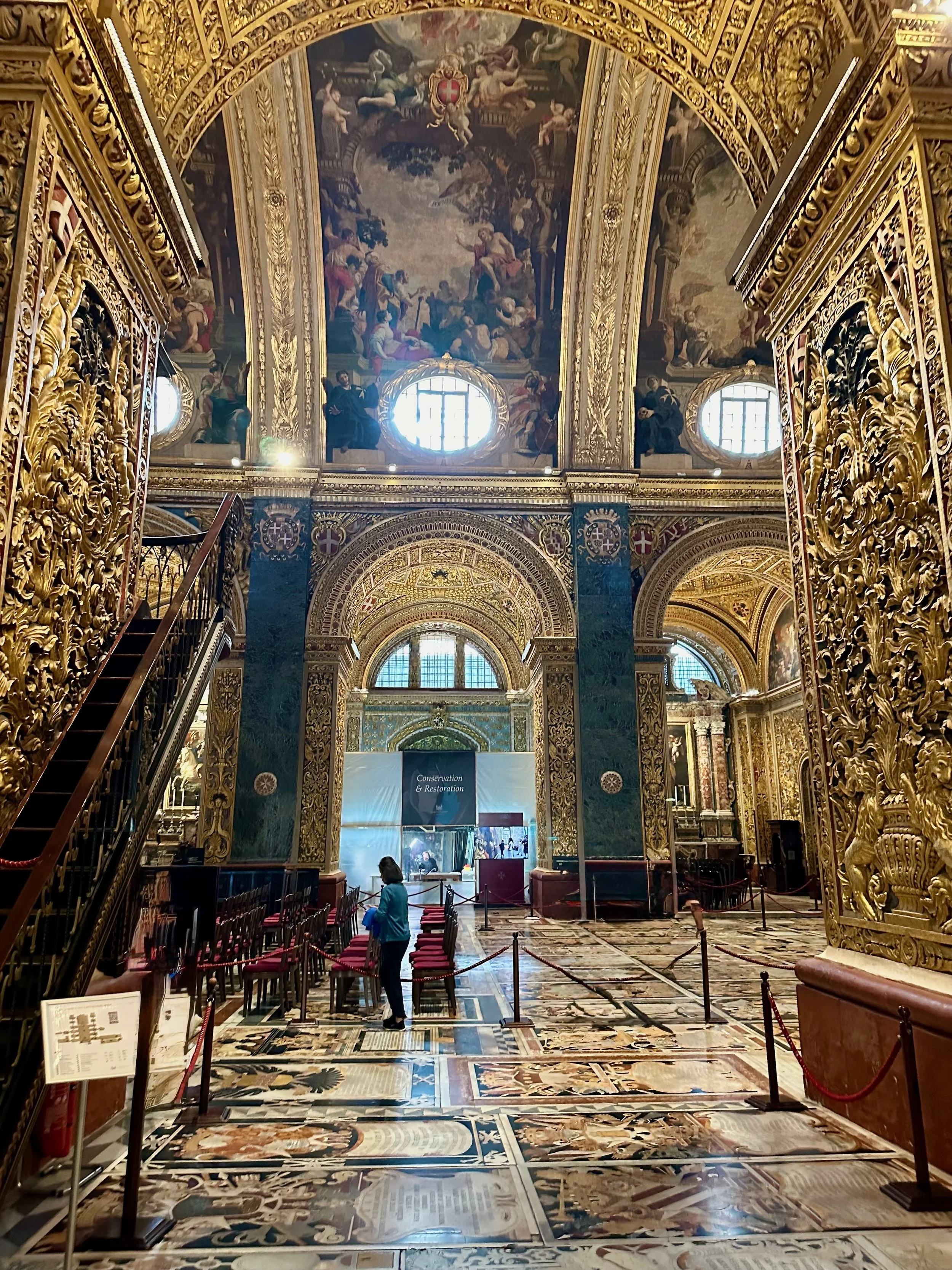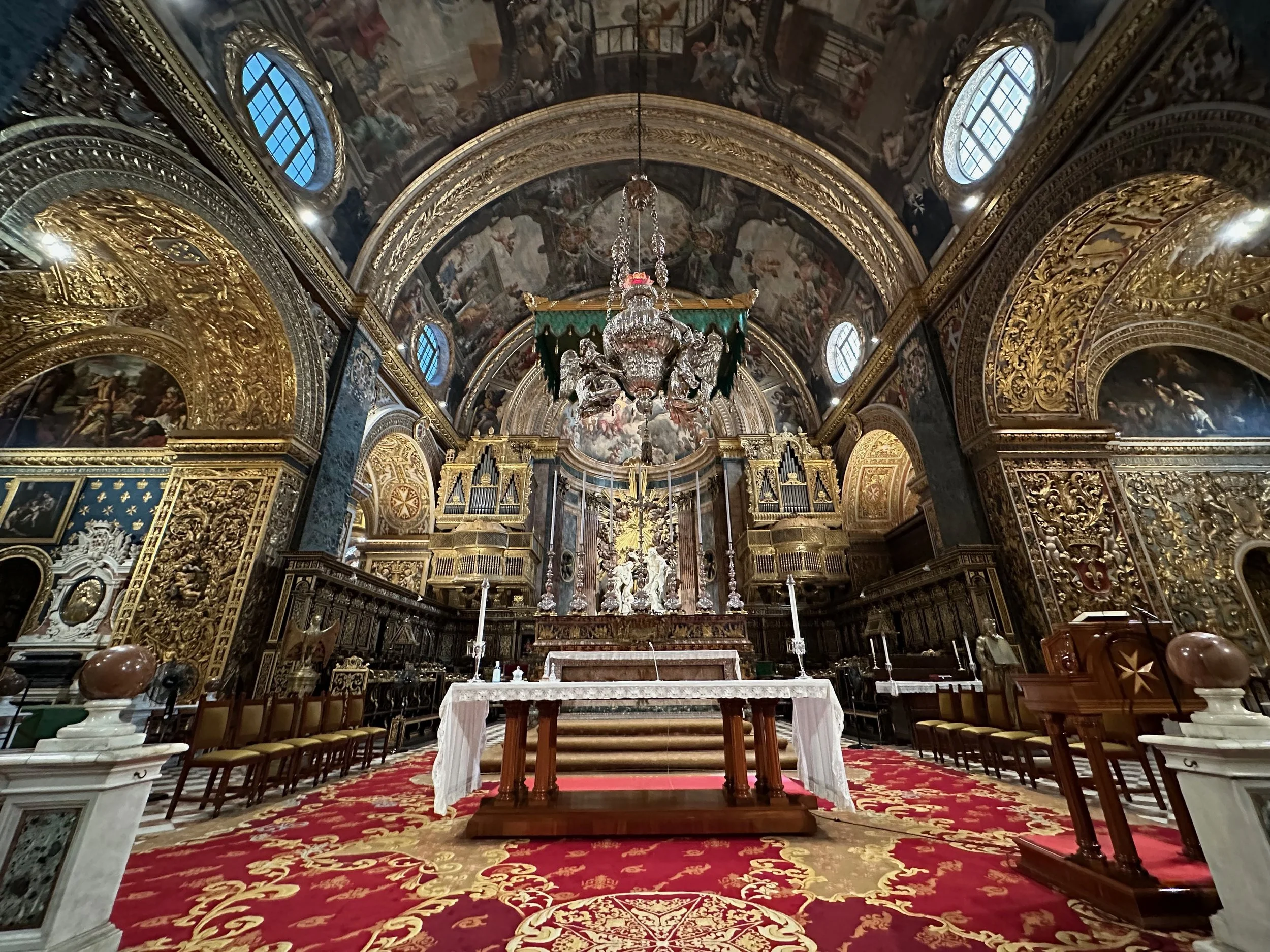 The interior of the cathedral doesn’t have a single unadorned surface. Not the walls, floors or ceiling. If they aren’t covered with intricate carvings gilded in gold, then they are smooth marble or painted with incredible frescos depicting all manner of historical or divine scenes. Even floor space where tomb covers are possible is covered with exquisite hand woven carpet. Certainly the Order of St. John was immensely profitable to be able to afford such a landmark.