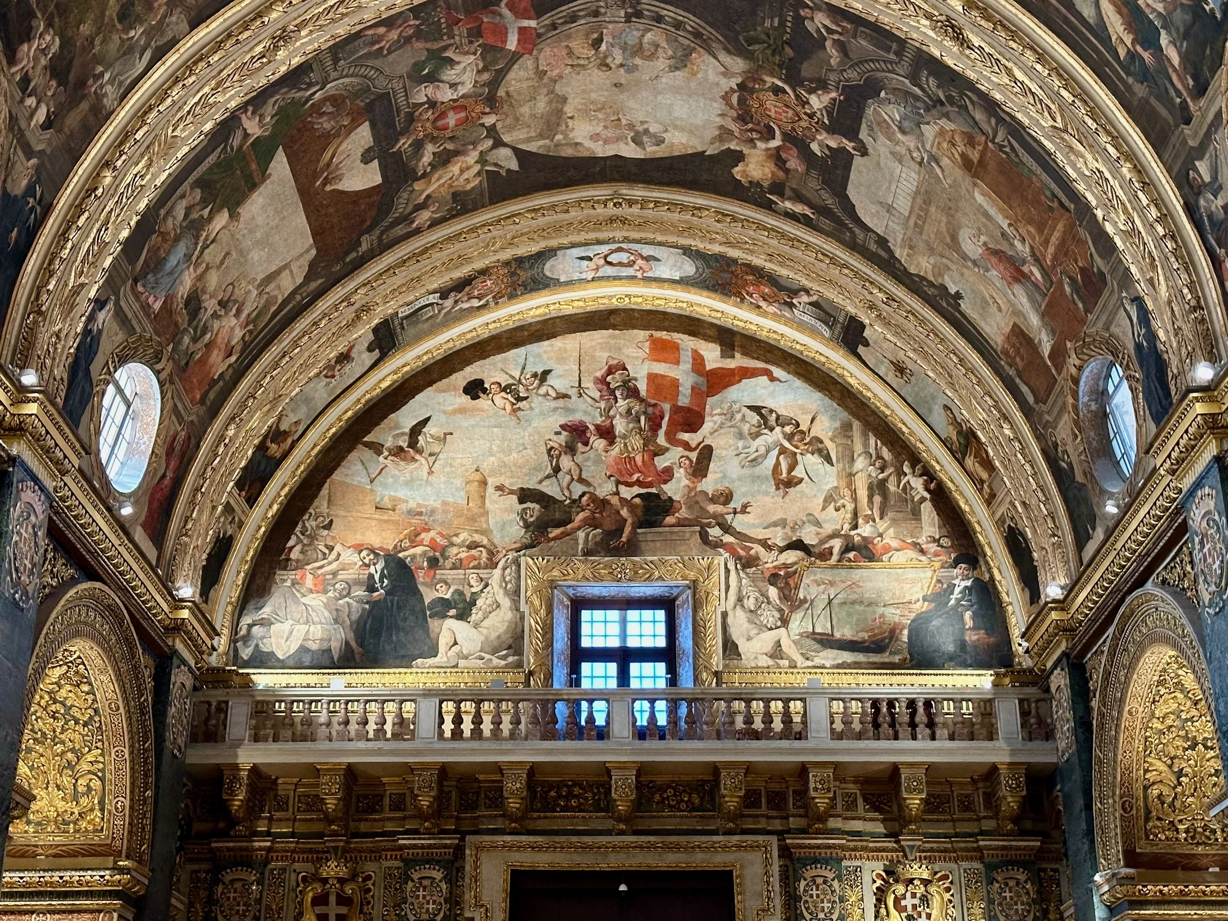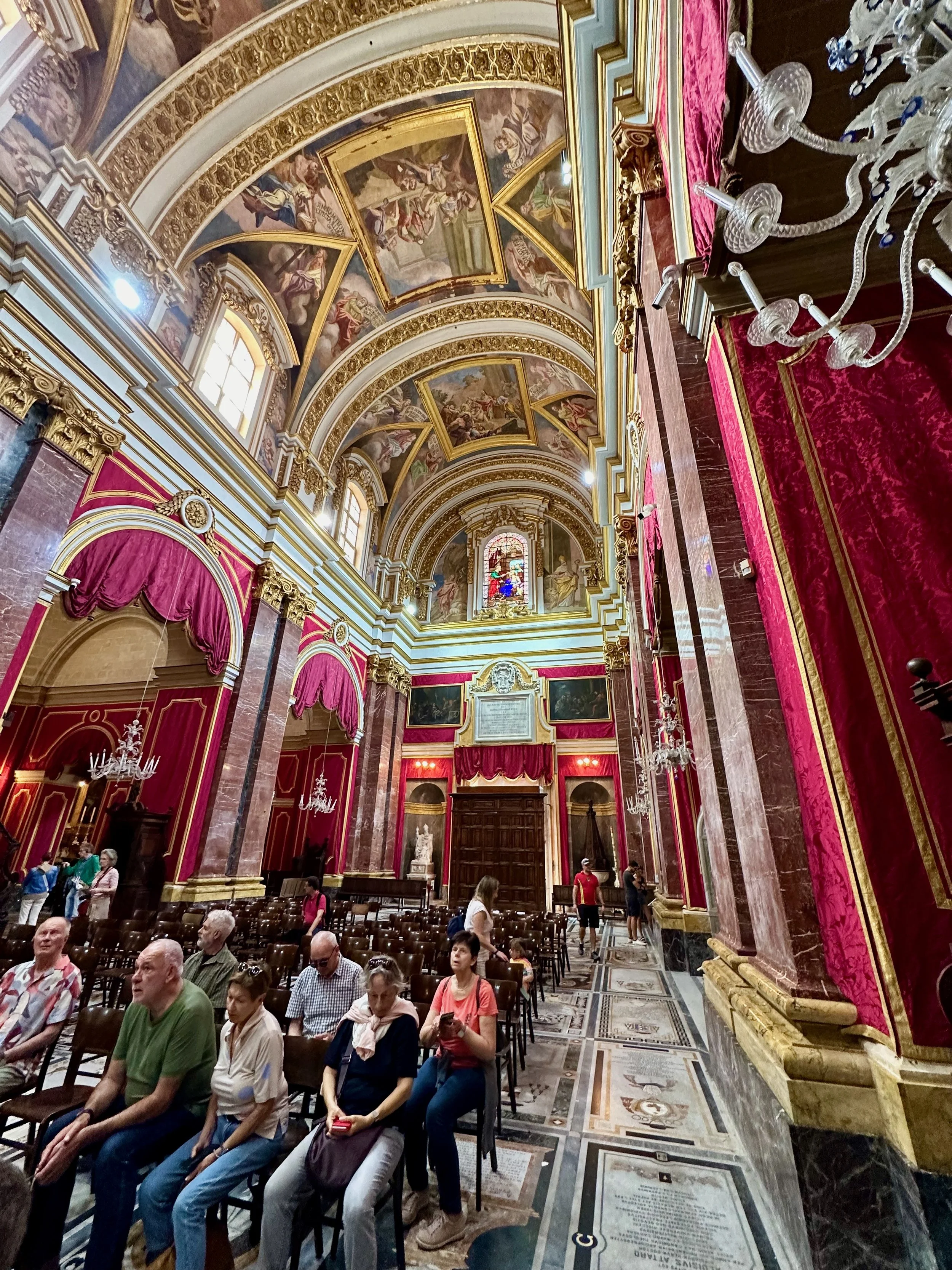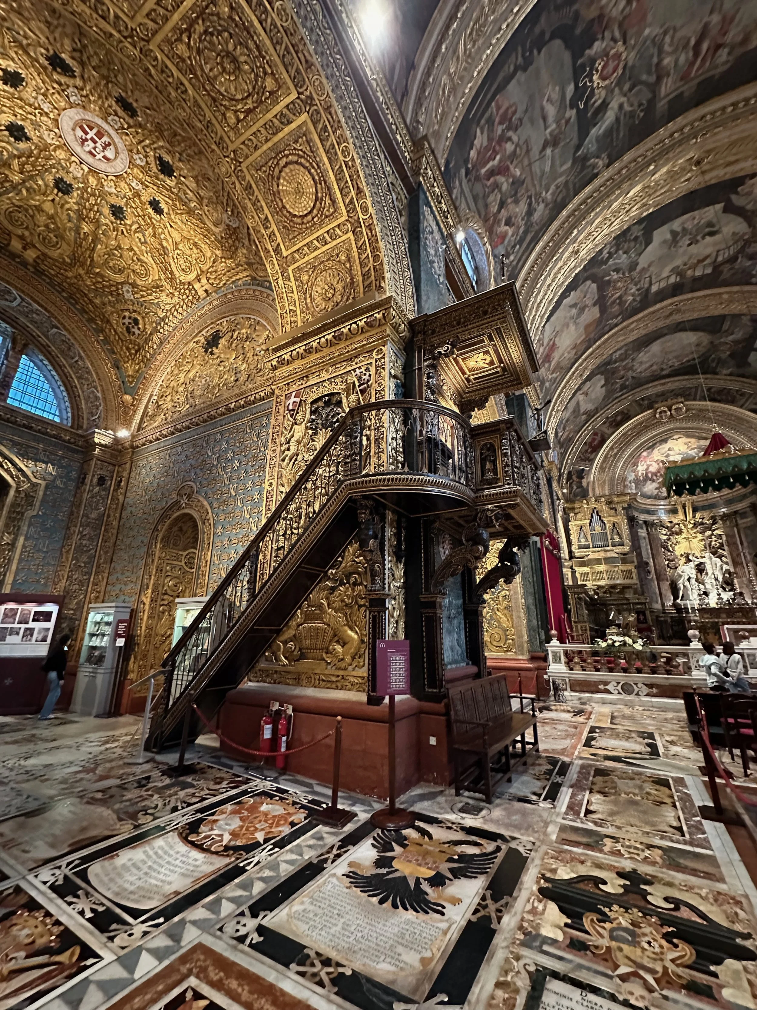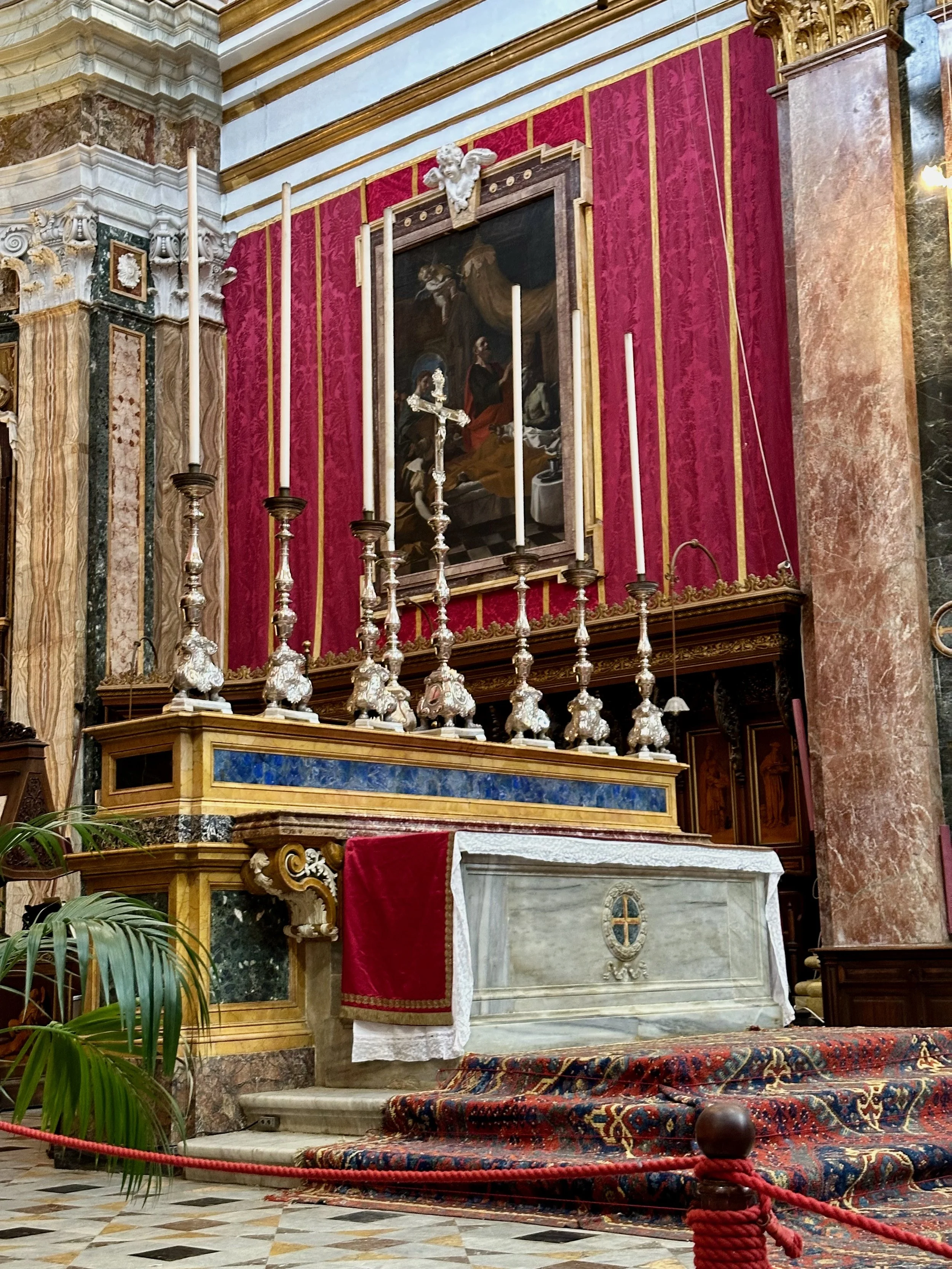 The interior of the cathedral doesn’t have a single unadorned surface. Not the walls, floors or ceiling. If they aren’t covered with intricate carvings gilded in gold, then they are smooth marble or painted with incredible frescos depicting all manner of historical or divine scenes. Even floor space where tomb covers are possible is covered with exquisite hand woven carpet. Certainly the Order of St. John was immensely profitable to be able to afford such a landmark.
