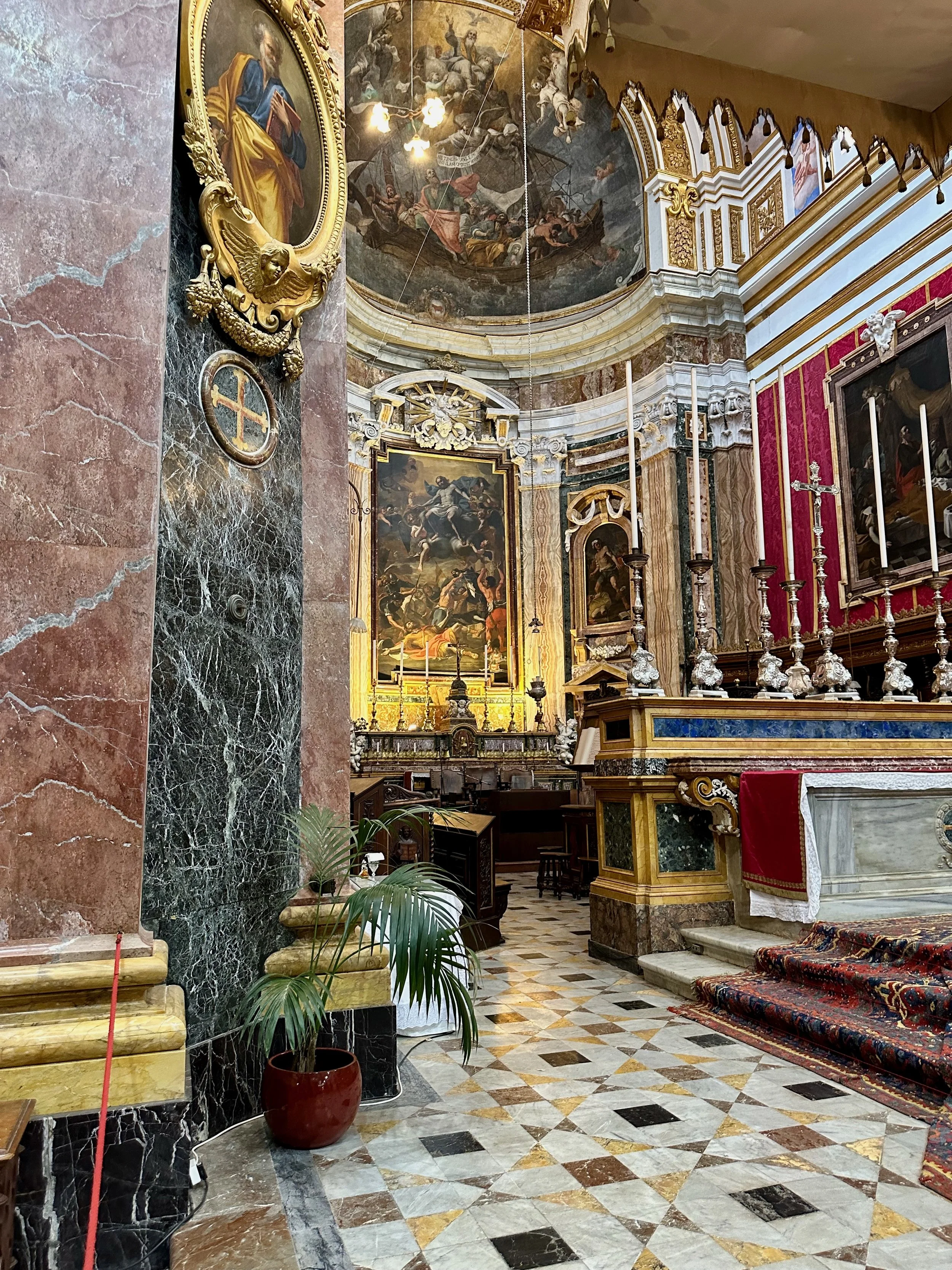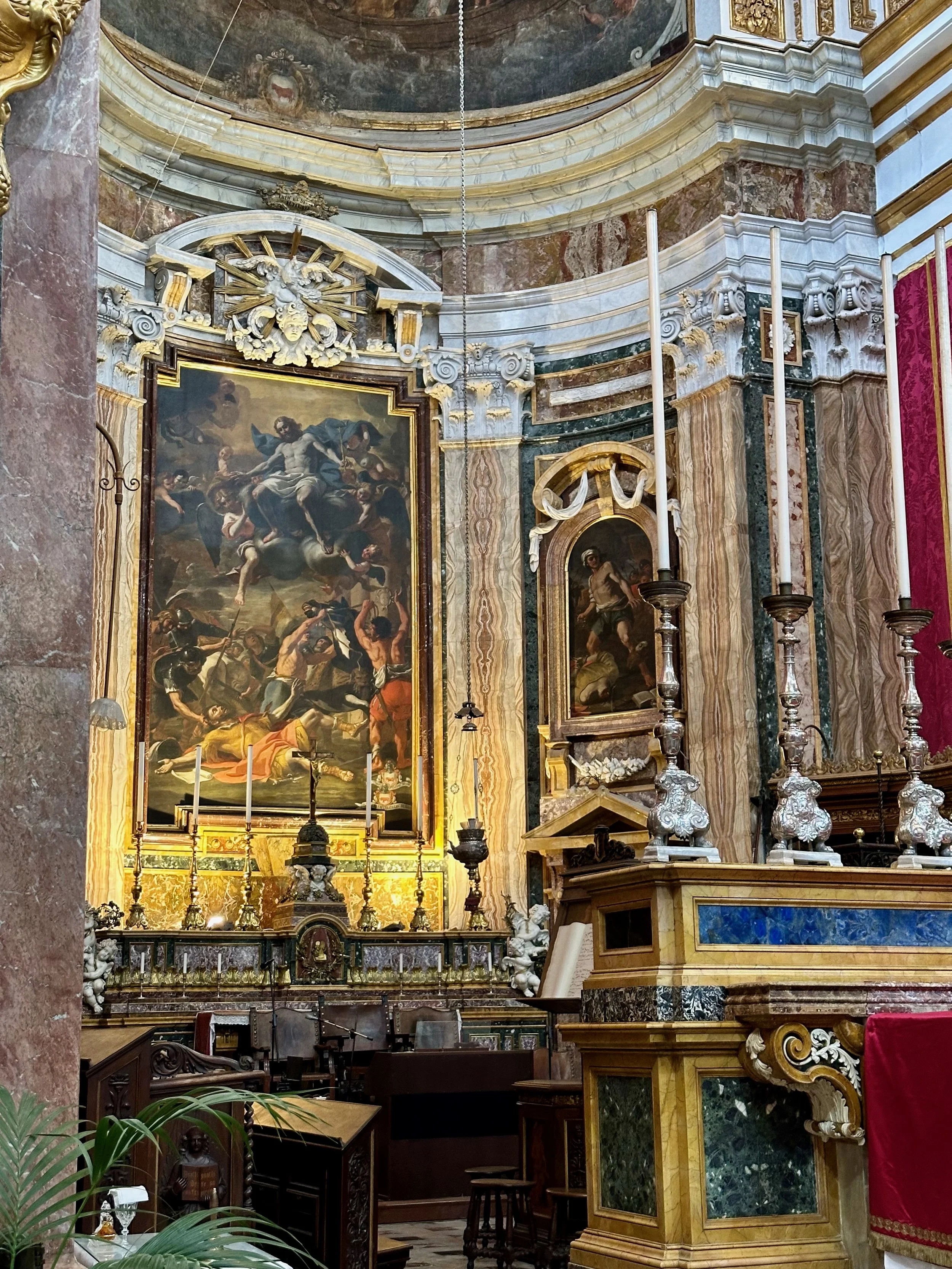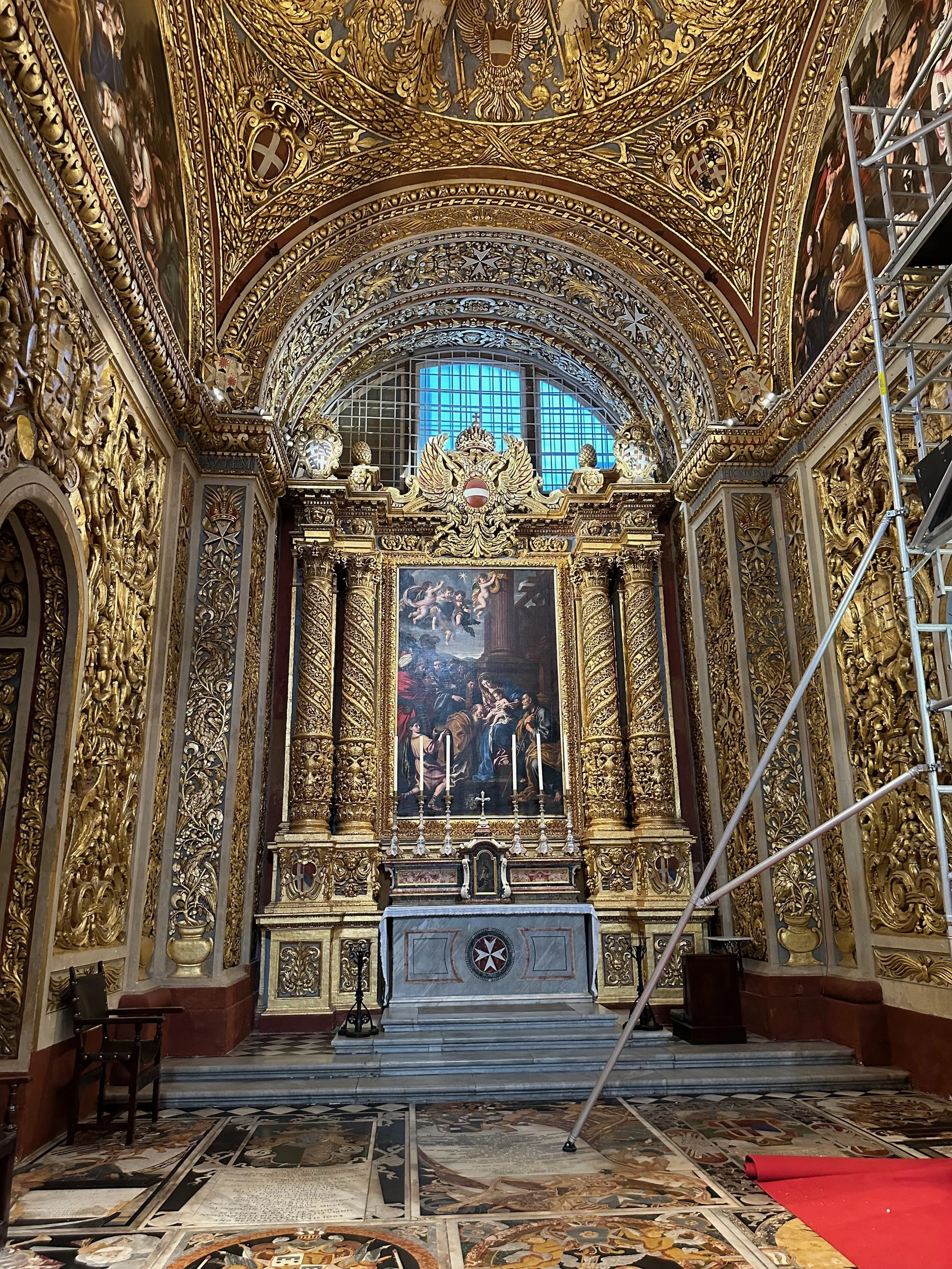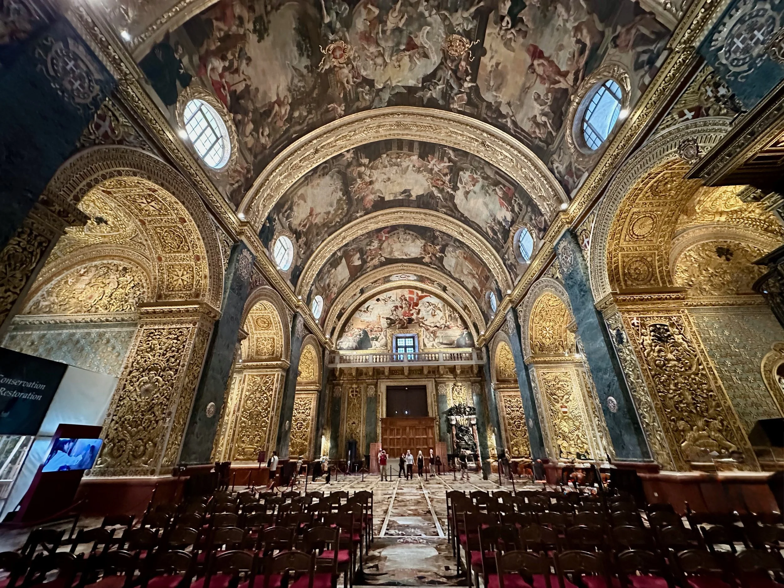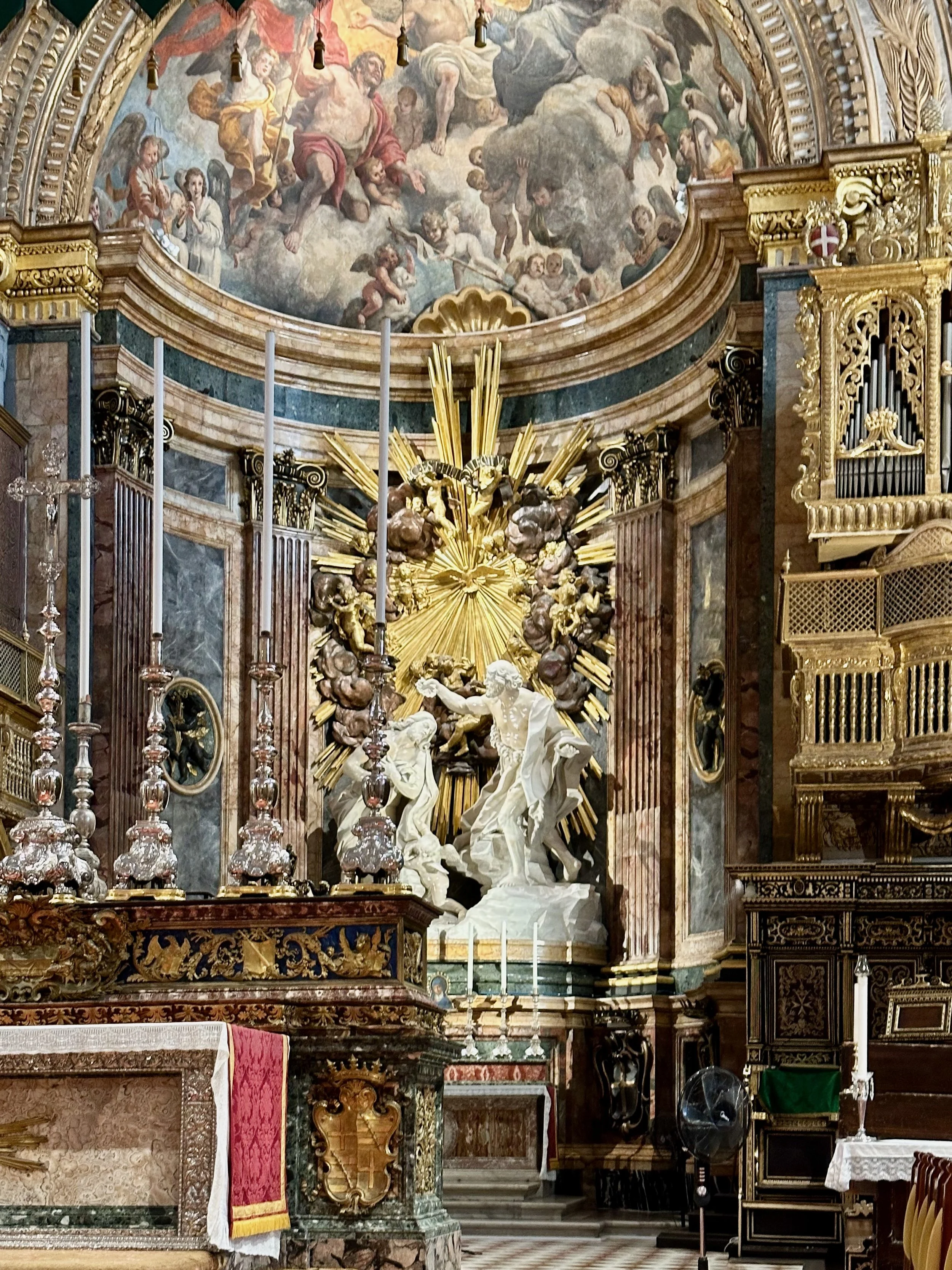 The interior of the cathedral doesn’t have a single unadorned surface. Not the walls, floors or ceiling. If they aren’t covered with intricate carvings gilded in gold, then they are smooth marble or painted with incredible frescos depicting all manner of historical or divine scenes. Even floor space where tomb covers are possible is covered with exquisite hand woven carpet. Certainly the Order of St. John was immensely profitable to be able to afford such a landmark.