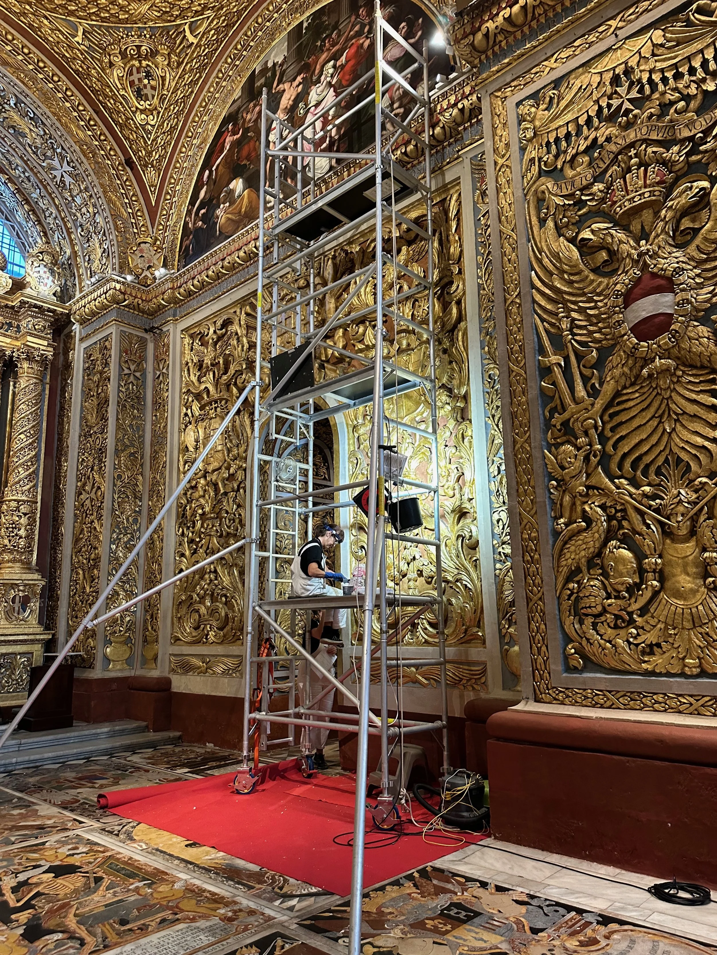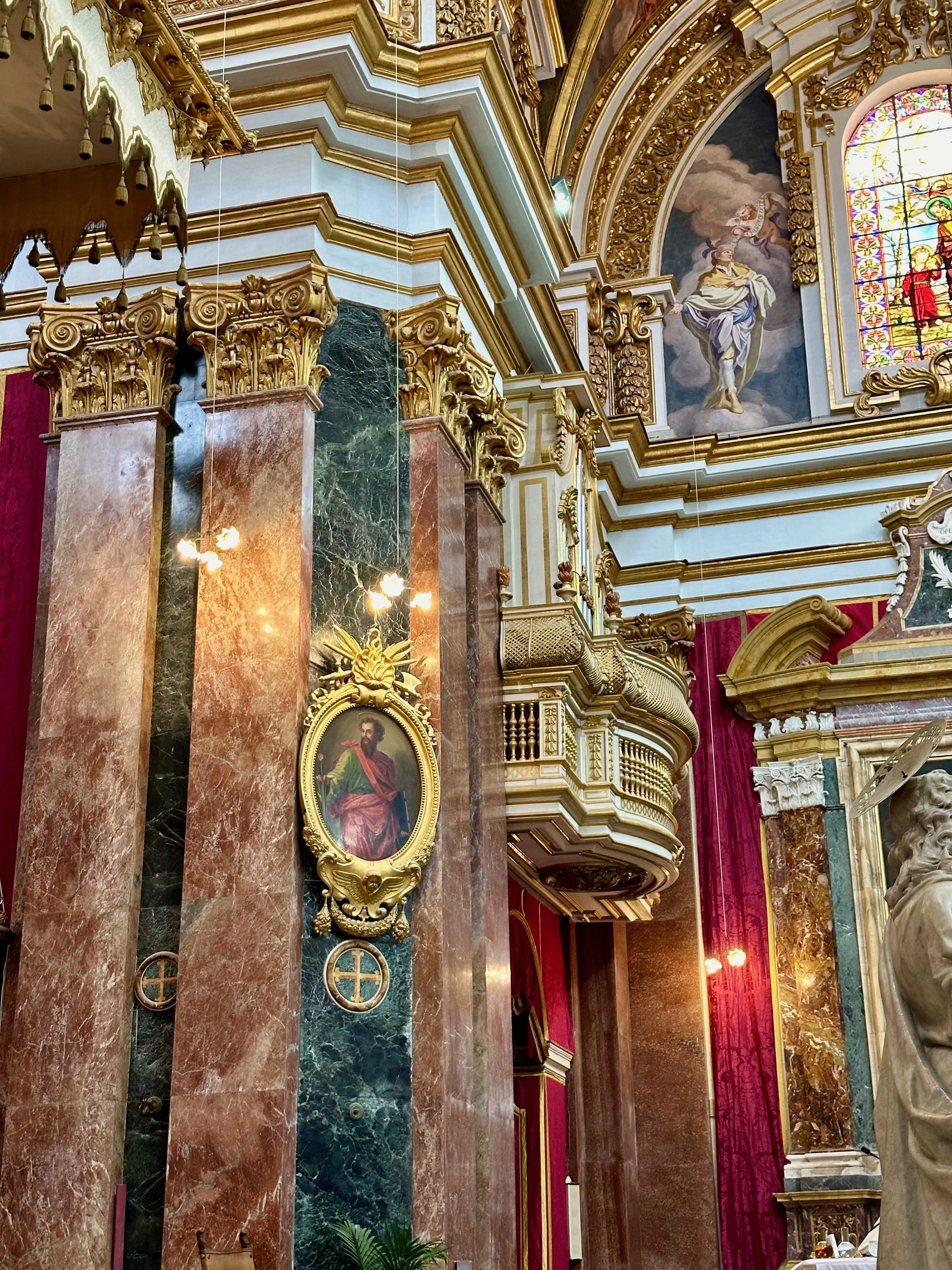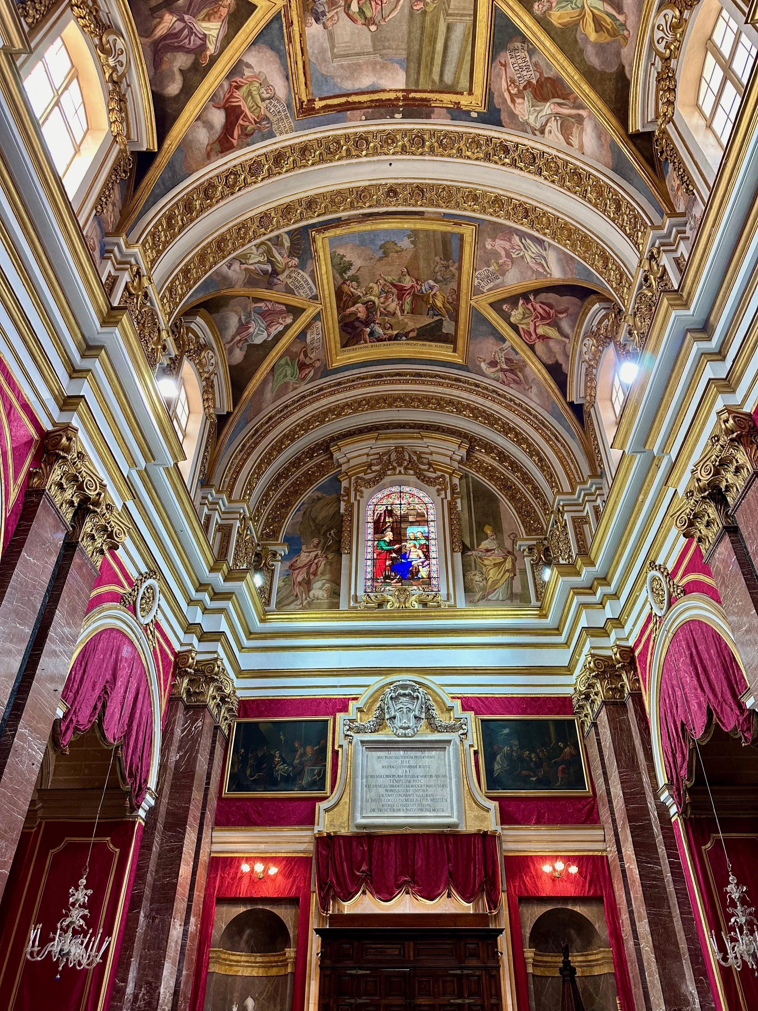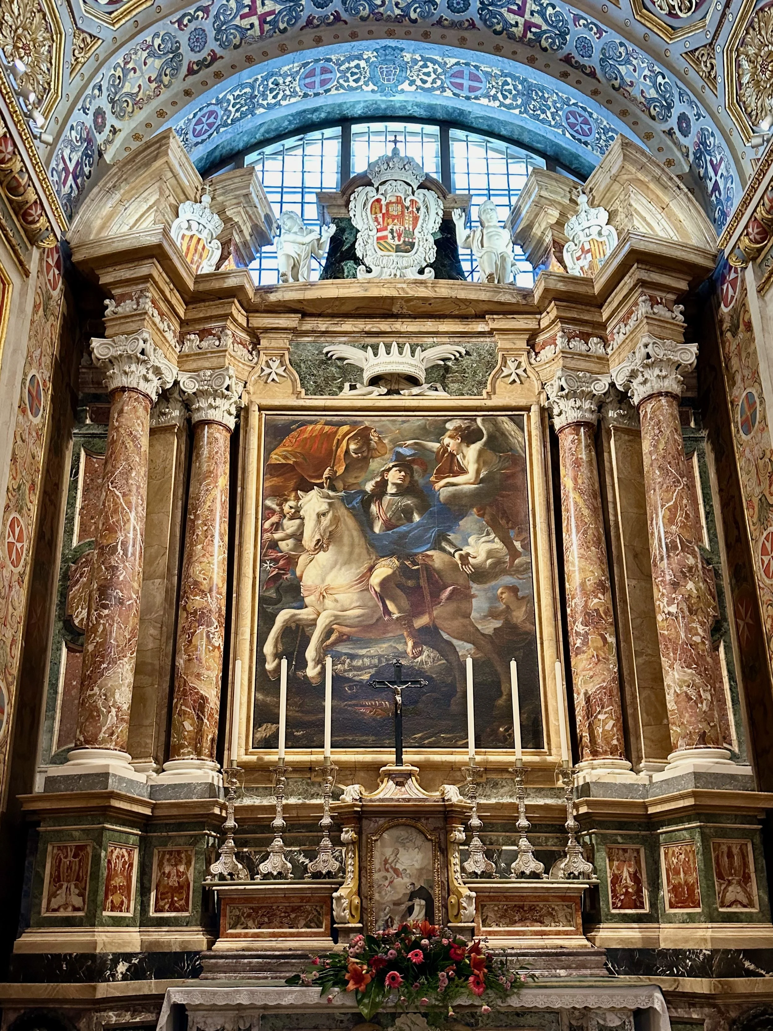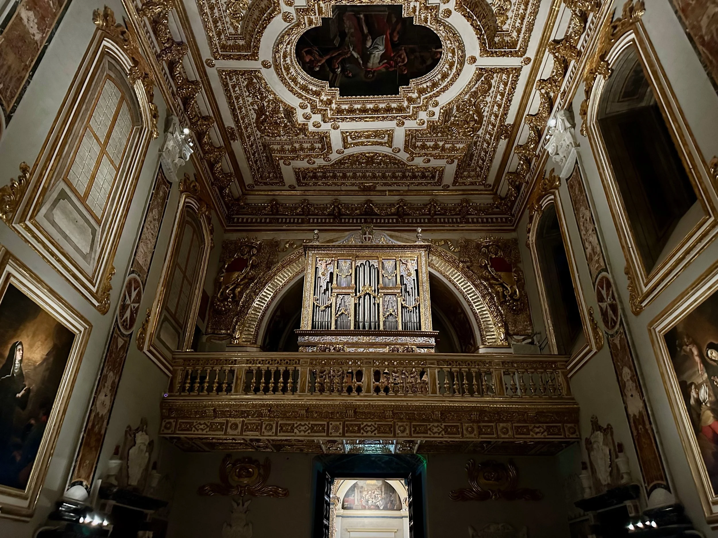 The interior of the cathedral doesn’t have a single unadorned surface. Not the walls, floors or ceiling. If they aren’t covered with intricate carvings gilded in gold, then they are smooth marble or painted with incredible frescos depicting all manner of historical or divine scenes. Even floor space where tomb covers are possible is covered with exquisite hand woven carpet. Certainly the Order of St. John was immensely profitable to be able to afford such a landmark.