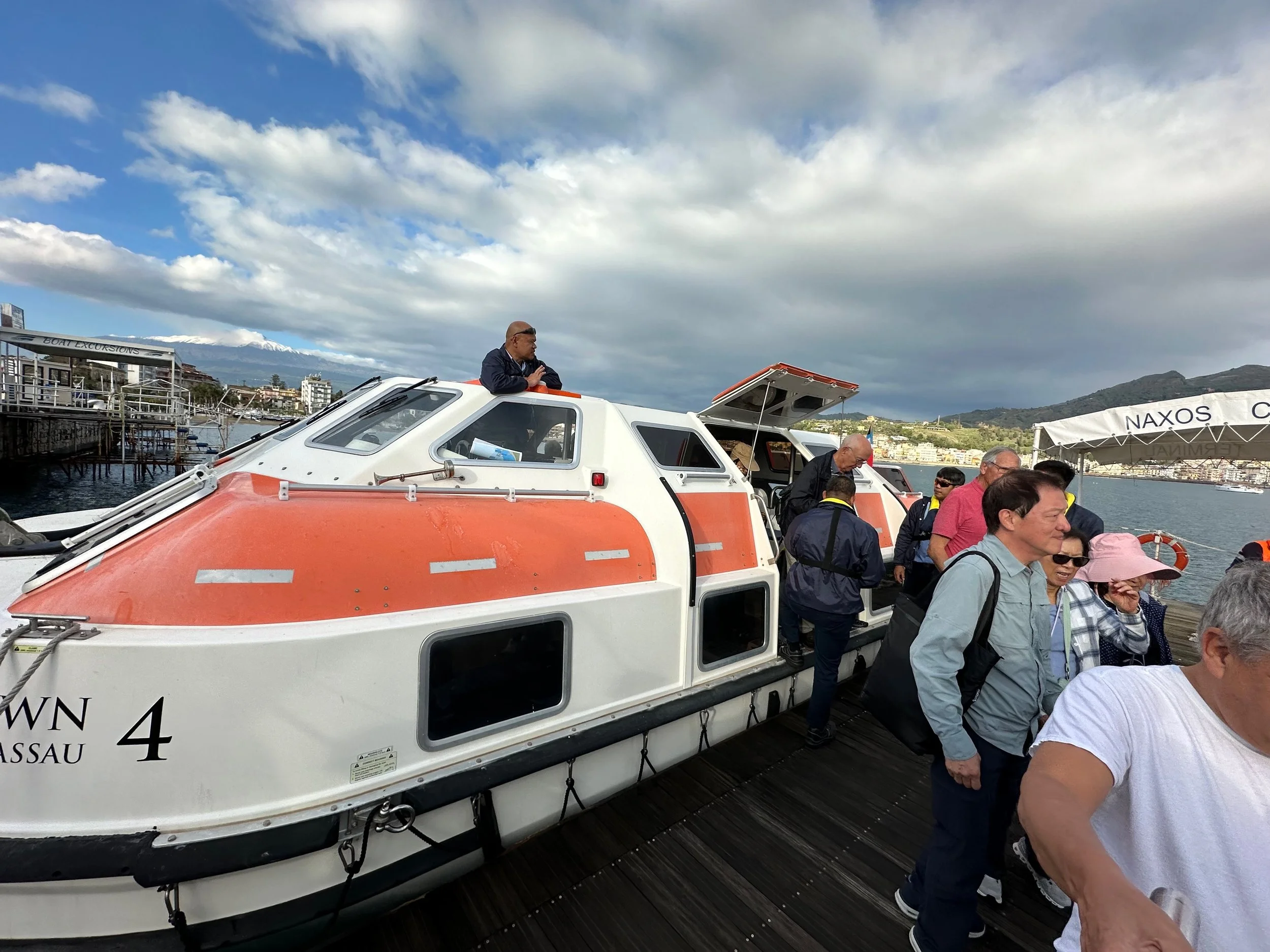 Our arrival on Sicily was at Naxos, the seaside town where we could disembark from the ship. But here, unfortunately, there was no facilities for the ship to dock at. So the the ship had to anchor out in the bay and then transport everyone to shop using the ship’s lifeboats as tenders. Once on shore, we could board the bus for the trip up the mountain to Taormina. Of course the striking thing about this location from the sea was the presence of Mt. Etna, and the steam coming out of its top. At first glance you think it’s clouds, but after magnification one can see the “clouds” coming out of the summit.