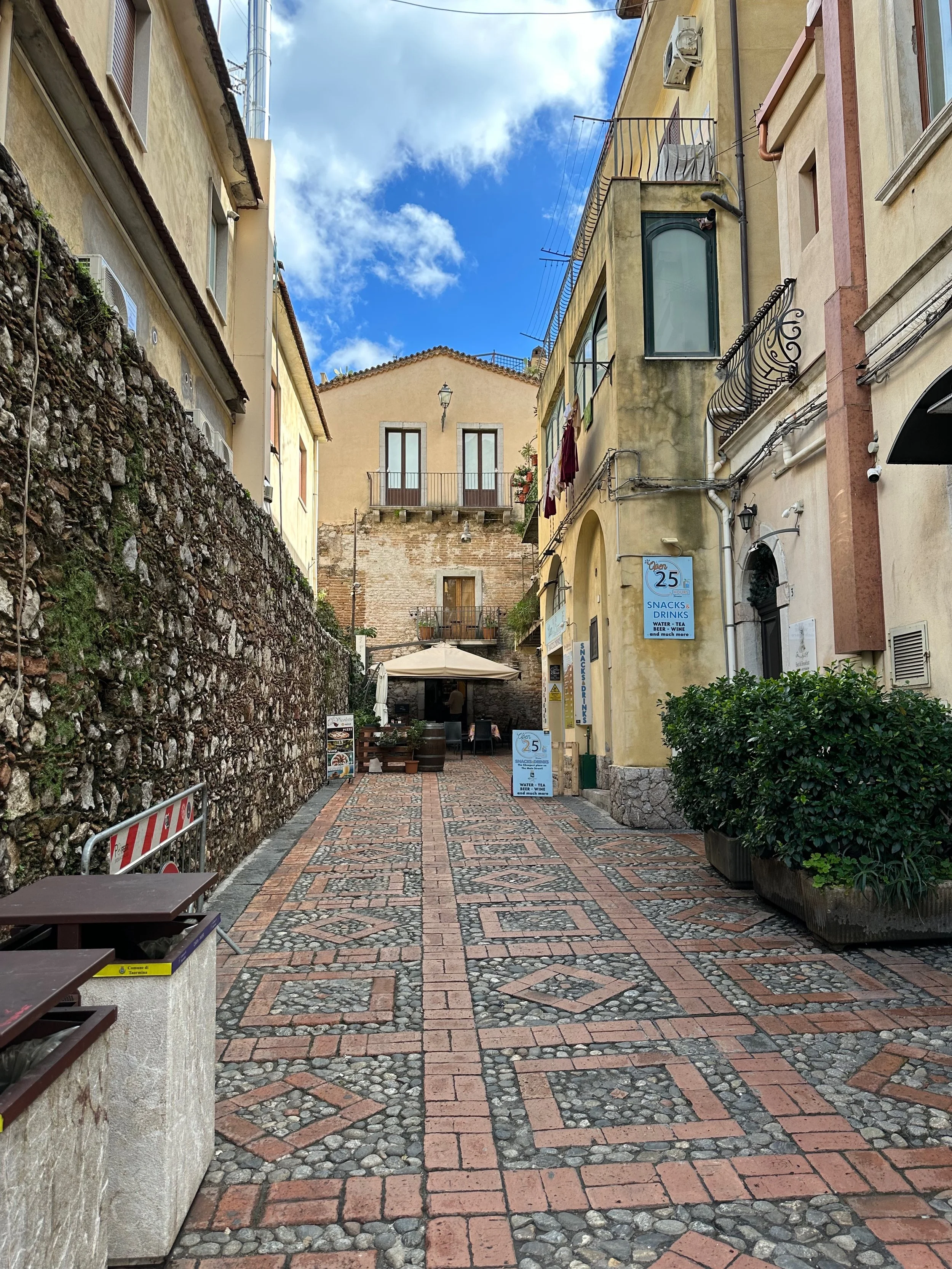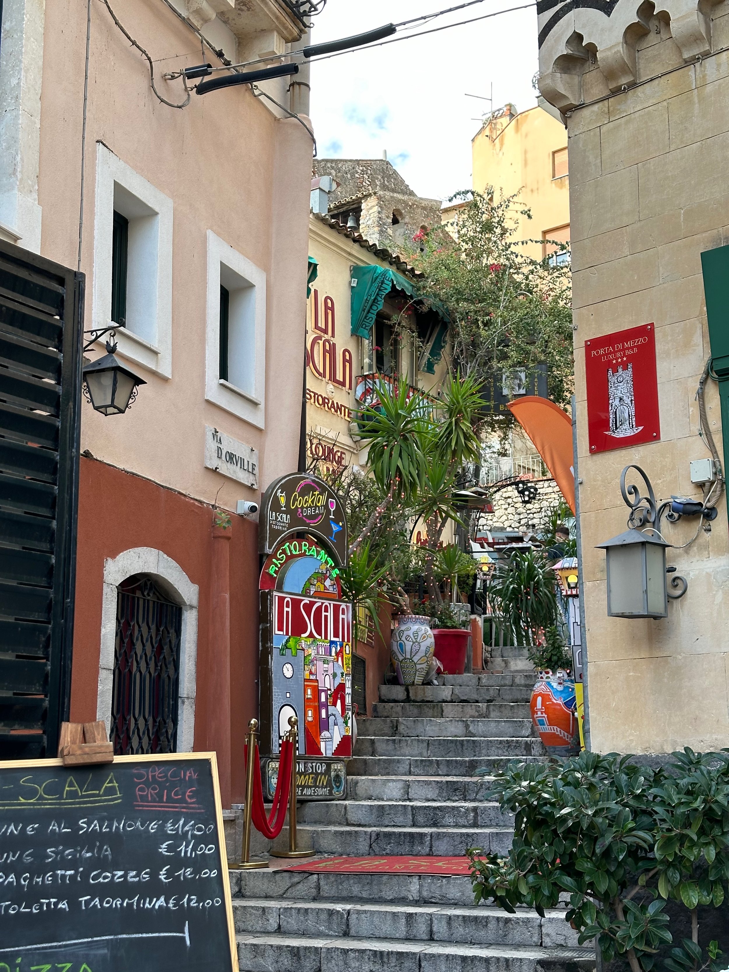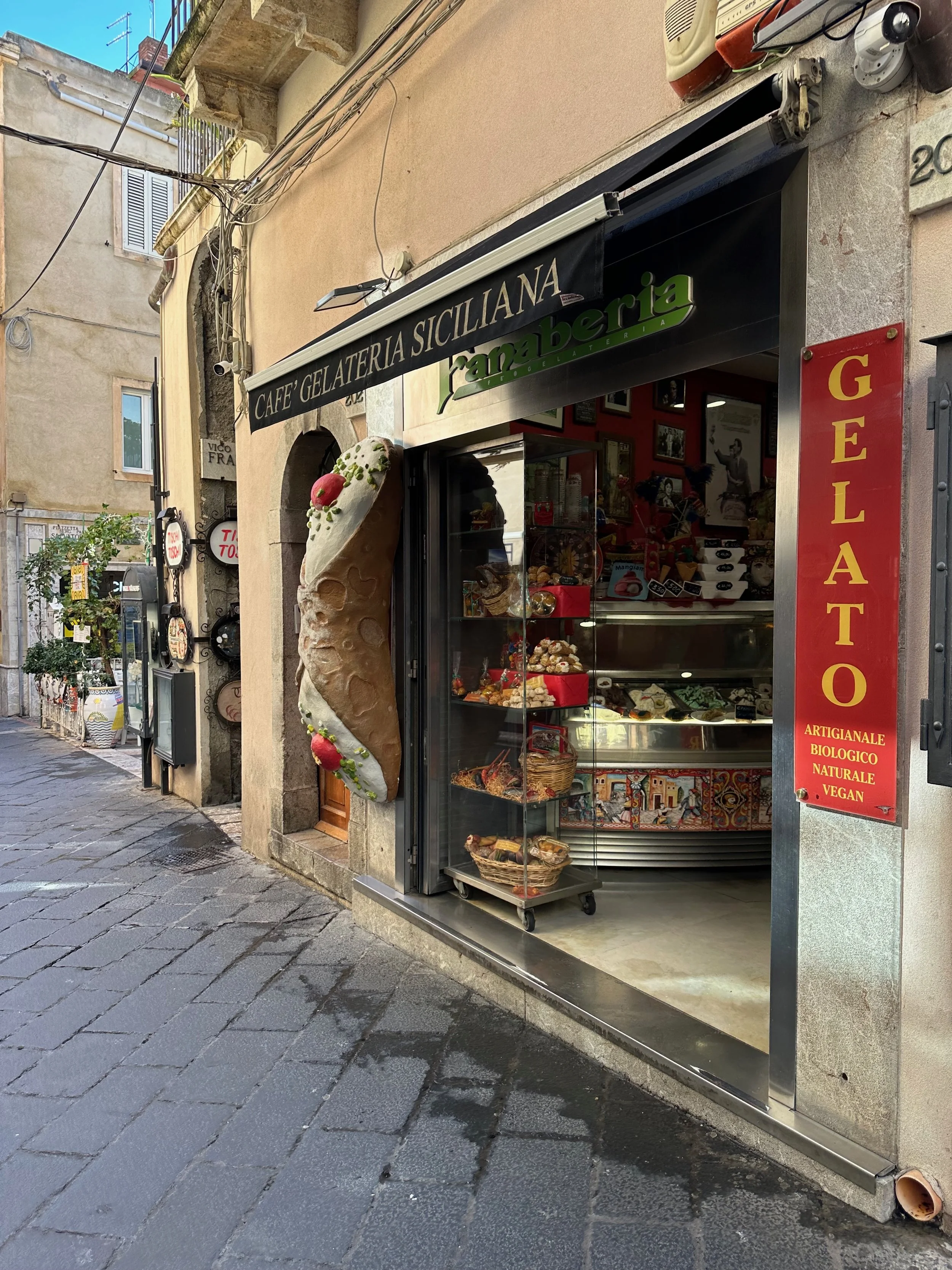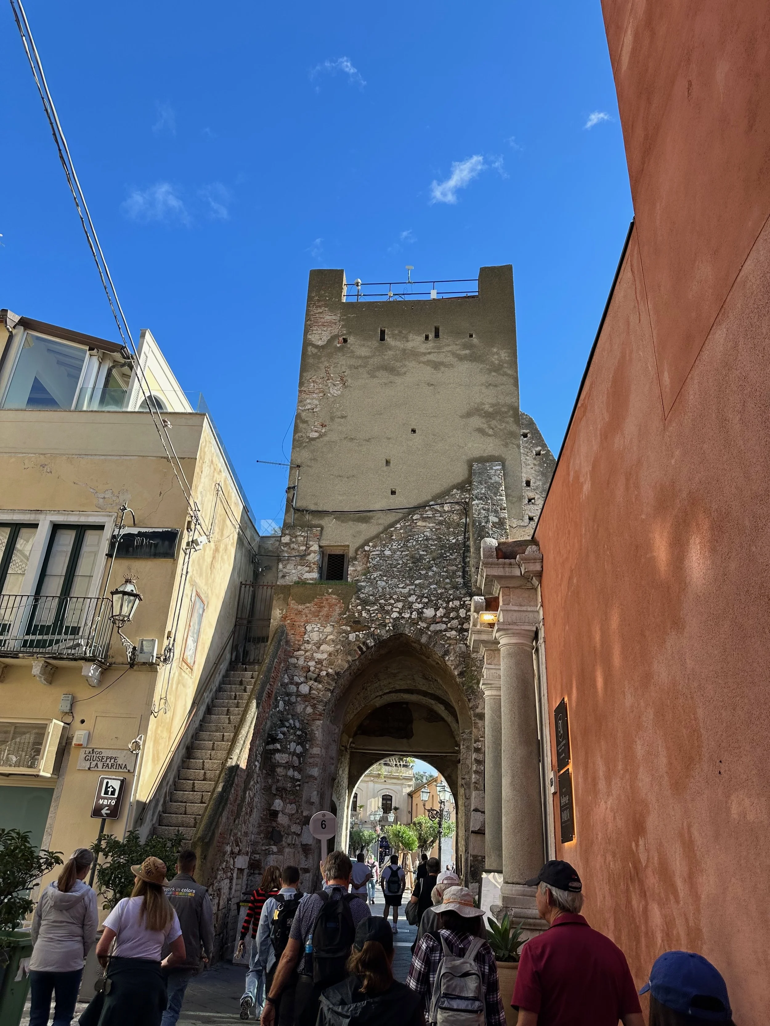 It took about 45 minutes for the bus to wind its way up the mountain through several tunnels to reach the drop off point at a giant parkade. From there we took an elevator up to the street level of Taormina. Once there it was a matter of walking…everywhere. Aside from the amphitheatre at the opposite end of the town, the principal activity here was eating and shopping at the many wonderful independent shops and restaurants. What made these two activities different than elsewhere, was the age and charm of the town. Most, if not all of the buildings are hundreds of years old, with some being very much older than that.