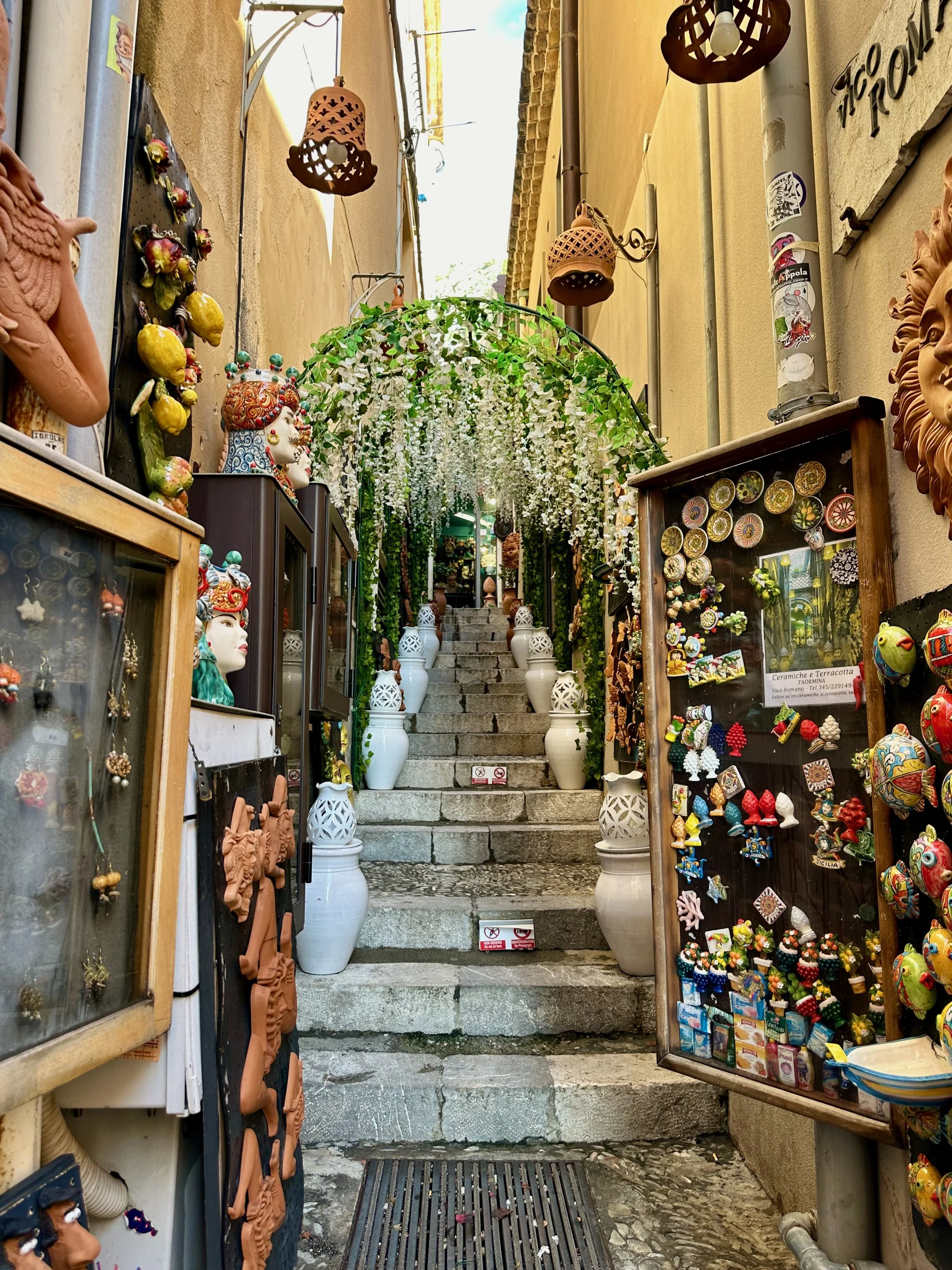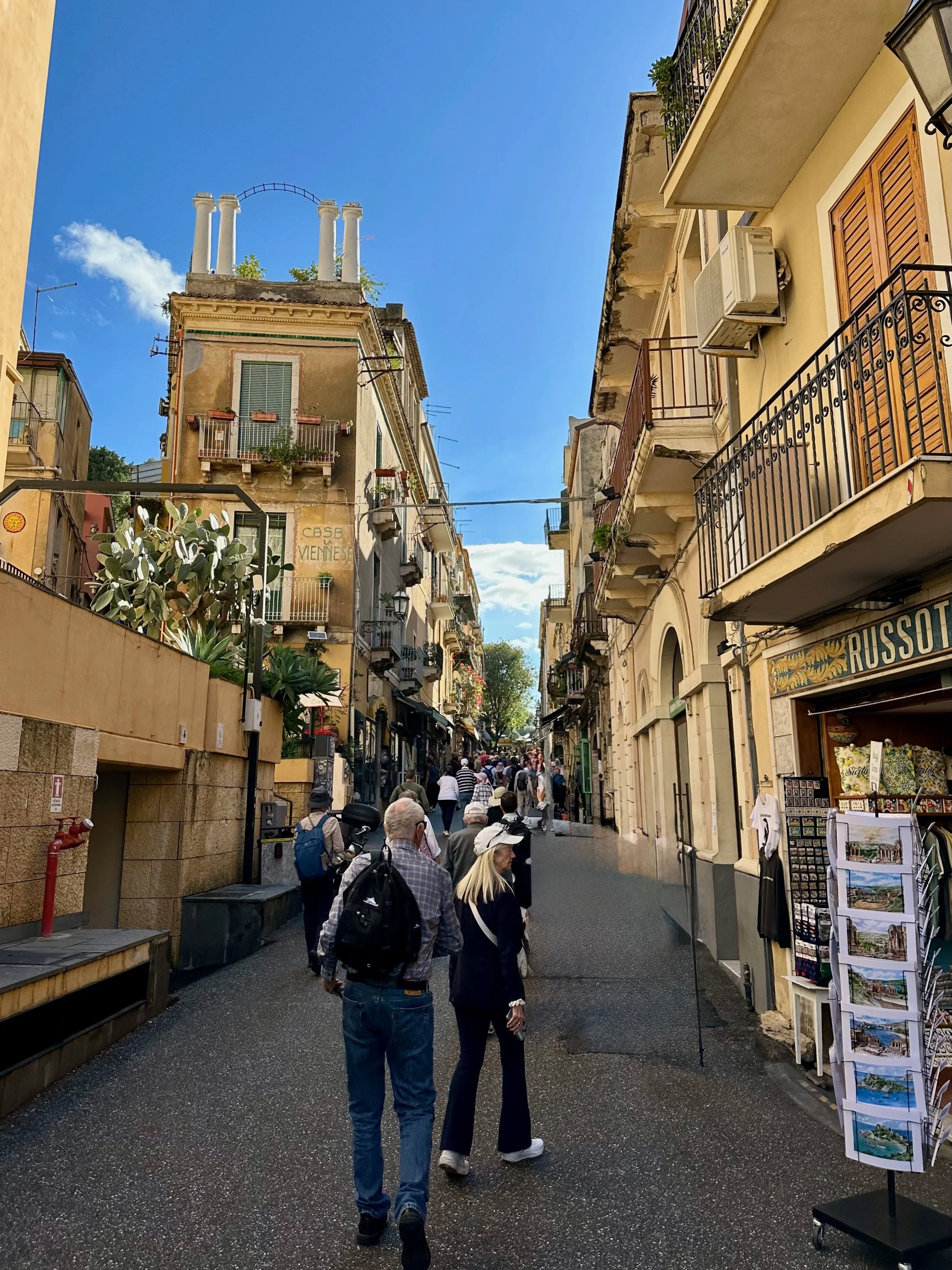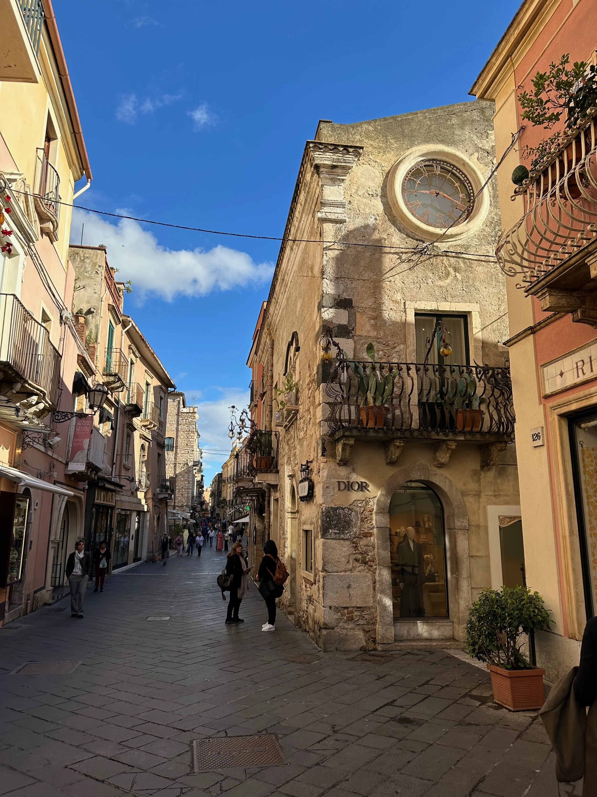 Taormina dates back to its founding in 396 BC on Mt. Taurus after the coastal town of Naxos was destroyed. The Greek amphitheatre was constructed in the 3rd century BC, and then rebuild five centuries later by the Romans in the 2nd century AD. But before we could see the theatre, we had to walk the length of the town past all those temping shops.