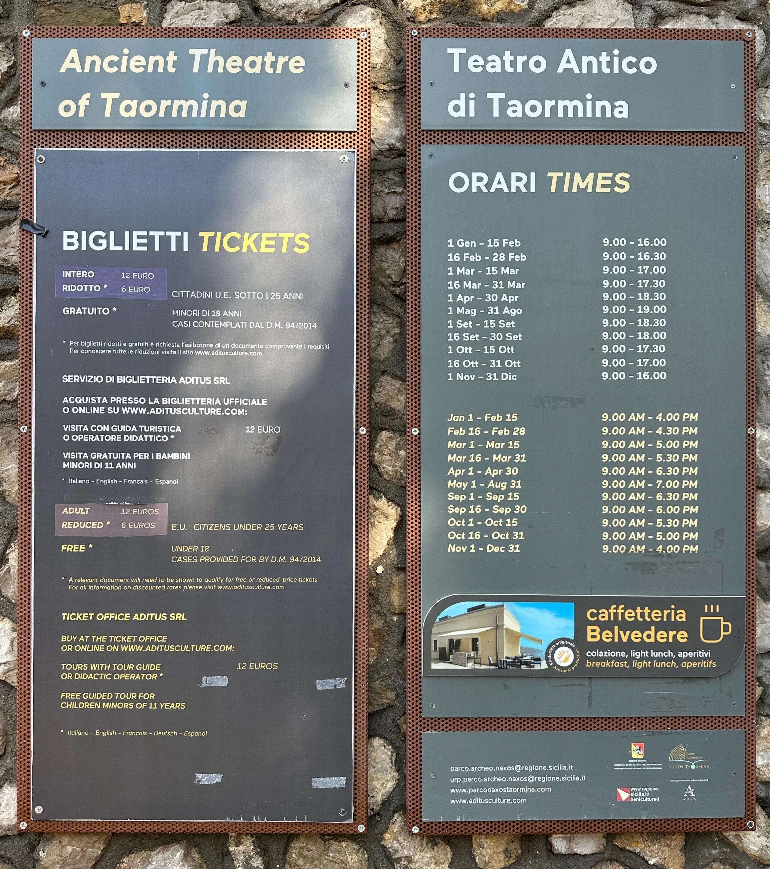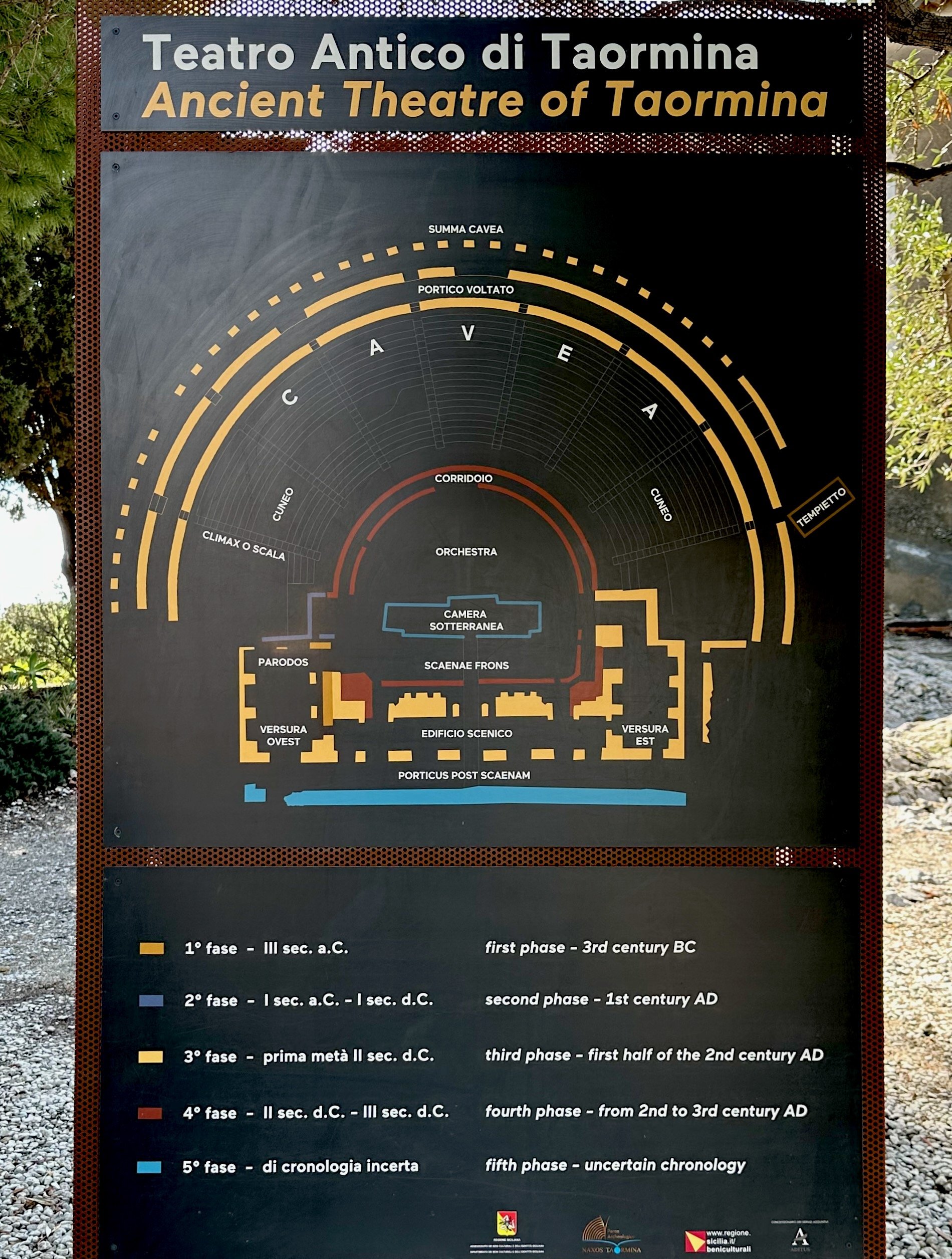 “Built in a dominating position overlooking the town, its cavea (semicircular tiered seating) has a diameter of 109 metres. With the exception of that of Syracuse, it’s the largest ancient theatre not only in Sicily, but in the Italian peninsula and North Africa. Its original plan is thought to date back to the 3rd century BC. This earliest phase is documented by the remains of a wall built of isodomic blocks, incorporated into the scaena and by stone seats with inscriptions from the cavea. What is visible of the theatre today belongs entirely to the Roman reconstruction, more particularly that completed under Trajan or Hadrian in the first half of the 2nd century AD.”