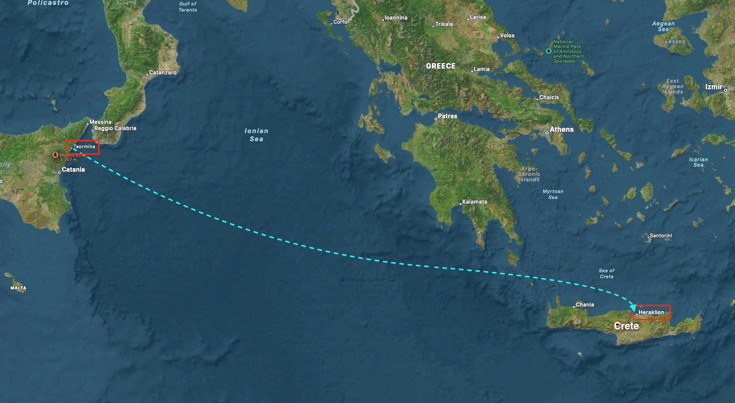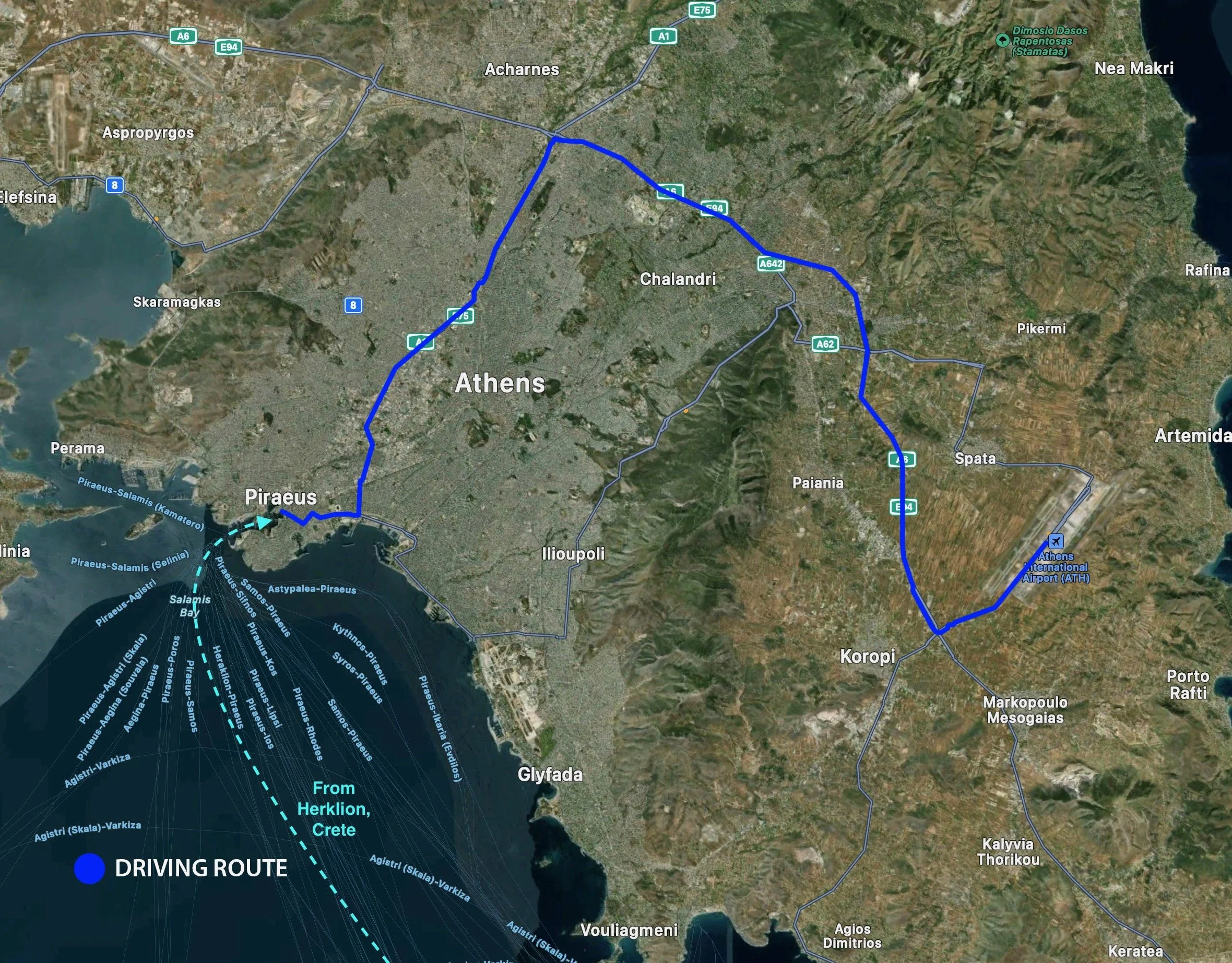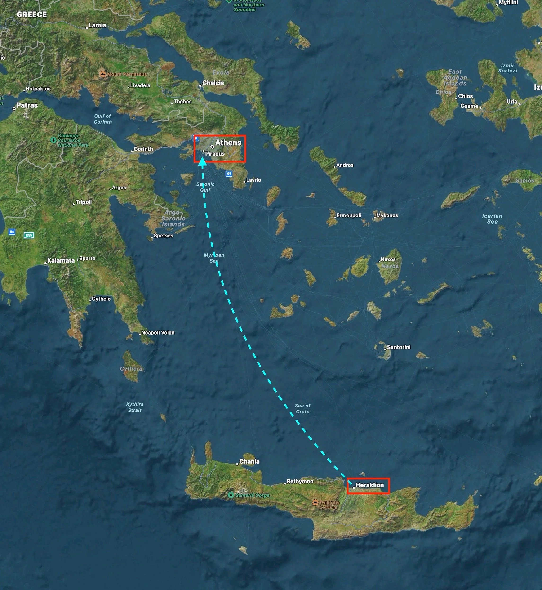 Our route from Crete to Athens.