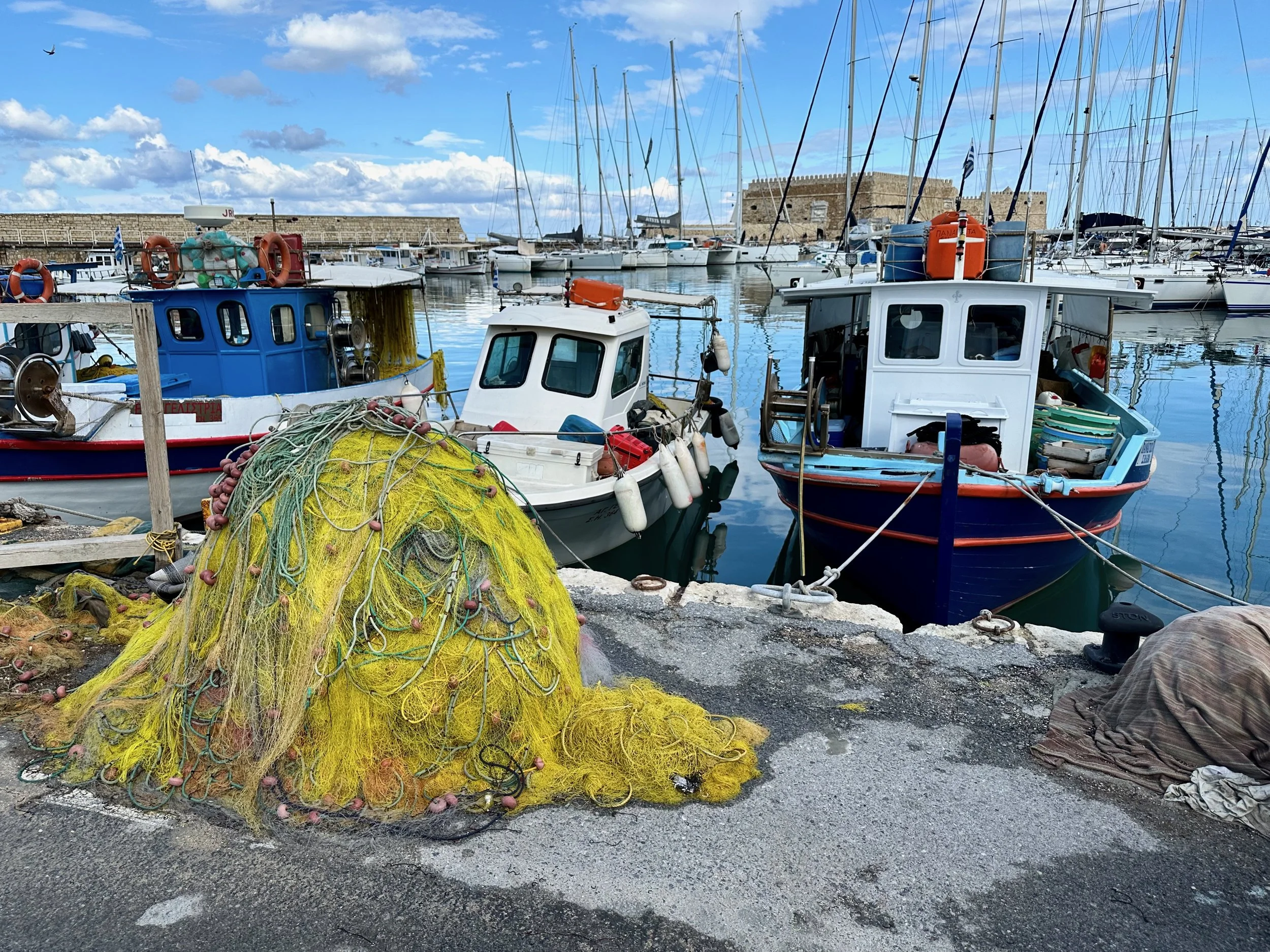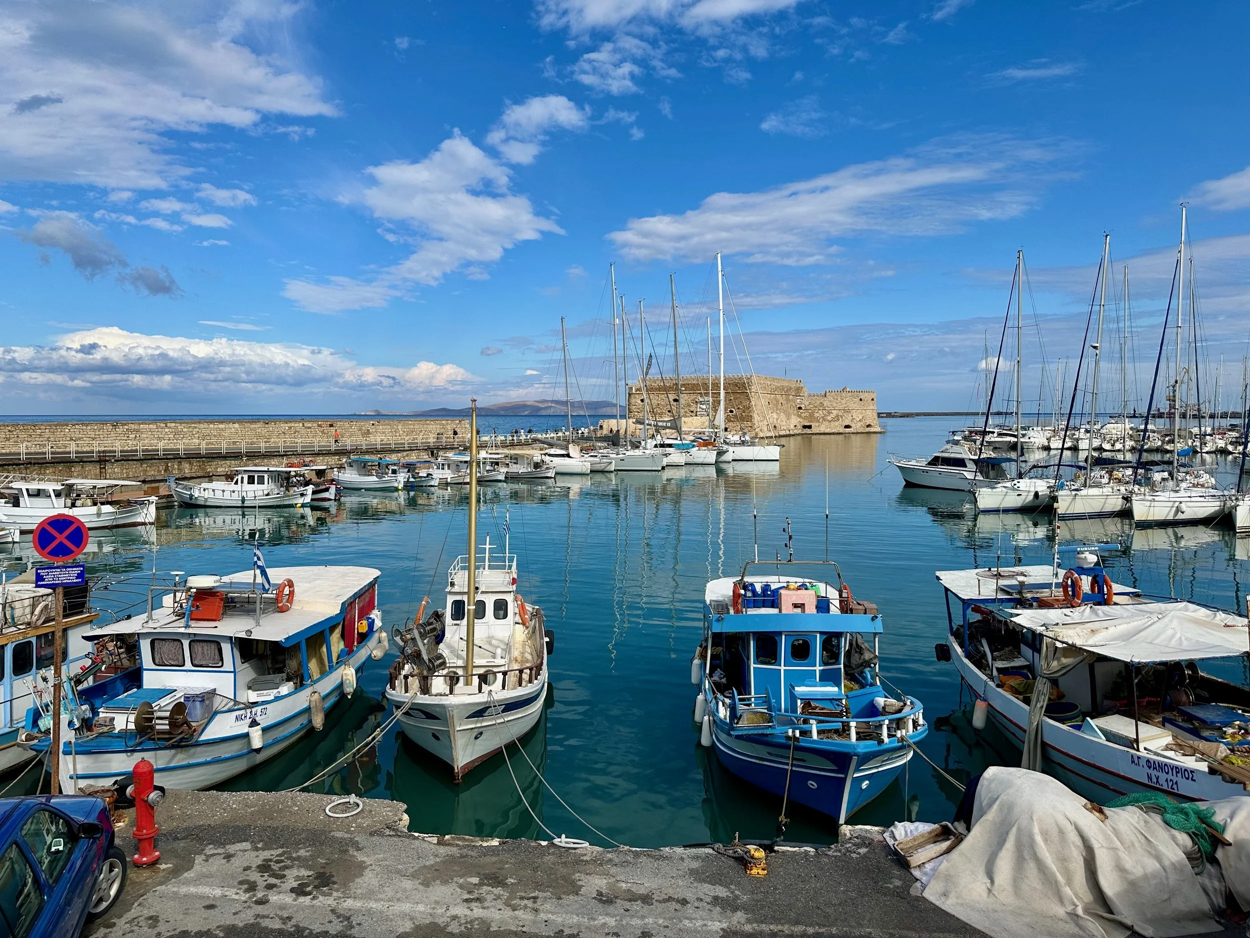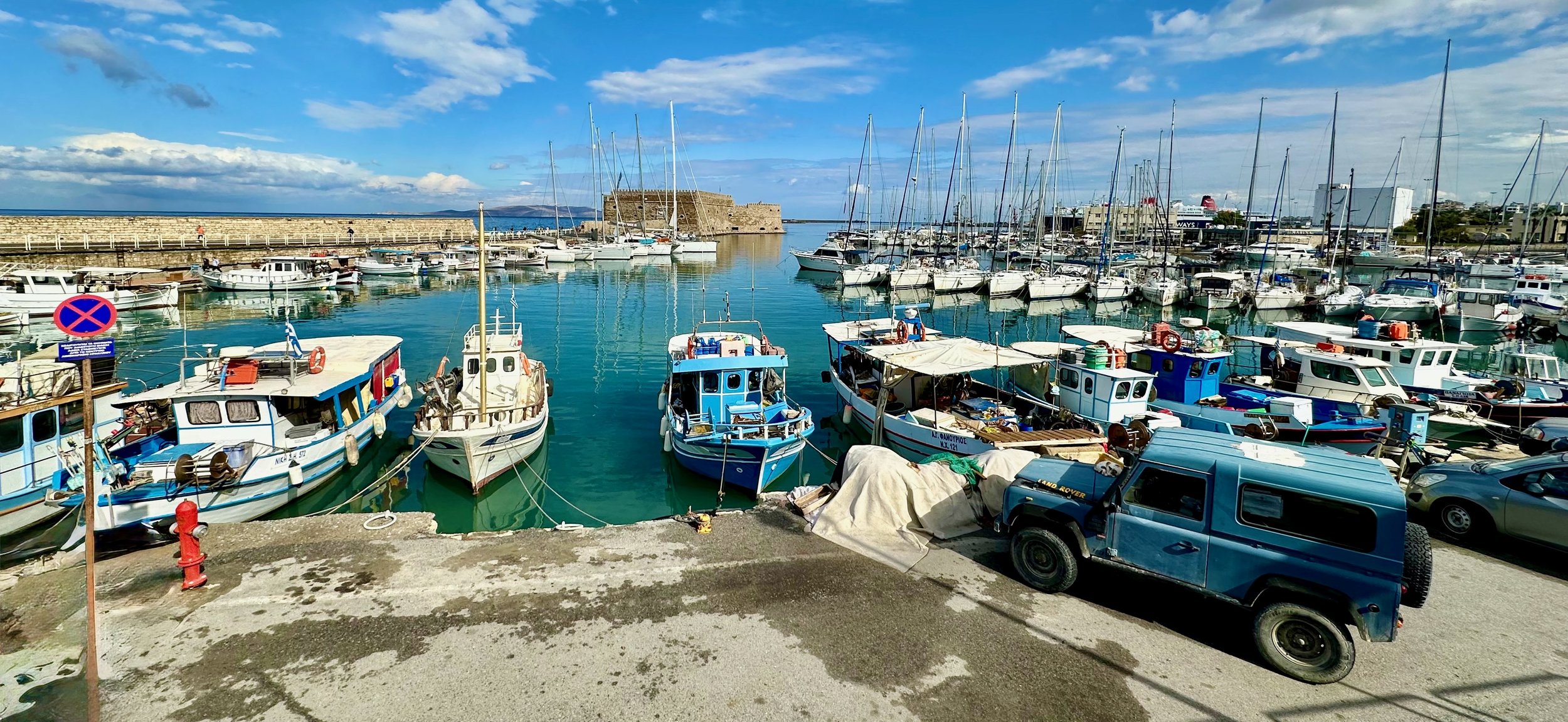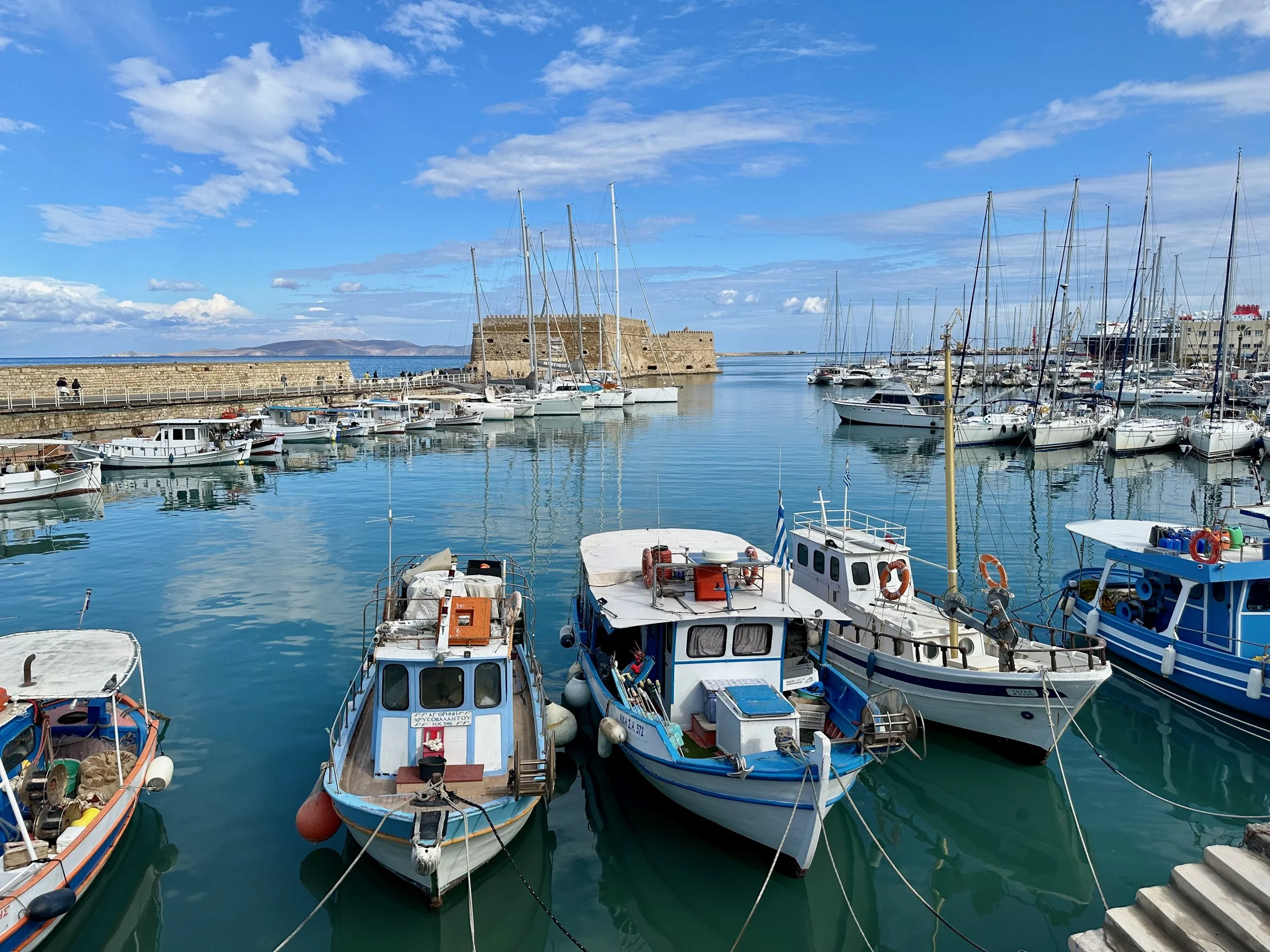 Fortunately for us, not long after catching the shuttle bus into the centre of town, the clouds started to part and within an hour sun broke through for the rest of our stay. Missing the formal excursion never really bothered us as by this time we were getting weary. A relaxed stroll through the town, and a nice walk back to the ship via the harbour road was a perfect way to spend time in Heraklion. Being from a harbour city ourselves, we felt right at home here.