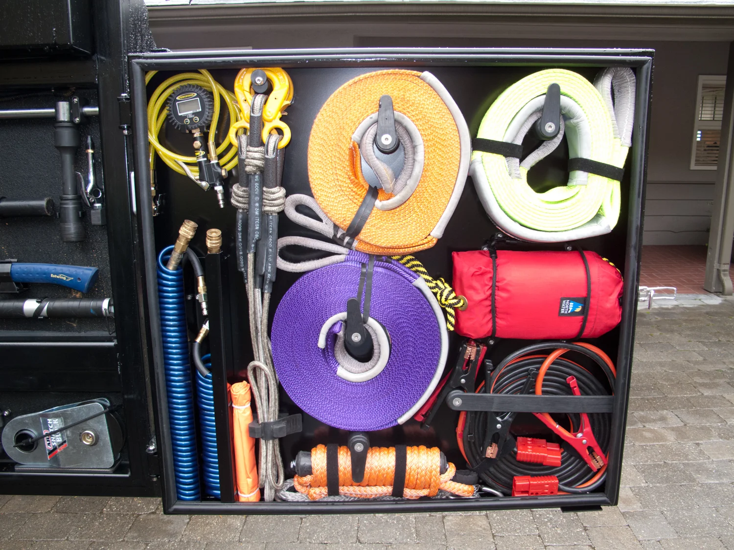 The straps, air hoses, pressure gauges, recovery straps, throw rope and jumper cables are all stored in the closure pan.