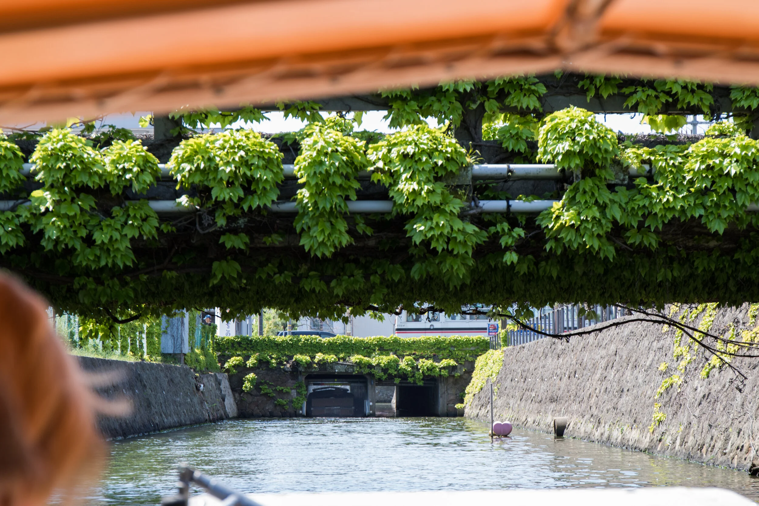 The little vessels that we traveled around the canal system in held eight passengers and the boat’s operator. He sat at the back and operated the outboard motor, as well as the roof. Yes, the roof. This cruise was similar to our Seine river cruise in that many bridges over the canal were too low, and the boat had to lower its roof in order to pass underneath.